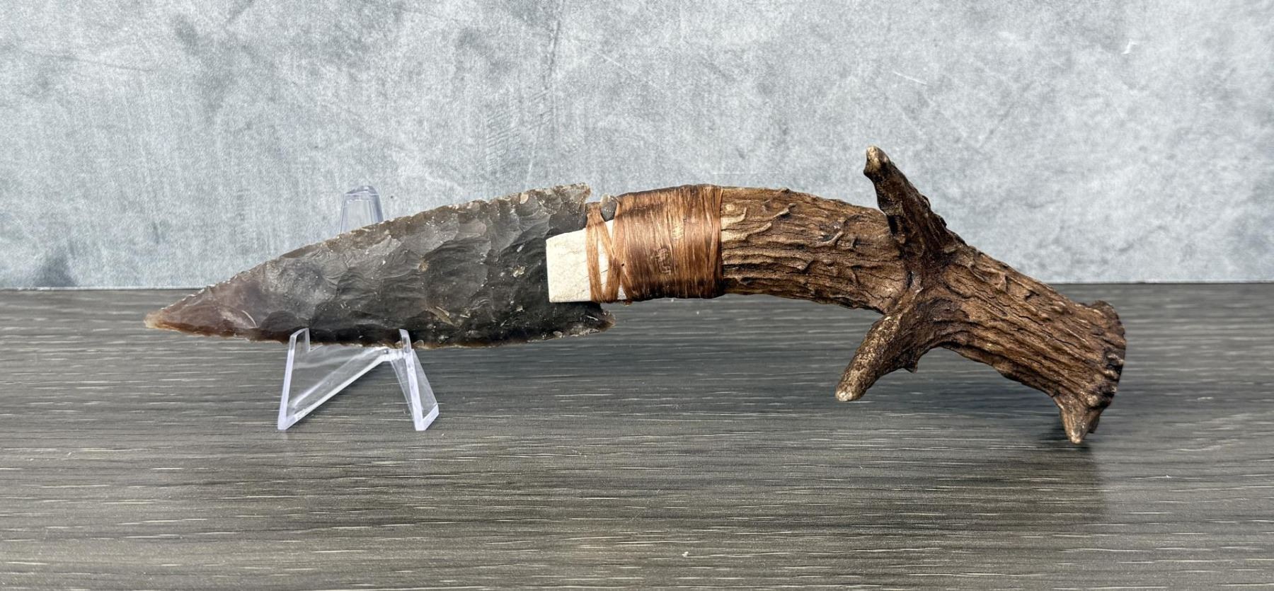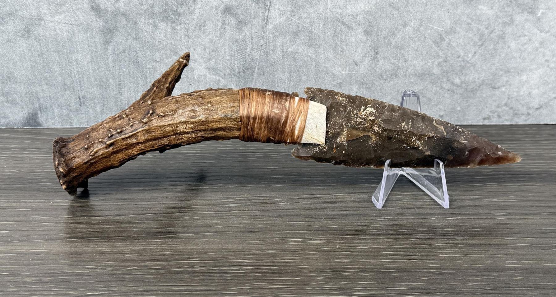 Handmade by Bo Earls. Bo is one of the finest modern flint and obsidian knappers. His knives are some of the nicest money can buy. The handle is whitetail deer horn. 9 5/8" long.