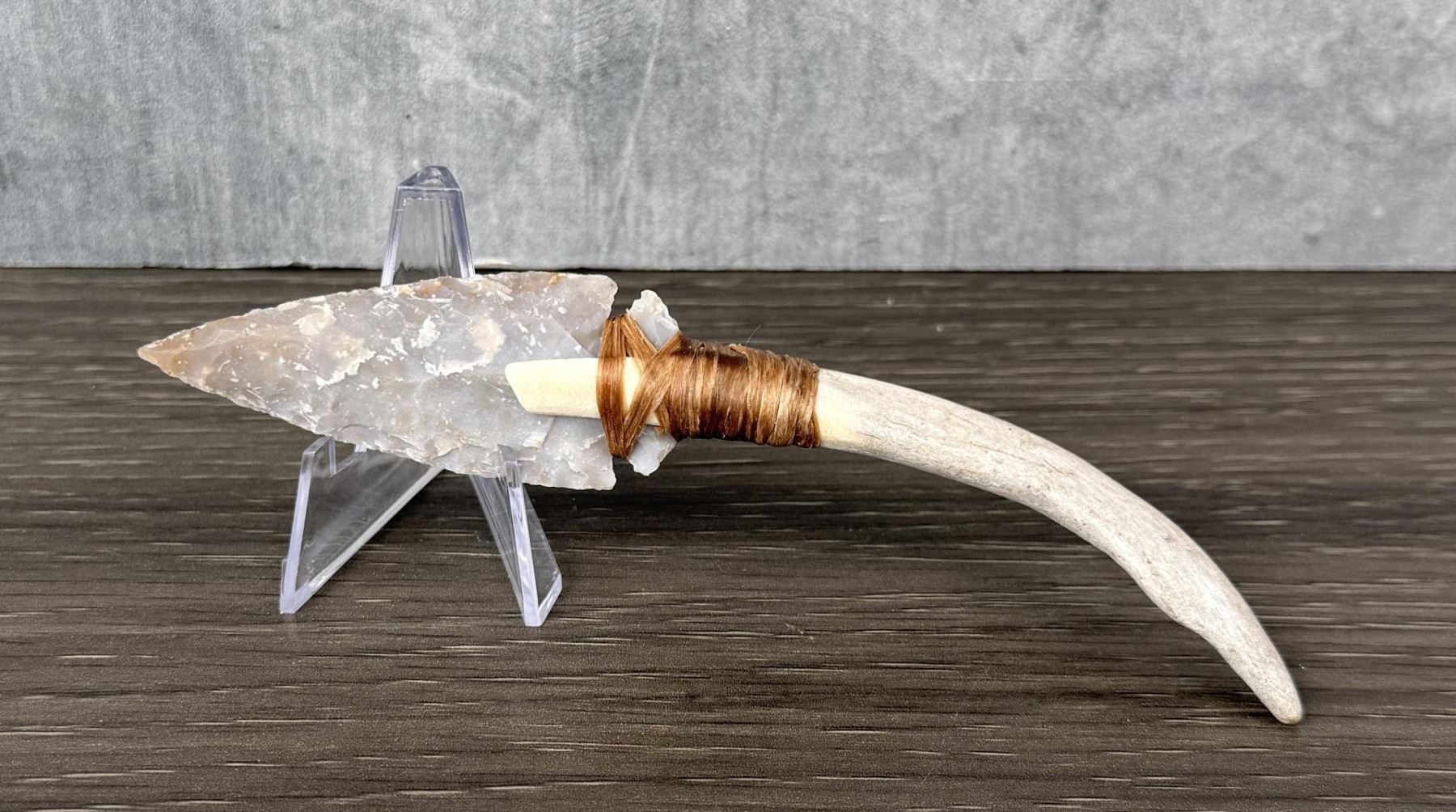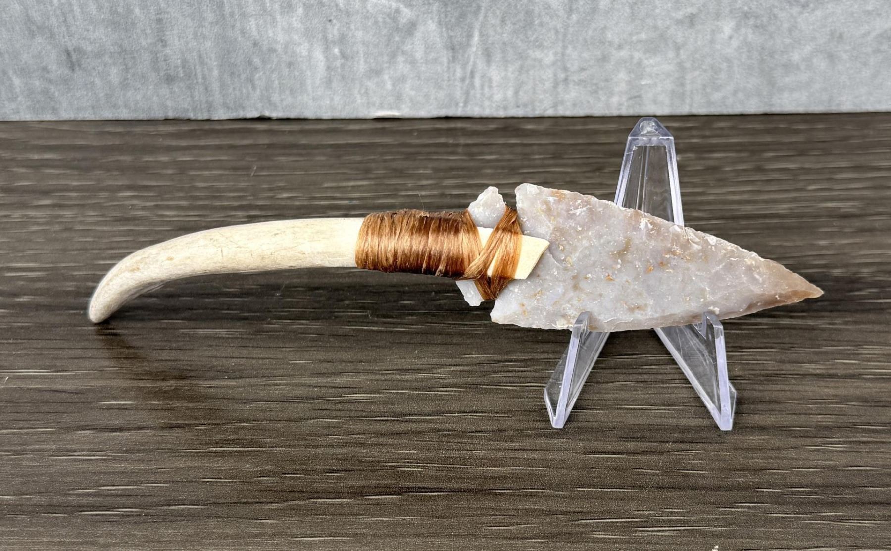 Handmade by Bo Earls. Bo is one of the finest modern flint and obsidian knappers. His knives are some of the nicest money can buy. The handle is whitetail deer horn. 6 5/8" long.