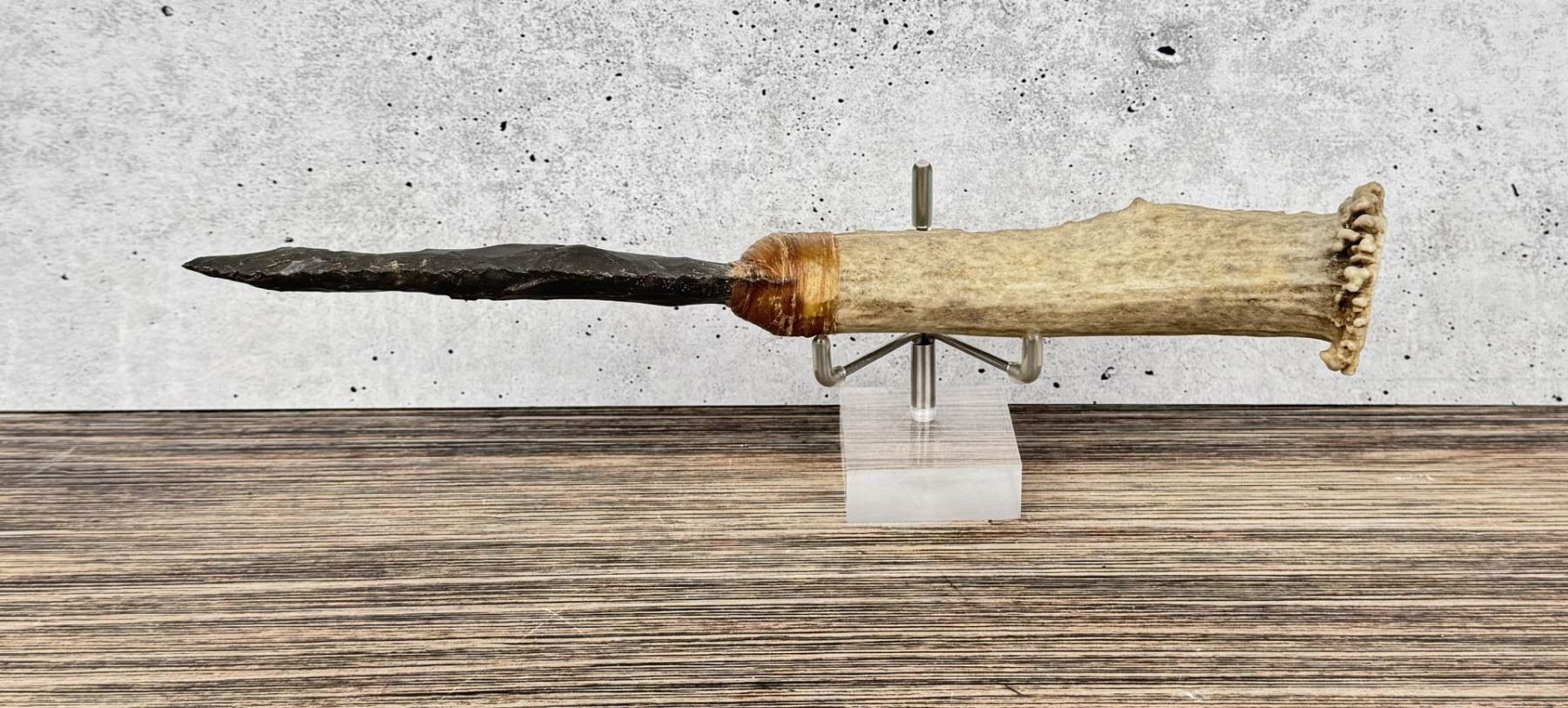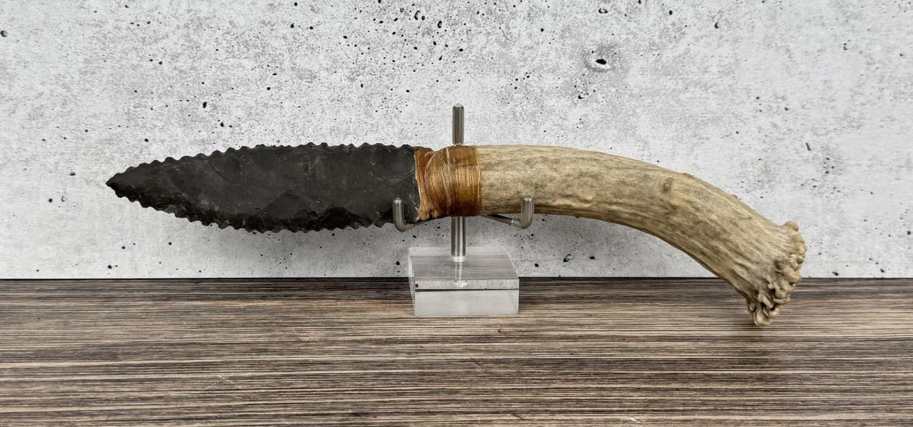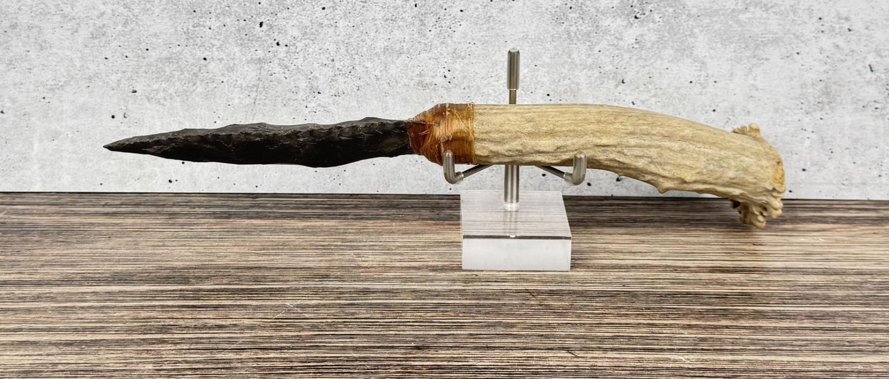 Handmade by Bo Earls. Bo is one of the finest modern flint and obsidian knappers. His knives are some of the nicest money can buy. The handle is whitetail deer horn. 10 1/4" long.