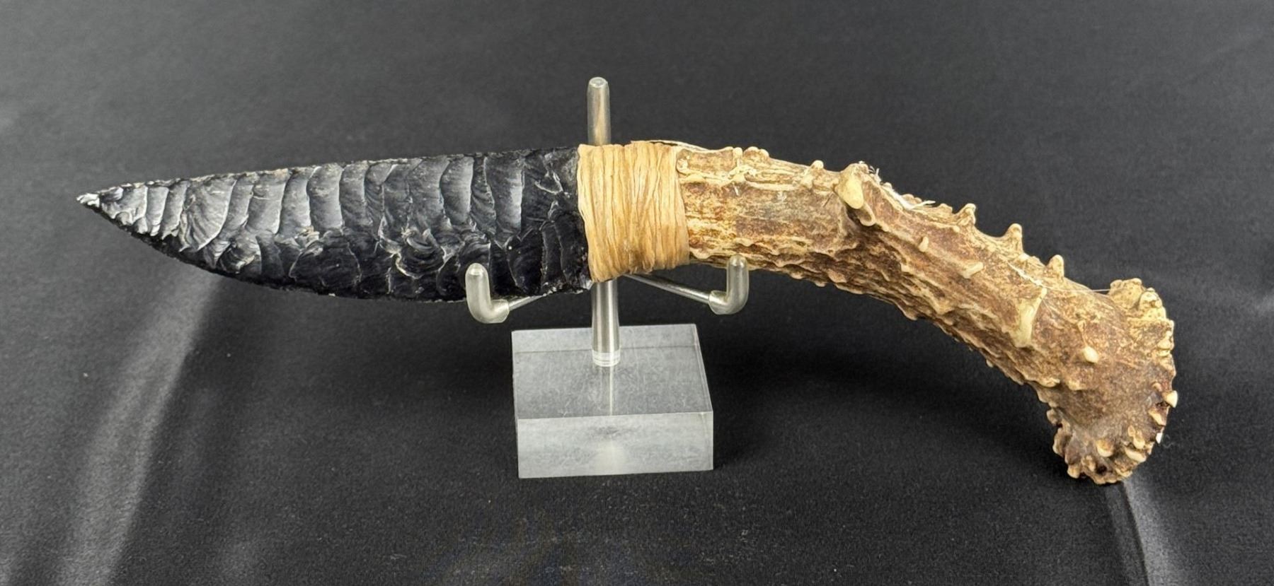 Handmade by Bo Earls. Bo is one of the finest modern flint and obsidian knappers. His knives are some of the nicest money can buy. The handle is whitetail deer horn. 8 3/4" long