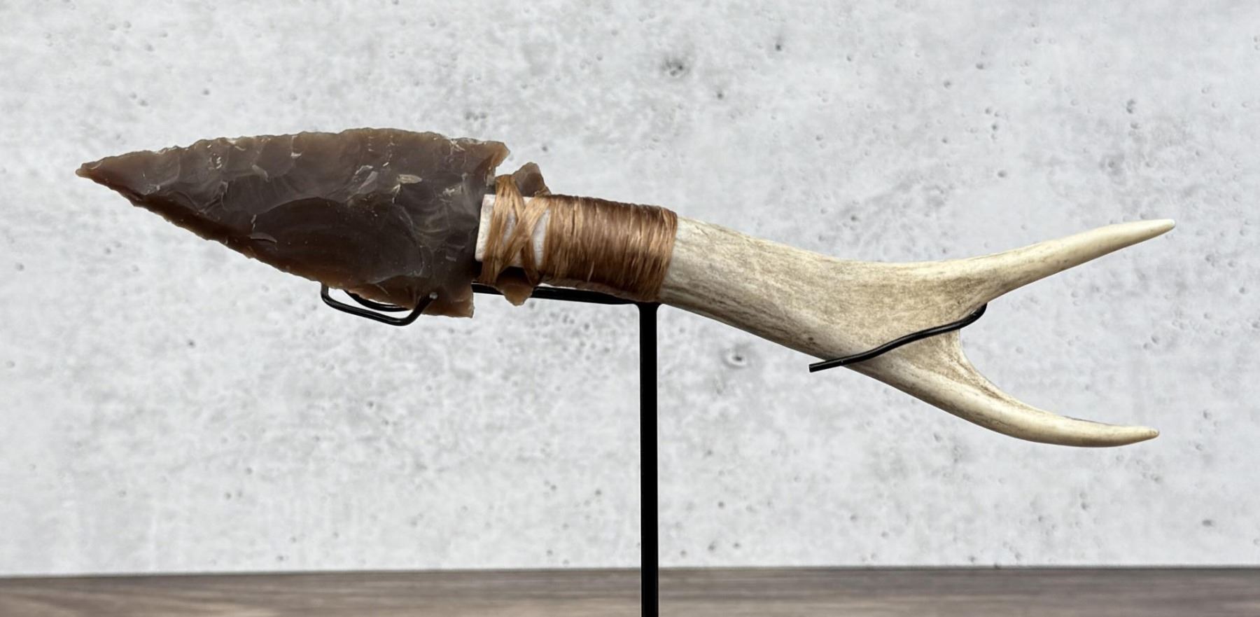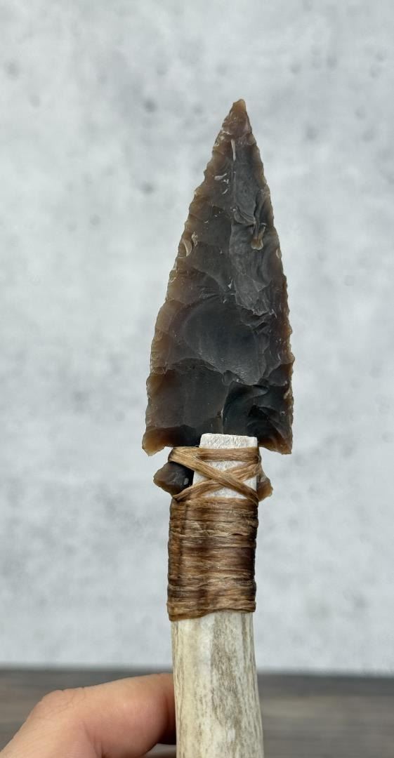 Handmade by Bo Earls. Bo is one of the finest modern flint and obsidian knappers. His knives are some of the nicest money can buy. The handle is whitetail deer horn. 9" long.