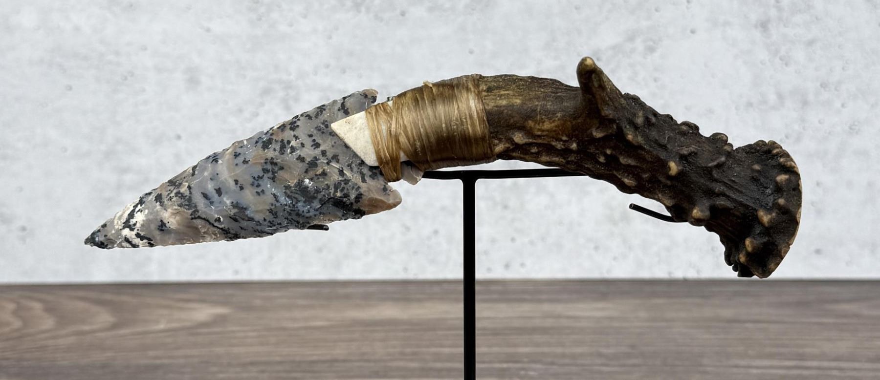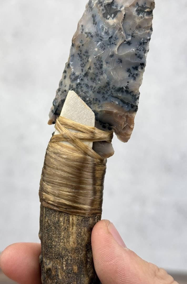 Handmade by Bo Earls. Bo is one of the finest modern flint and obsidian knappers. His knives are some of the nicest money can buy. The handle is whitetail deer horn. 8 1/2" long.