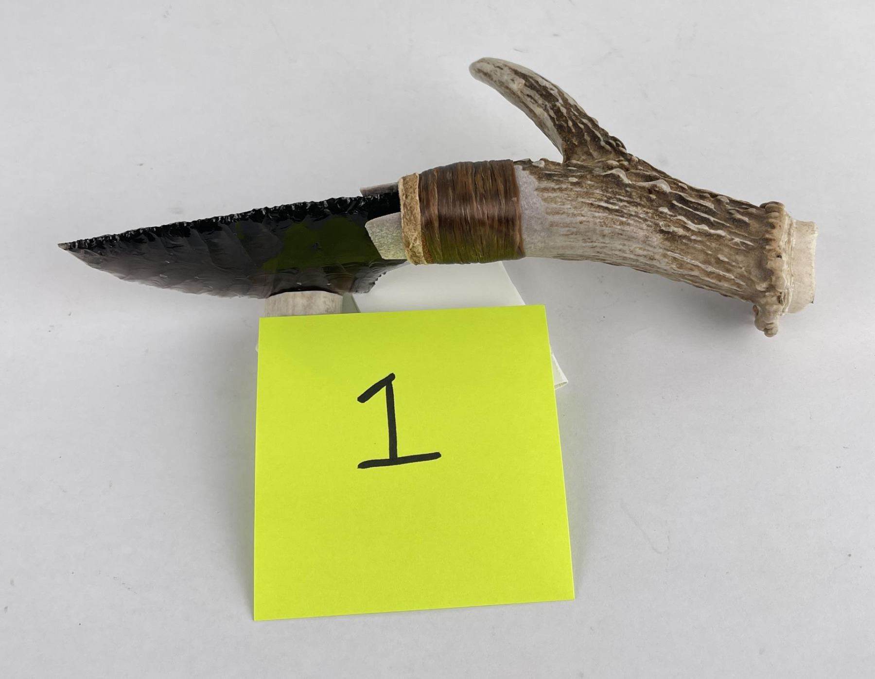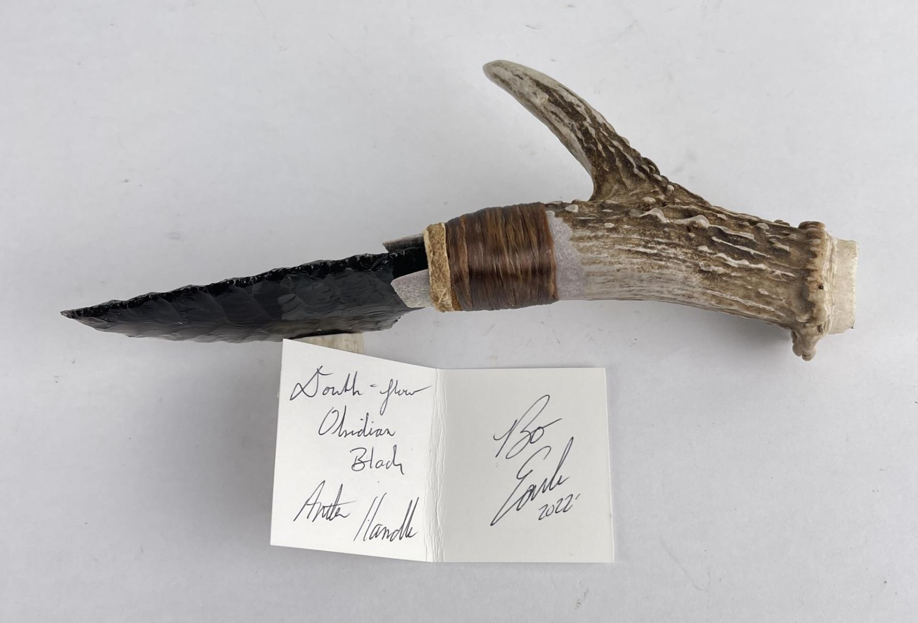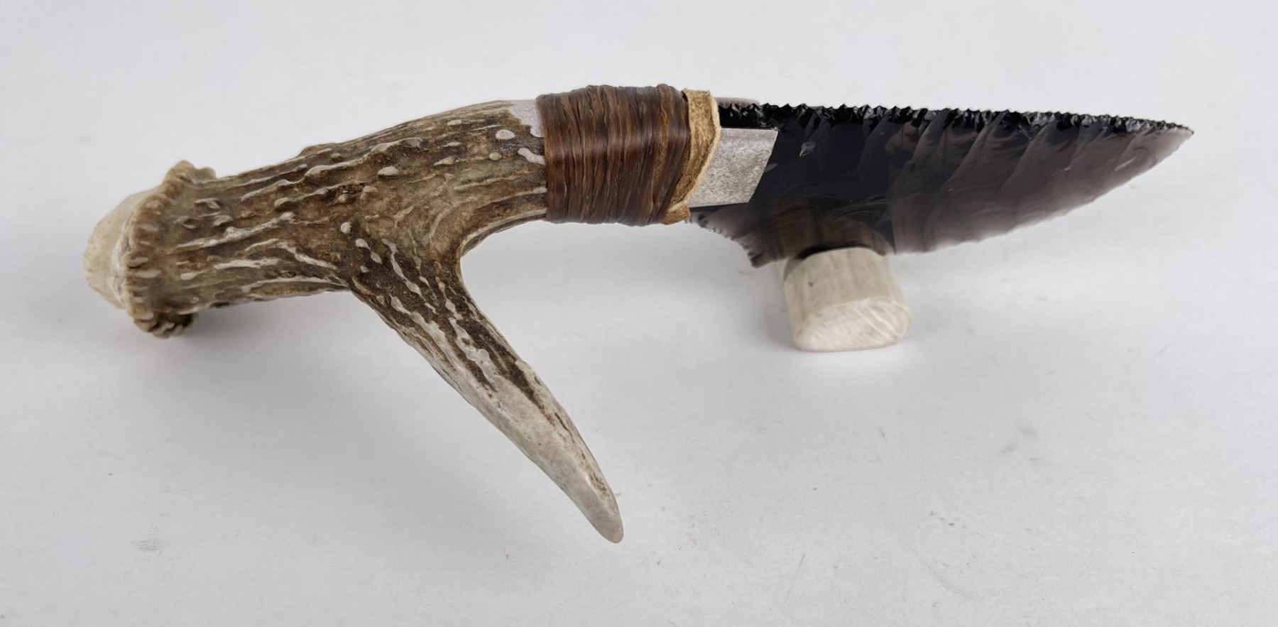 Handmade by Bo Earls. Bo is one of the finest modern flint and obsidian knappers. His knives are some of the nicest money can buy. The handle is whitetail deer horn. 8" long including handle.