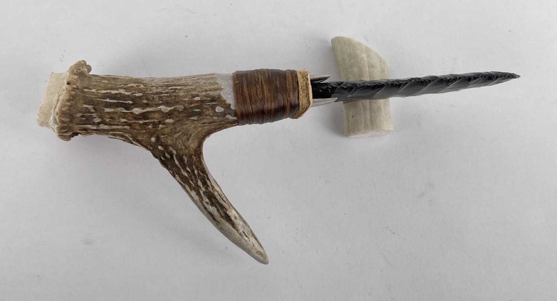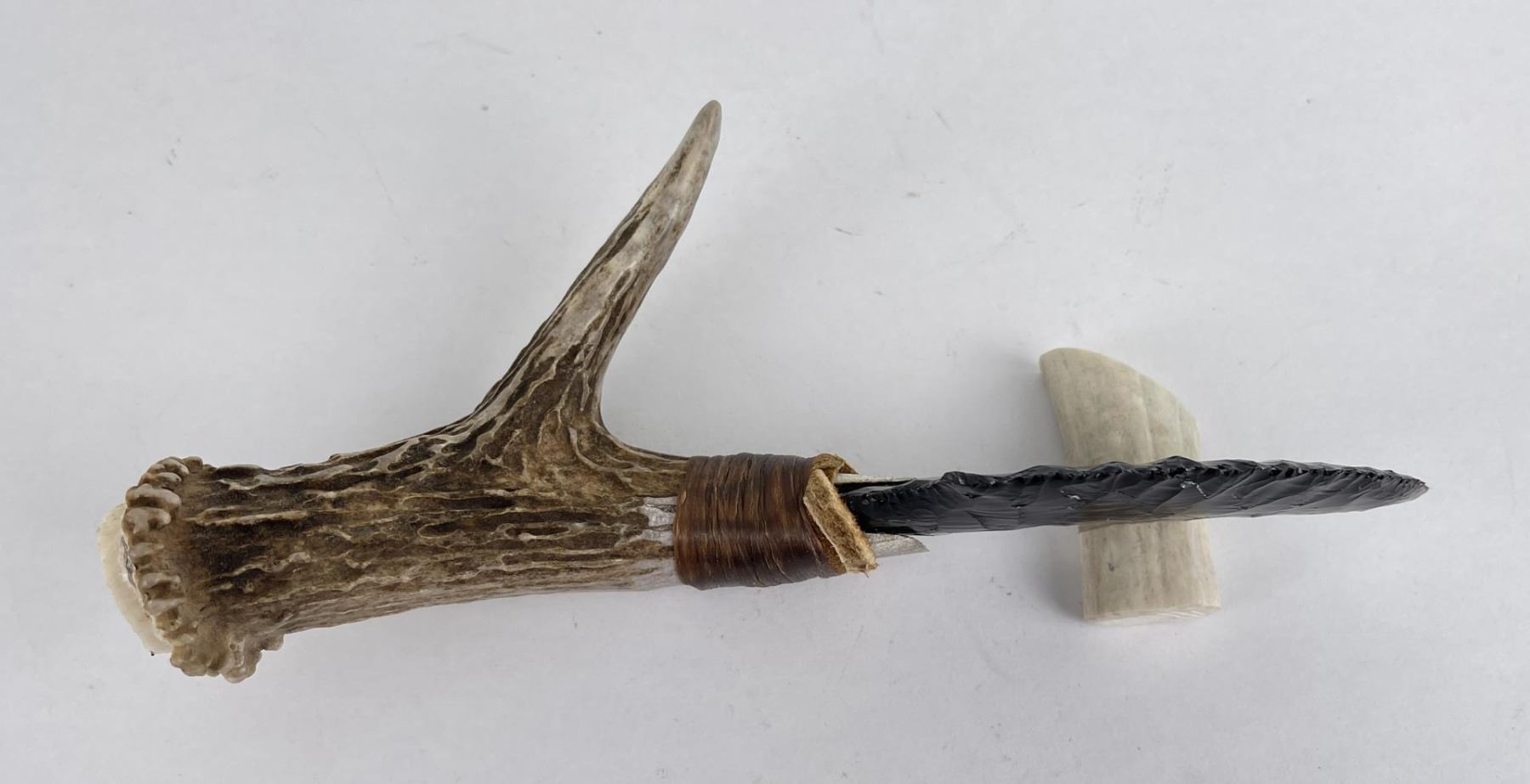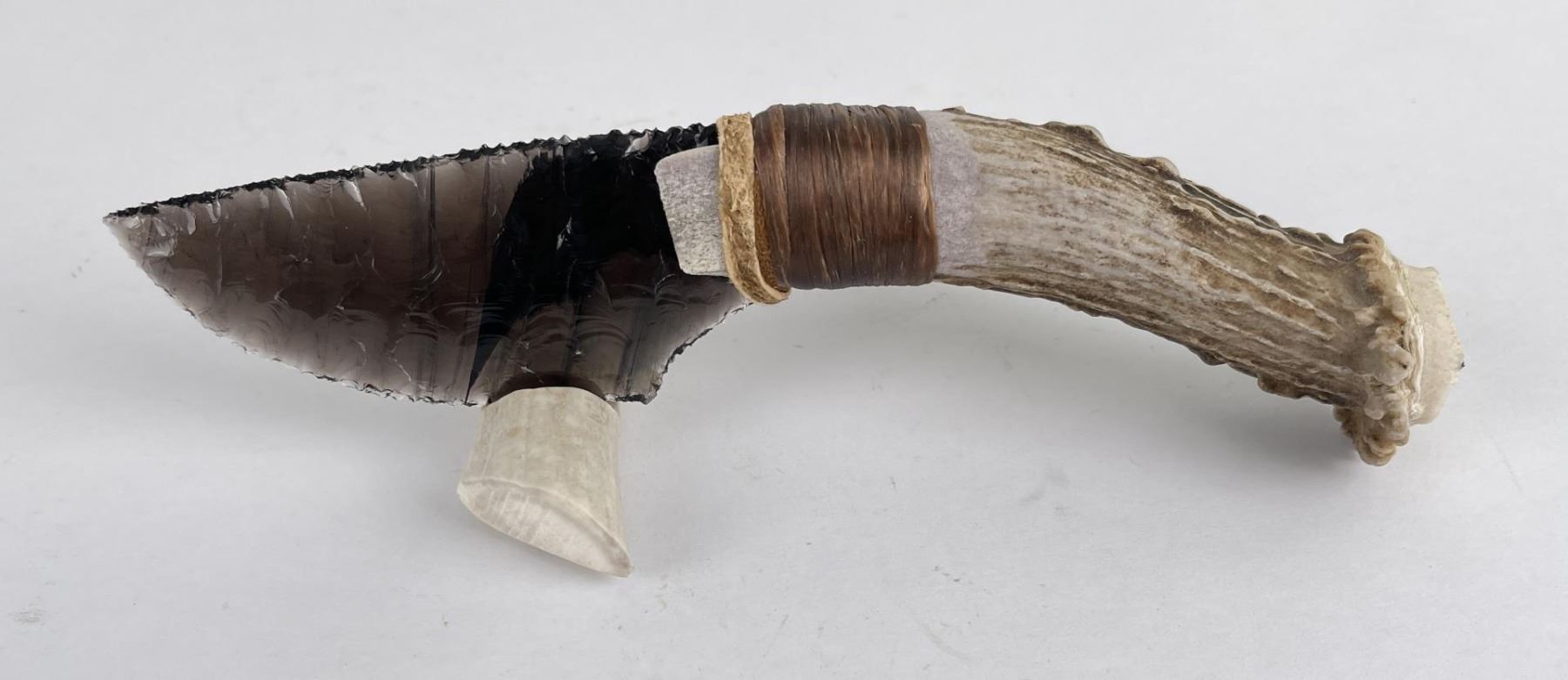 Handmade by Bo Earls. Bo is one of the finest modern flint and obsidian knappers. His knives are some of the nicest money can buy. The handle is whitetail deer horn. 8" long including handle.