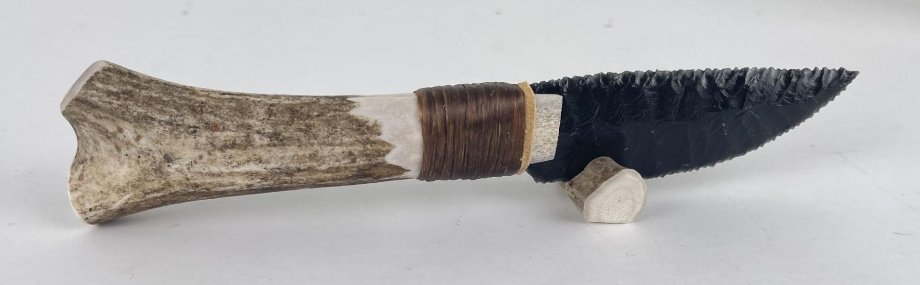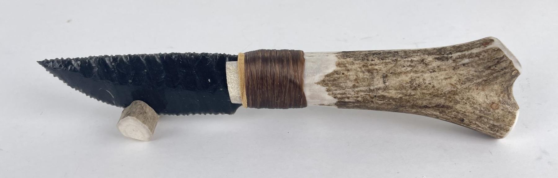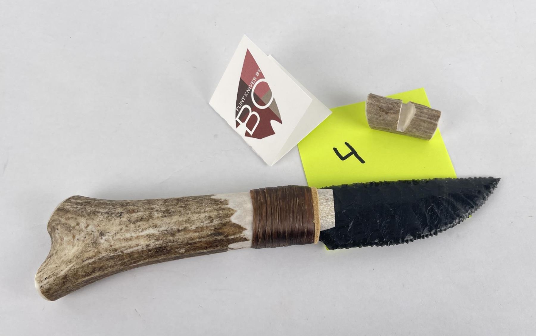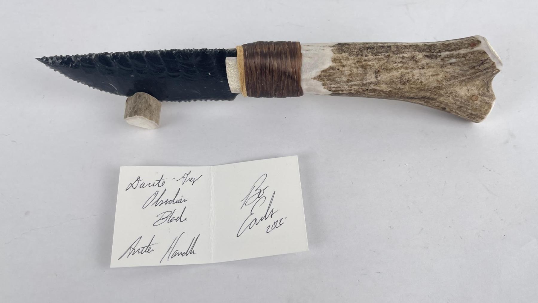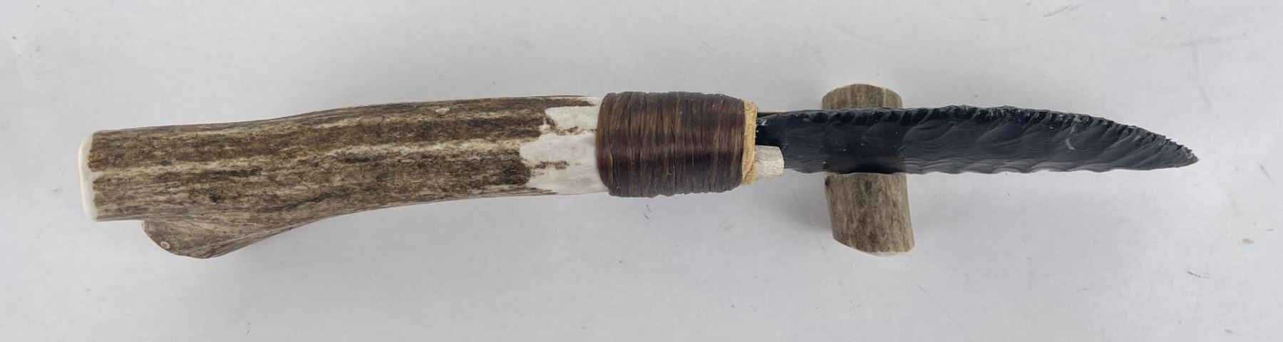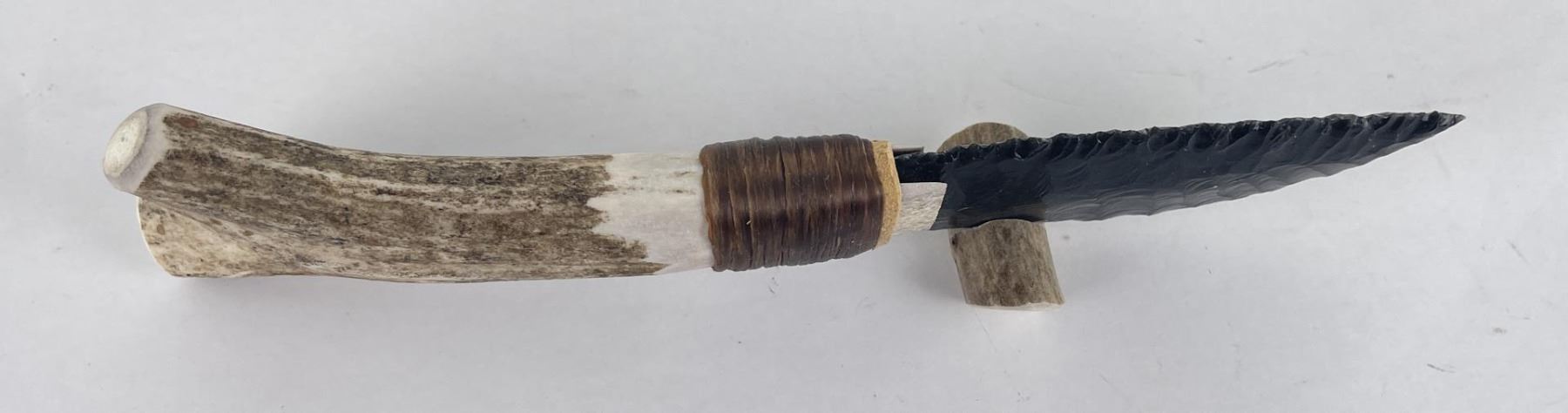 Handmade by Bo Earls. Bo is one of the finest modern flint and obsidian knappers. His knives are some of the nicest money can buy. The handle is whitetail deer horn. 9.5" long including handle.