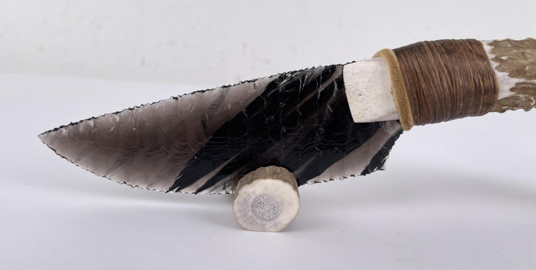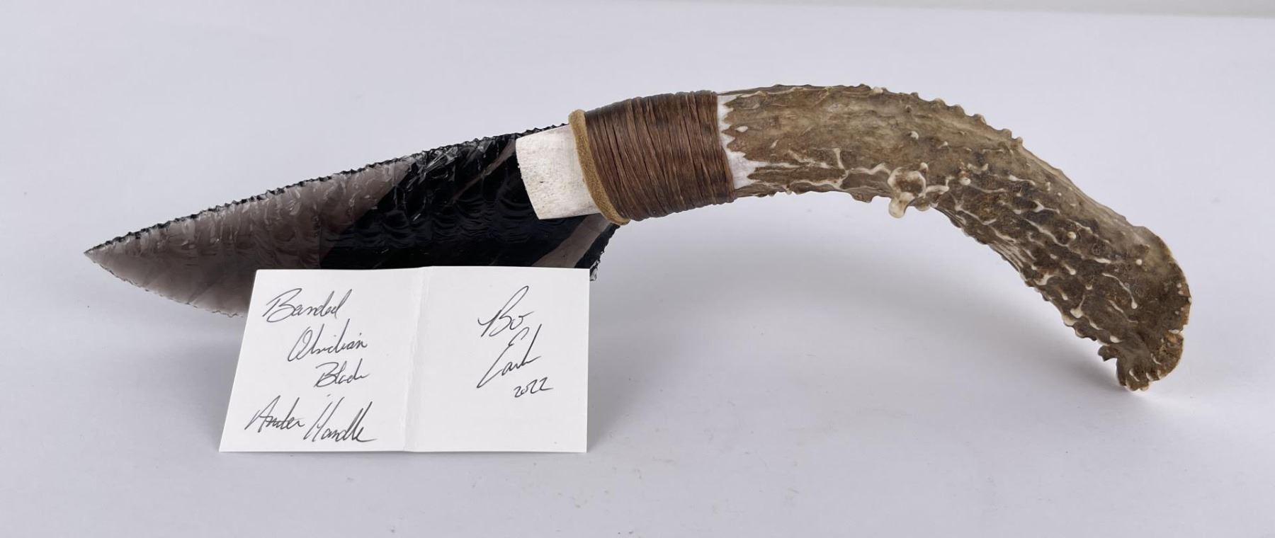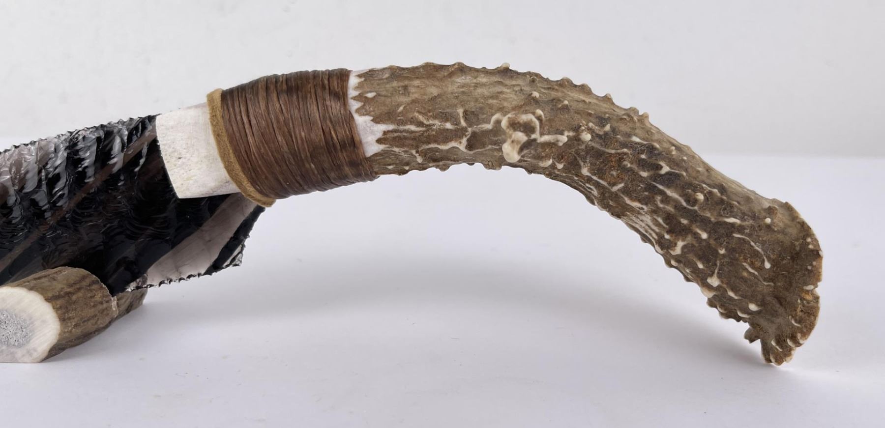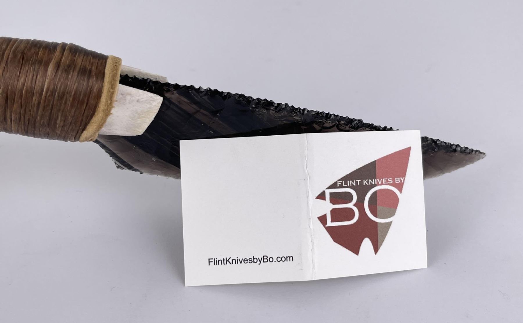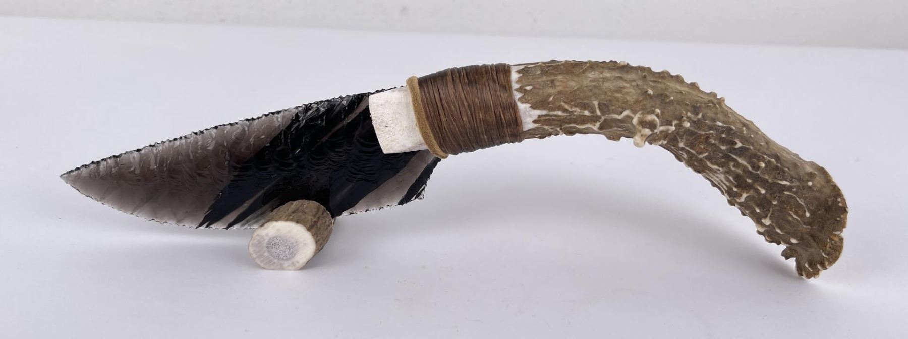Handmade by Bo Earls. Bo is one of the finest modern flint and obsidian knappers. His knives are some of the nicest money can buy. The handle is whitetail deer horn. 11" long including handle.