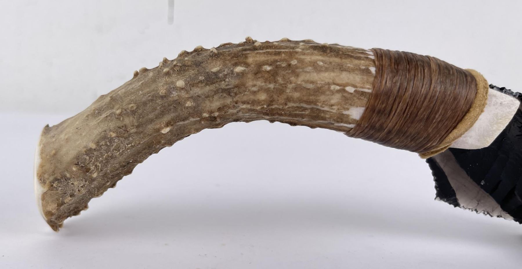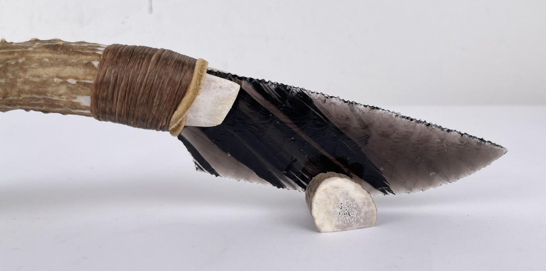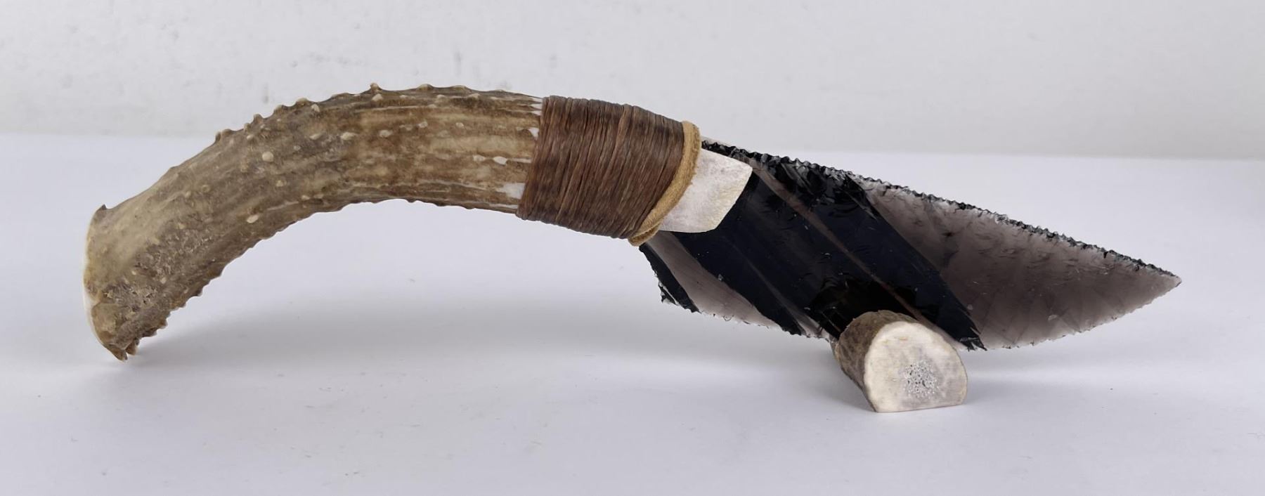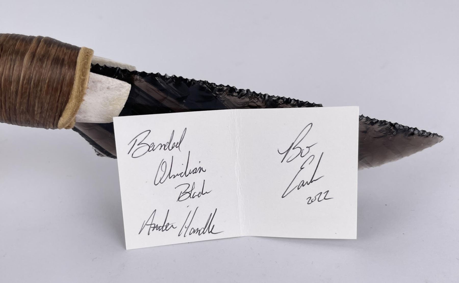 Handmade by Bo Earls. Bo is one of the finest modern flint and obsidian knappers. His knives are some of the nicest money can buy. The handle is whitetail deer horn. 11" long including handle.