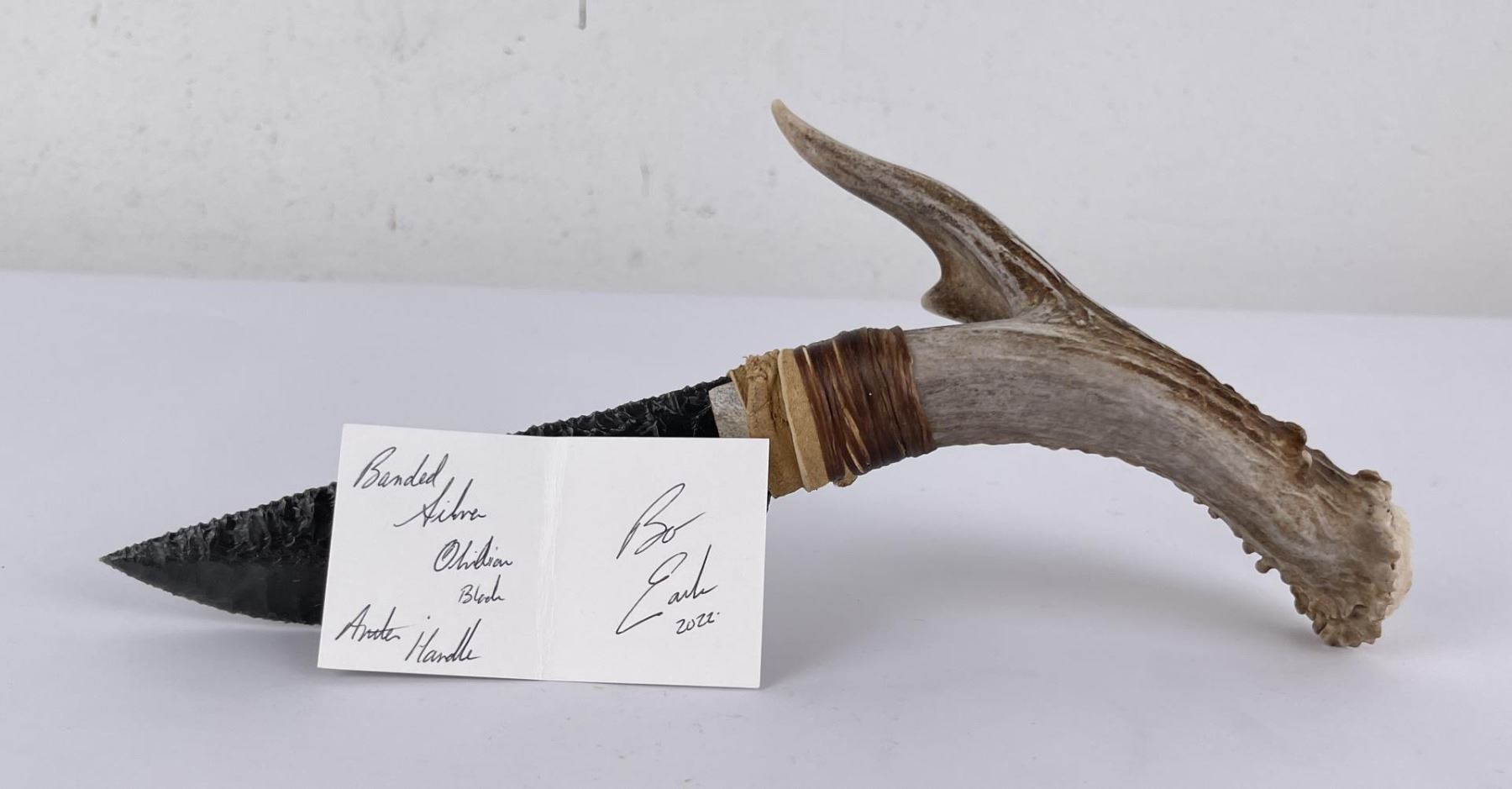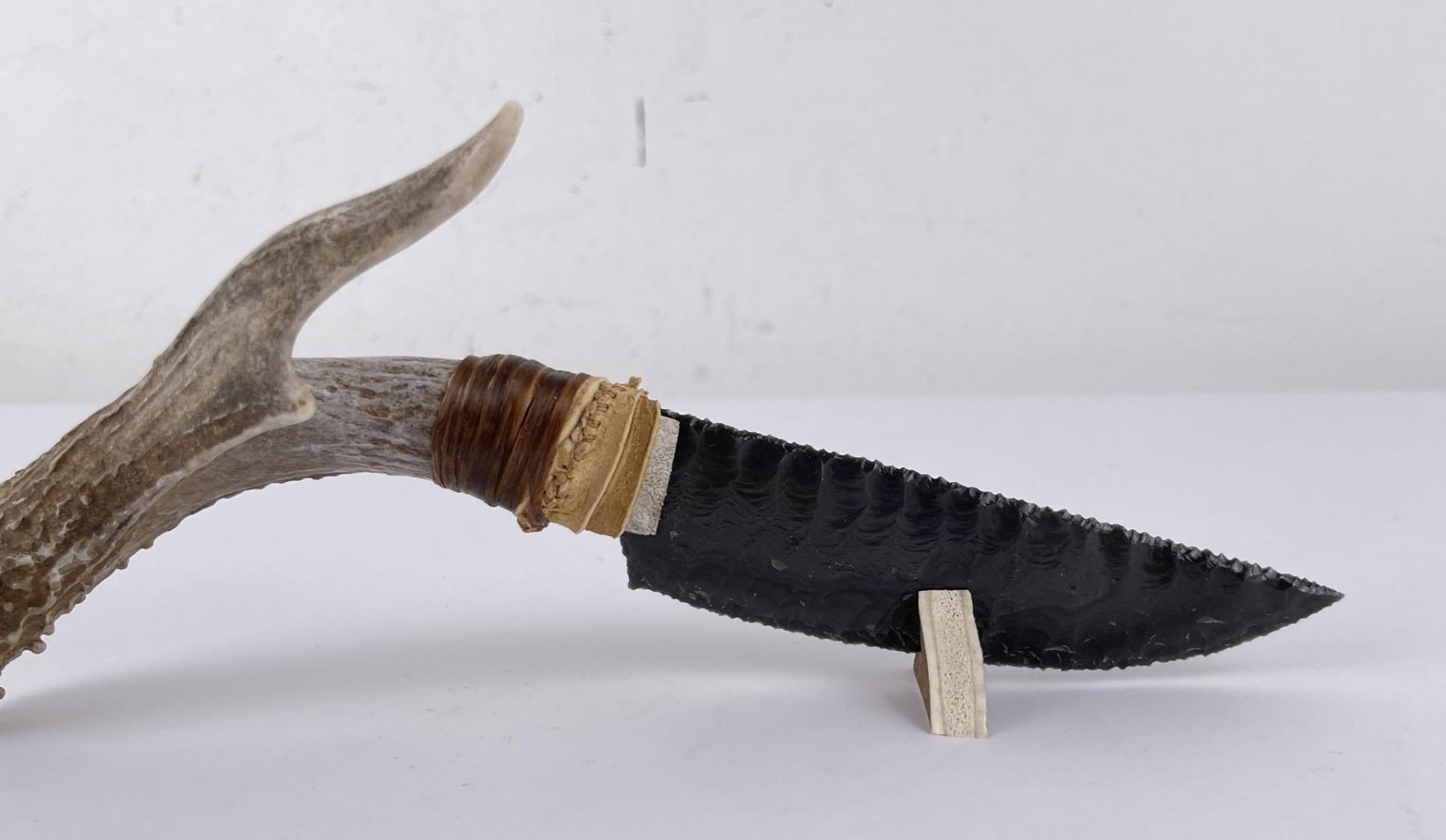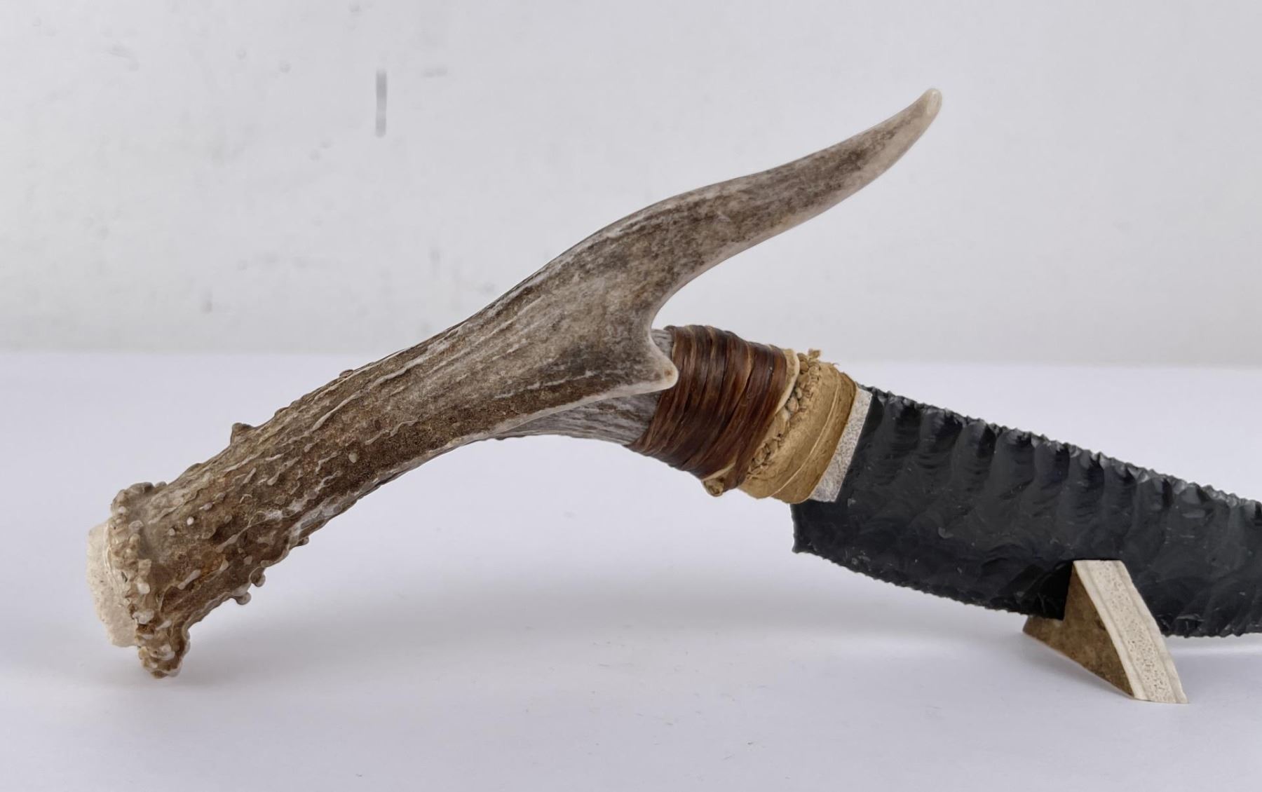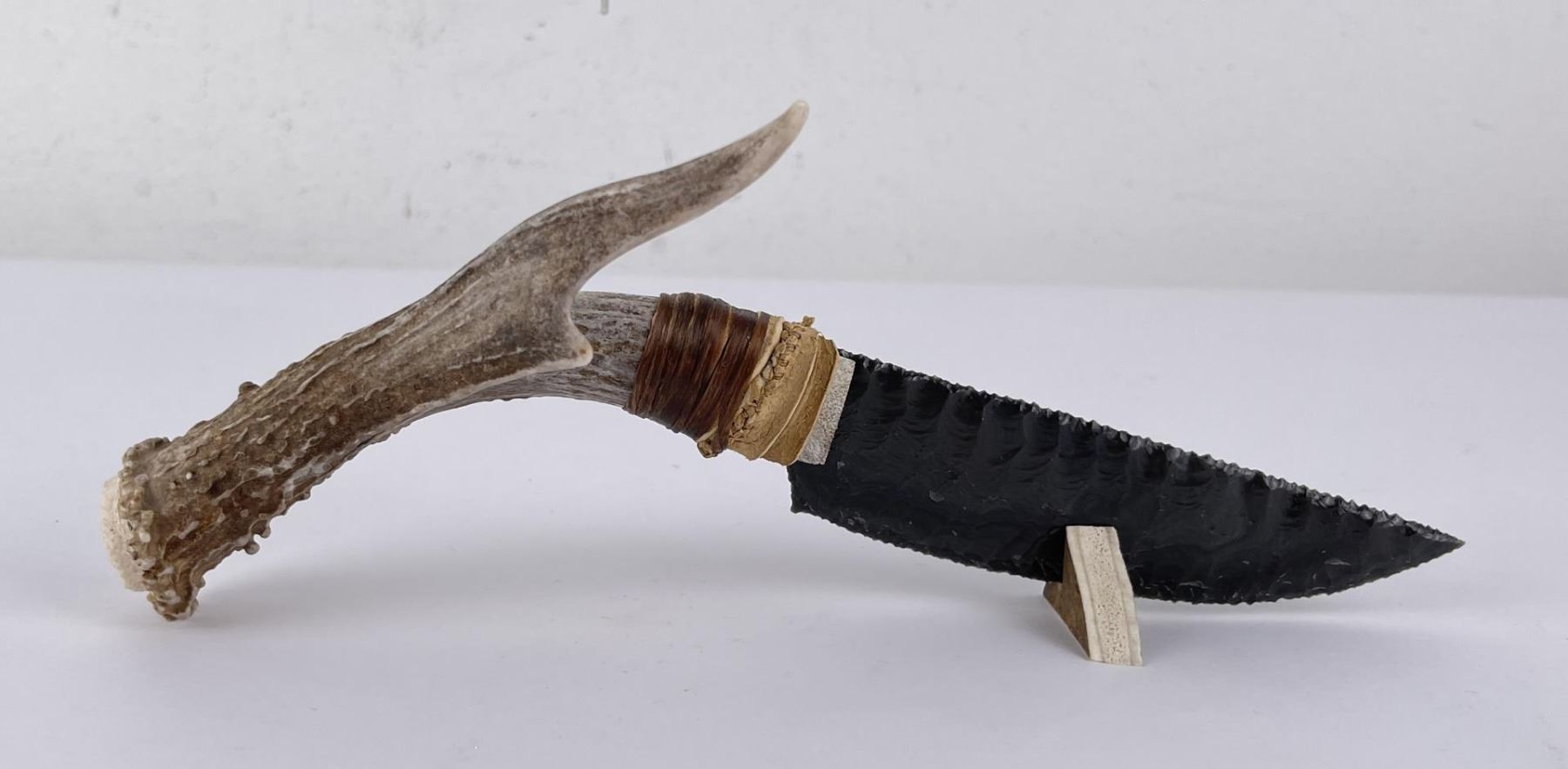 Handmade by Bo Earls. Bo is one of the finest modern flint and obsidian knappers. His knives are some of the nicest money can buy. The handle is whitetail deer horn. 11" long including handle.