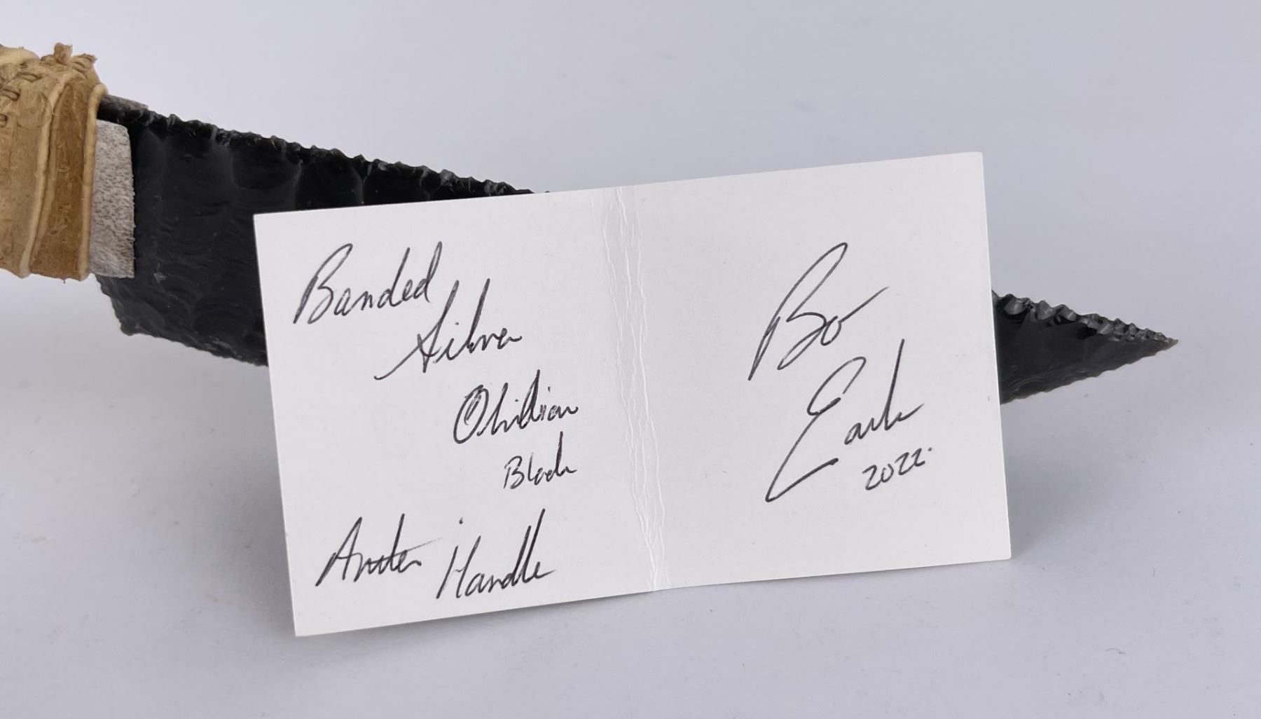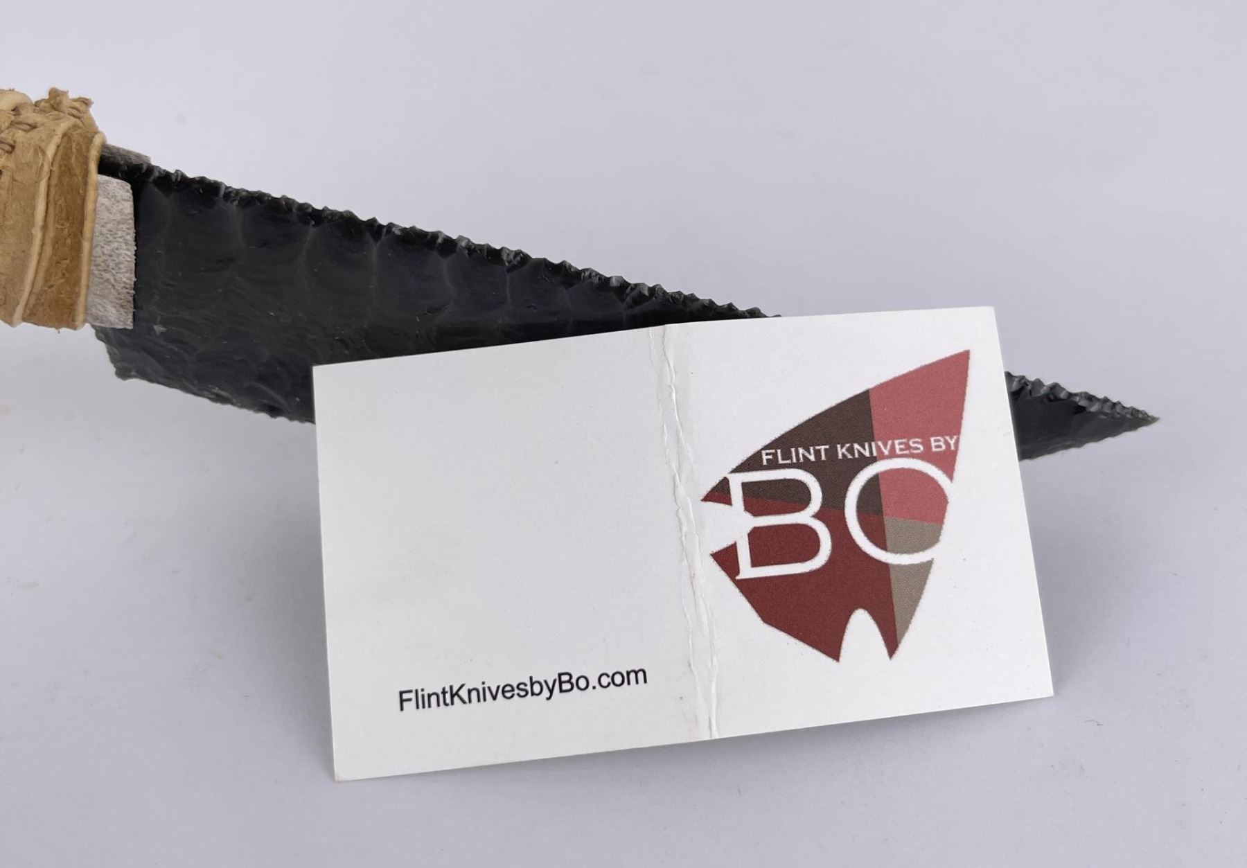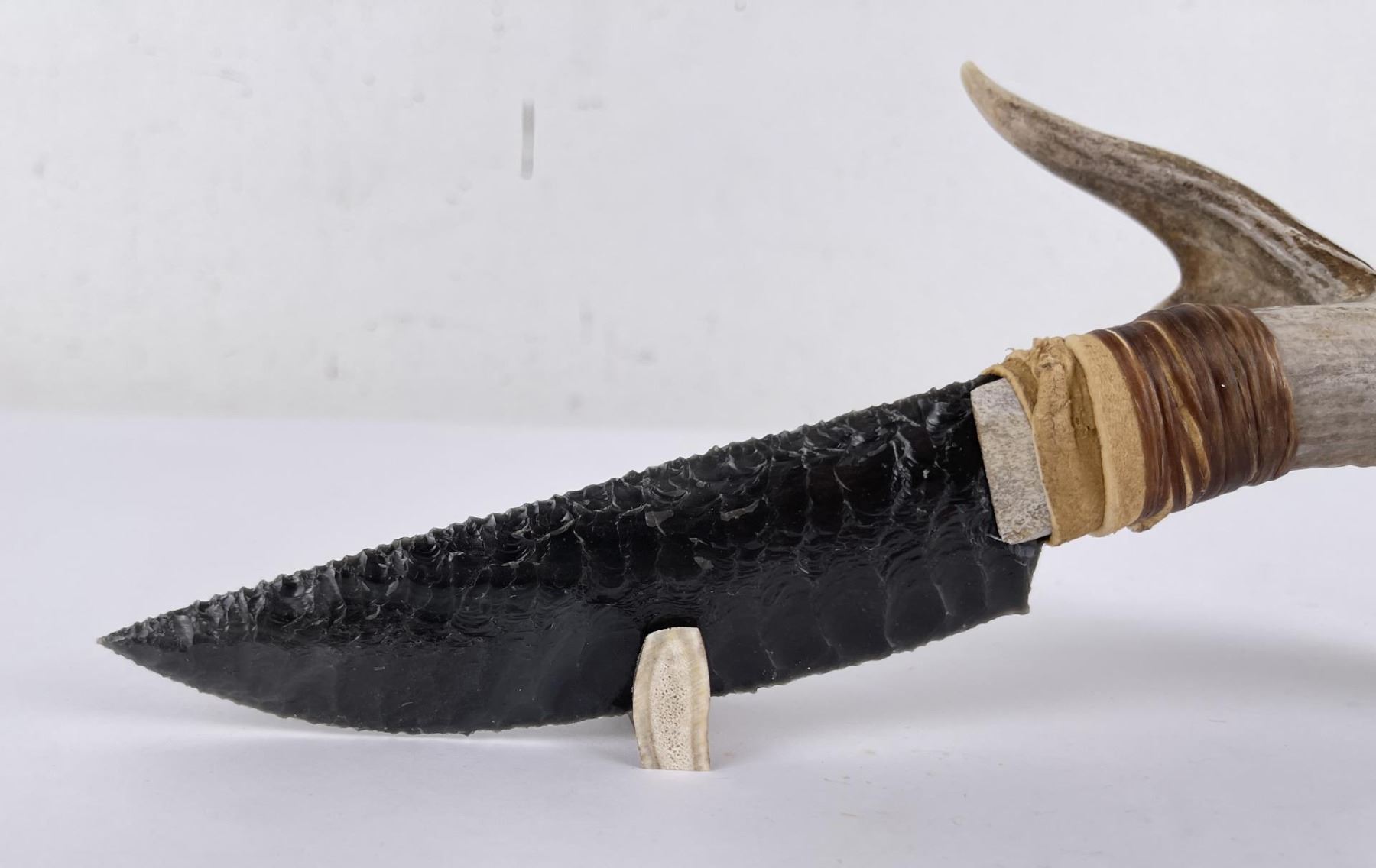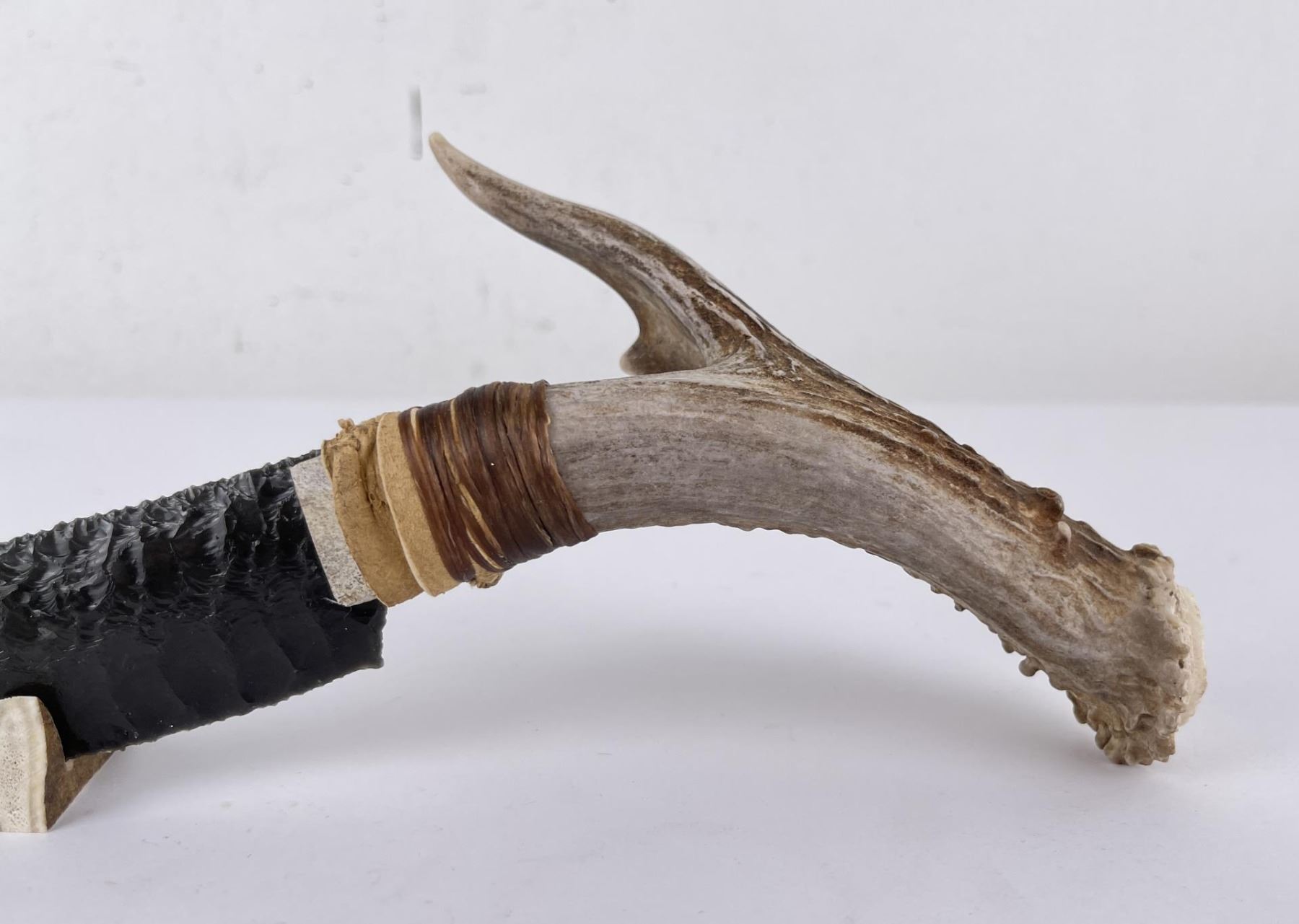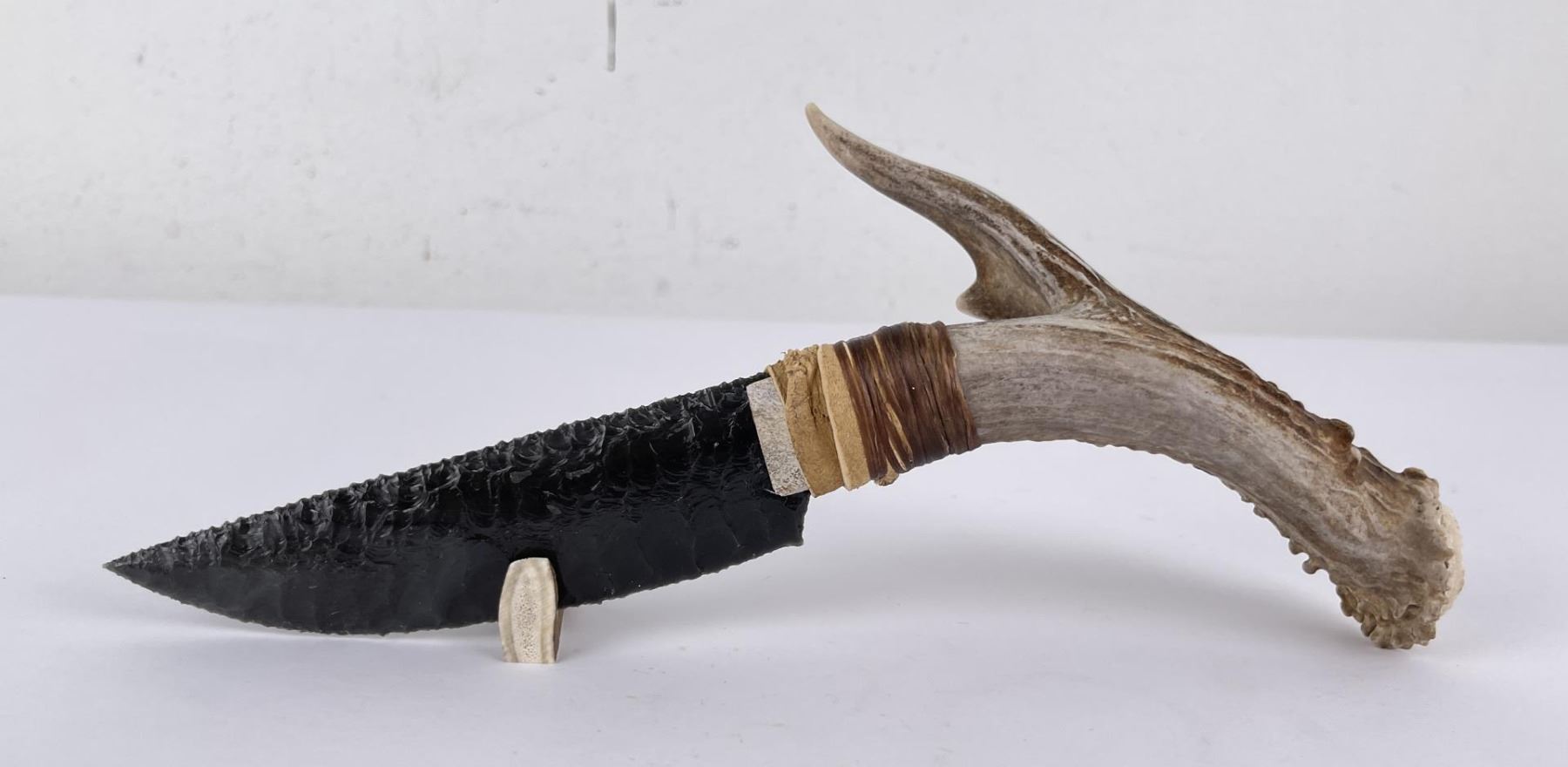 Handmade by Bo Earls. Bo is one of the finest modern flint and obsidian knappers. His knives are some of the nicest money can buy. The handle is whitetail deer horn. 11" long including handle.