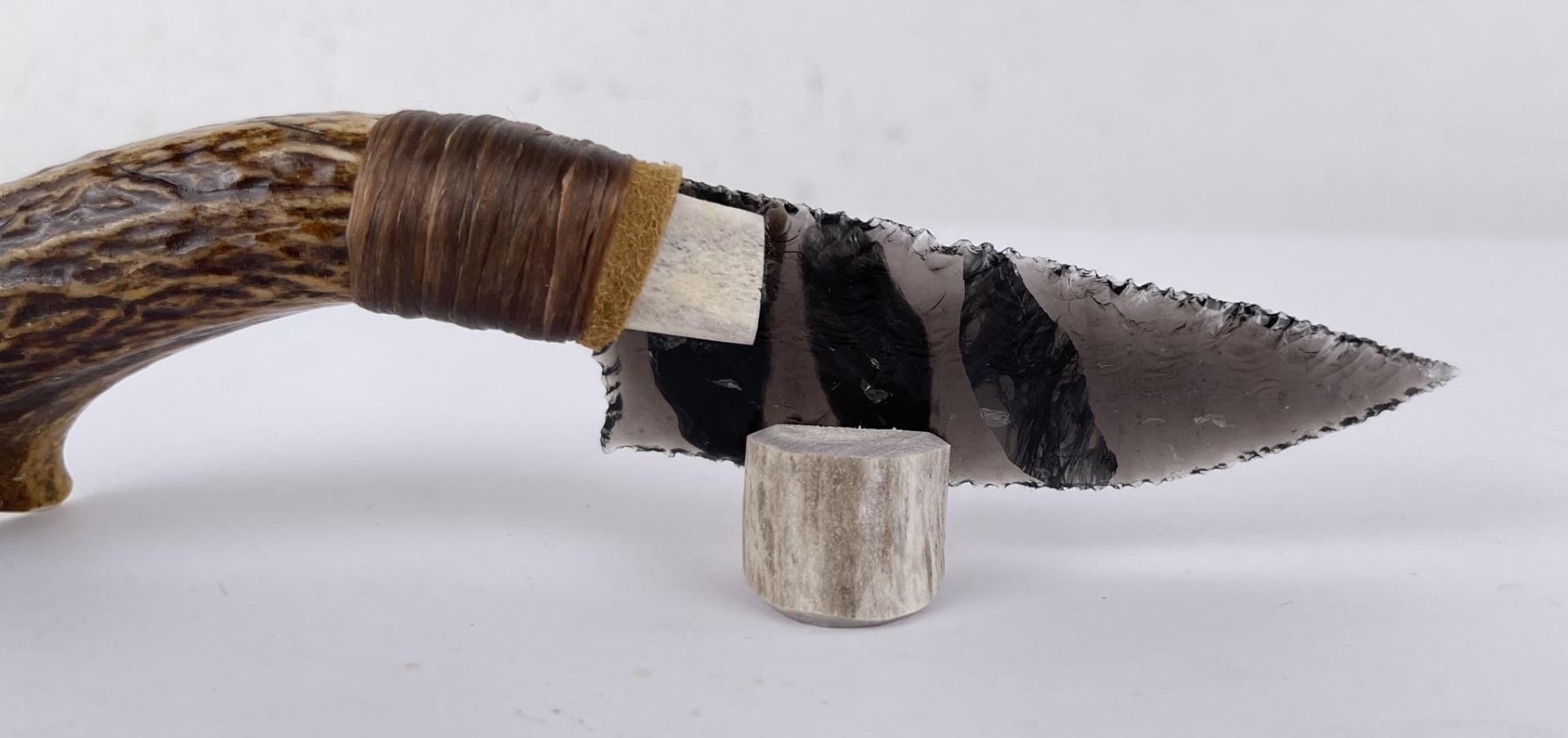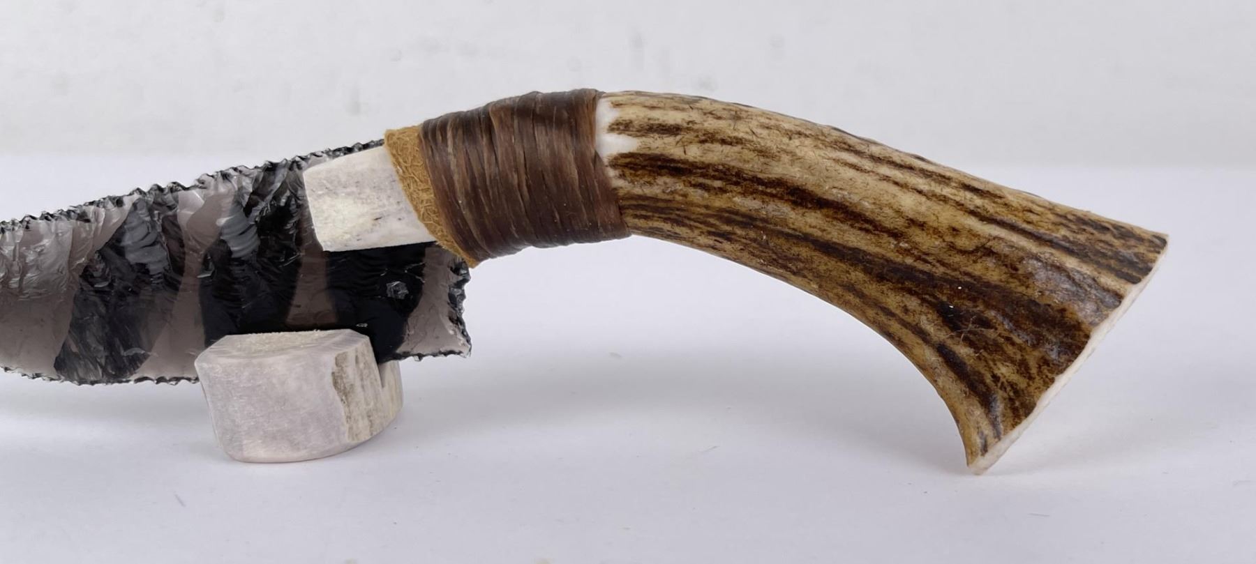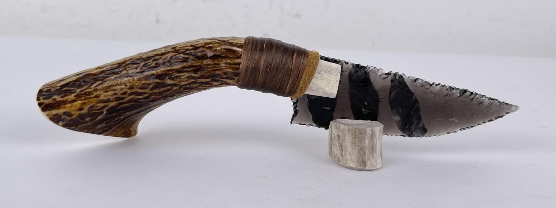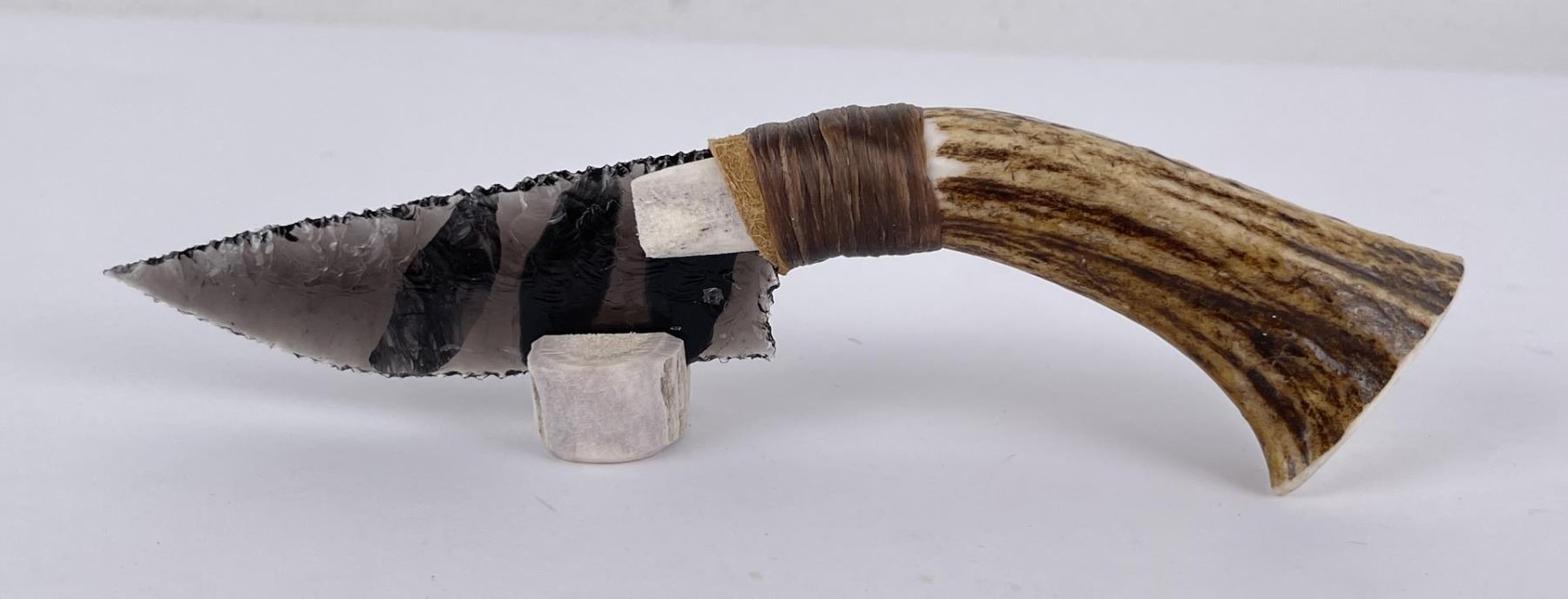 Handmade by Bo Earls. Bo is one of the finest modern flint and obsidian knappers. His knives are some of the nicest money can buy. The handle is whitetail deer horn. 7 1/2" long including handle.
