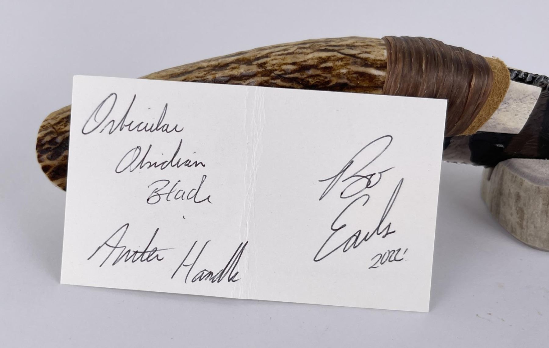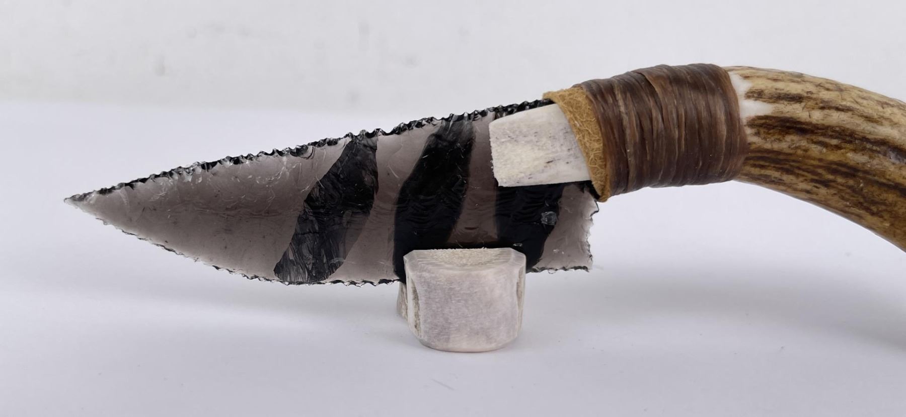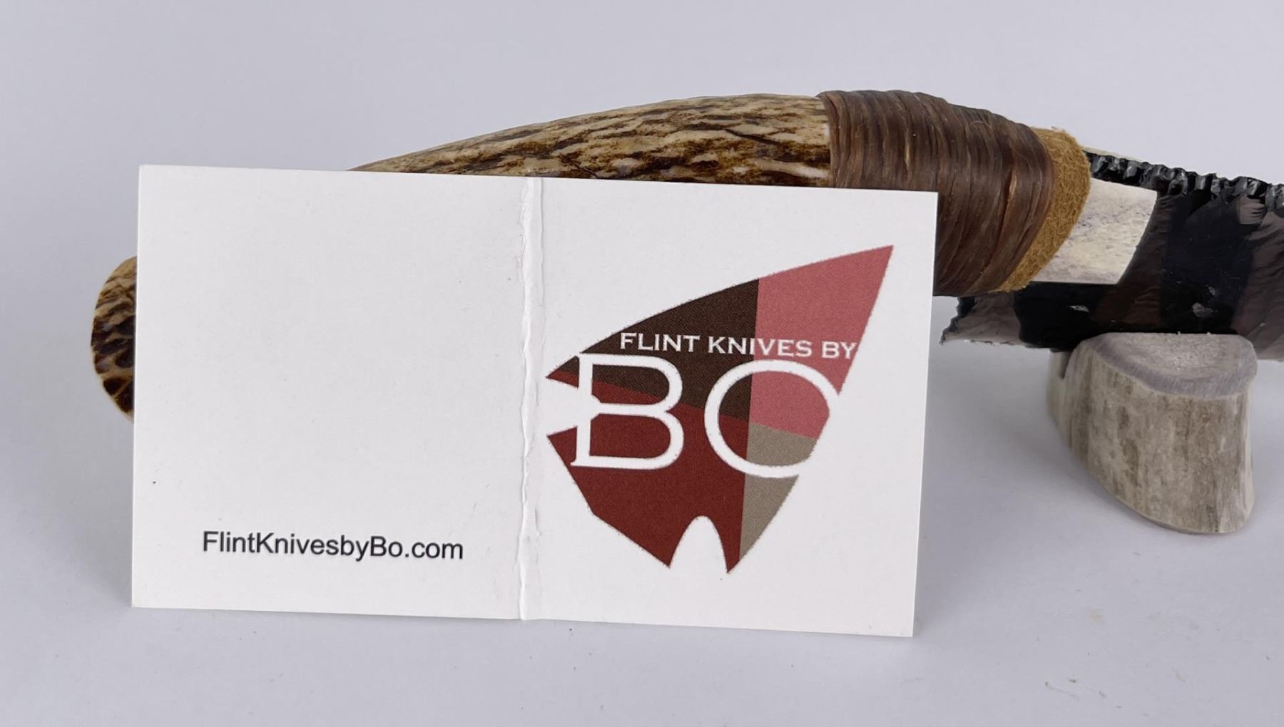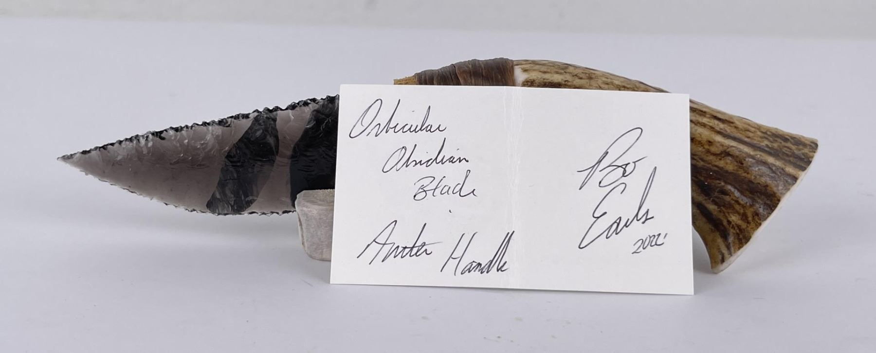 Handmade by Bo Earls. Bo is one of the finest modern flint and obsidian knappers. His knives are some of the nicest money can buy. The handle is whitetail deer horn. 7 1/2" long including handle.