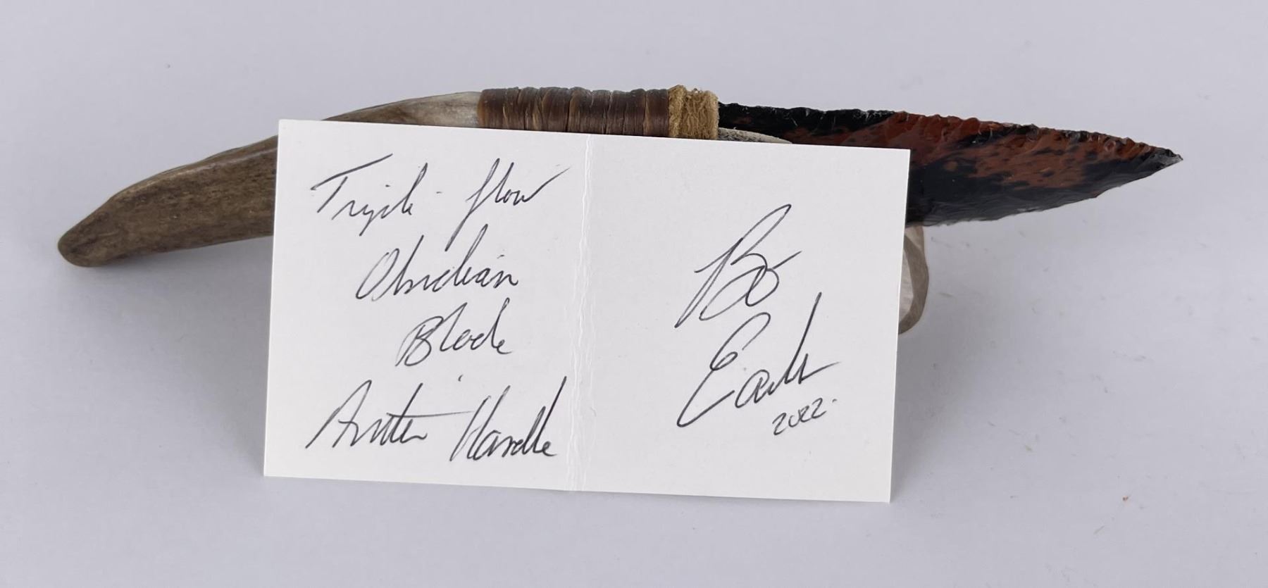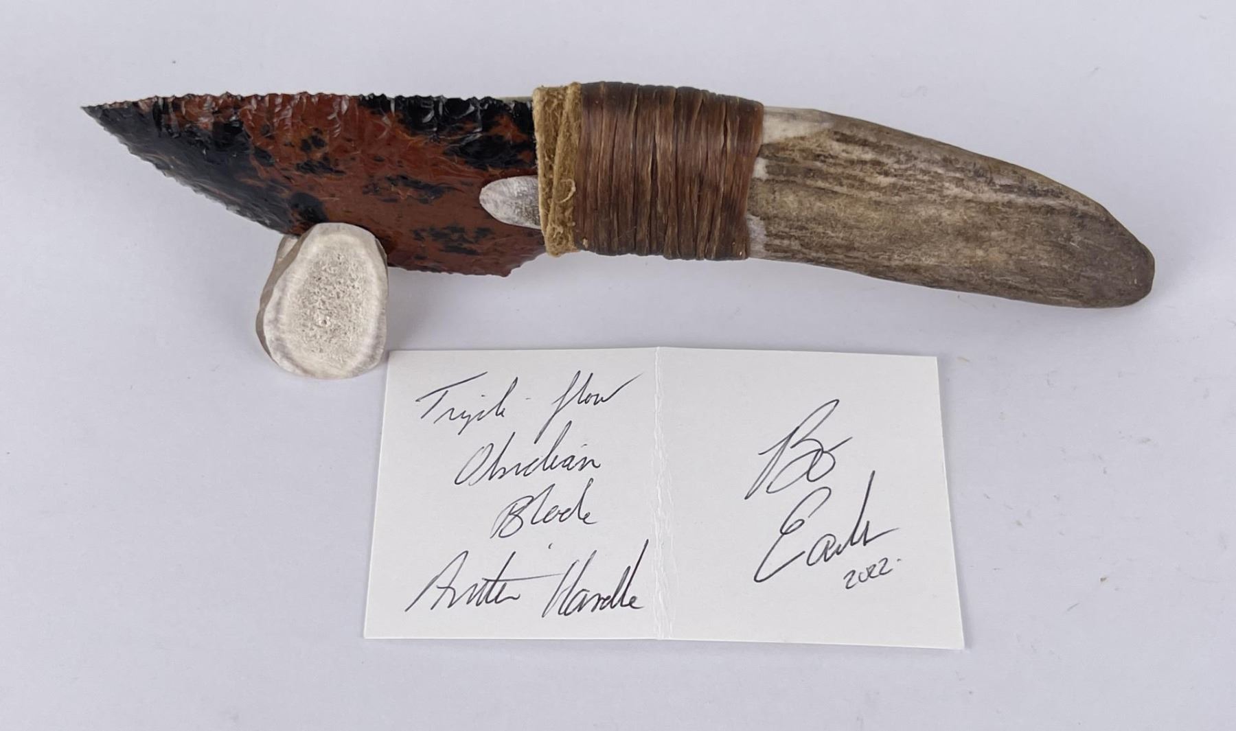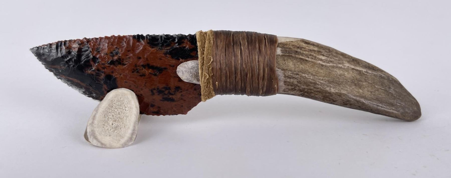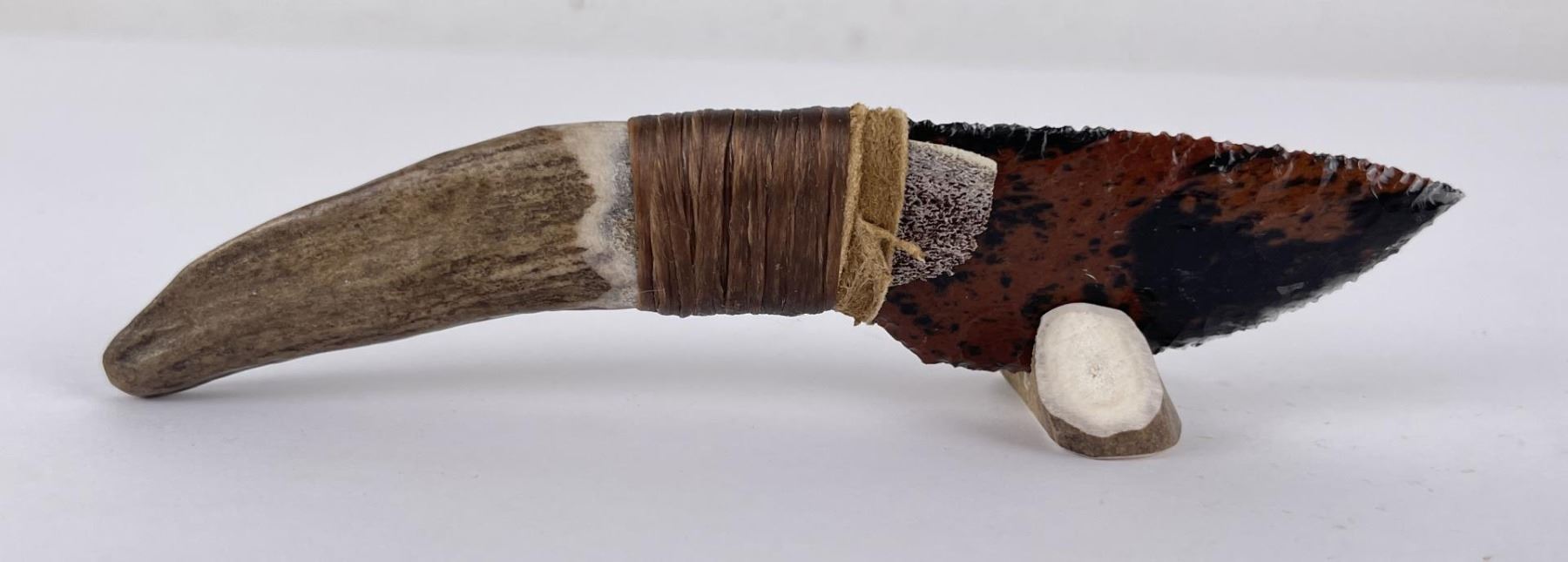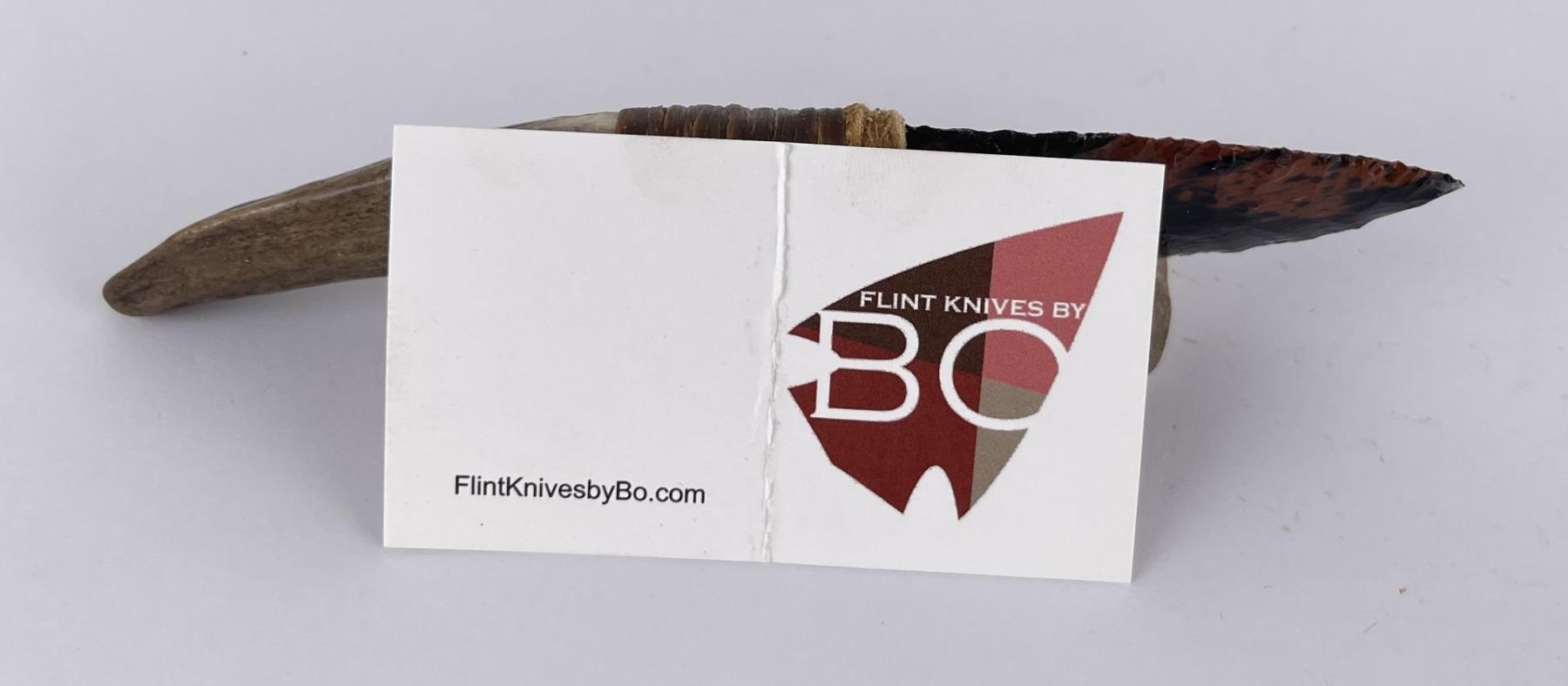 Handmade by Bo Earls. Bo is one of the finest modern flint and obsidian knappers. His knives are some of the nicest money can buy. The handle is whitetail deer horn. 7" long including handle.
