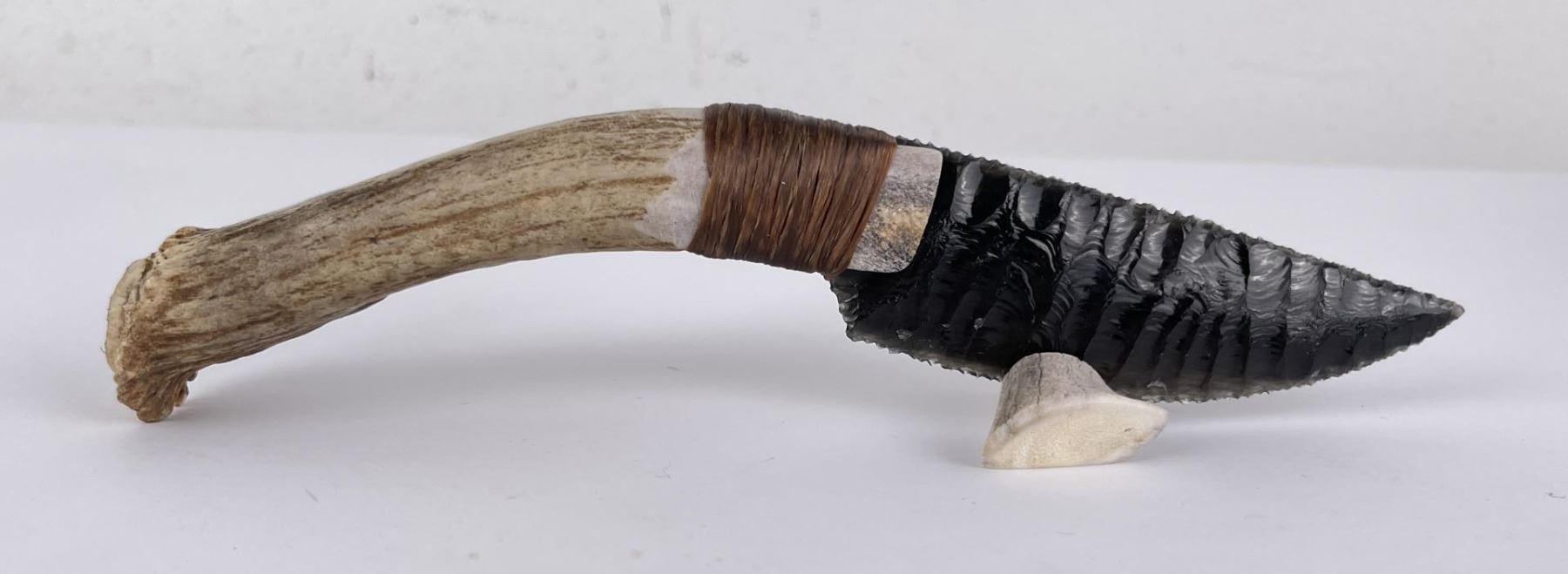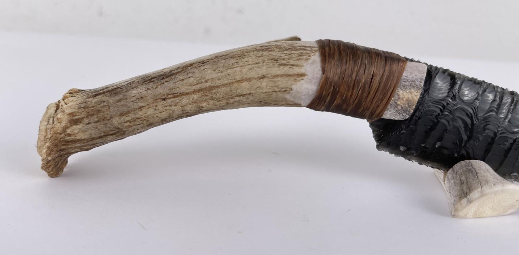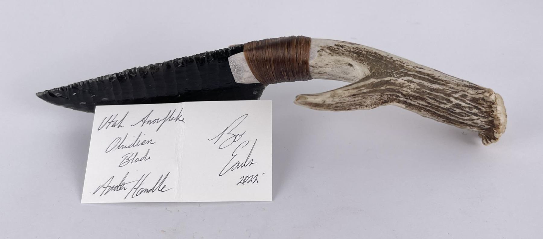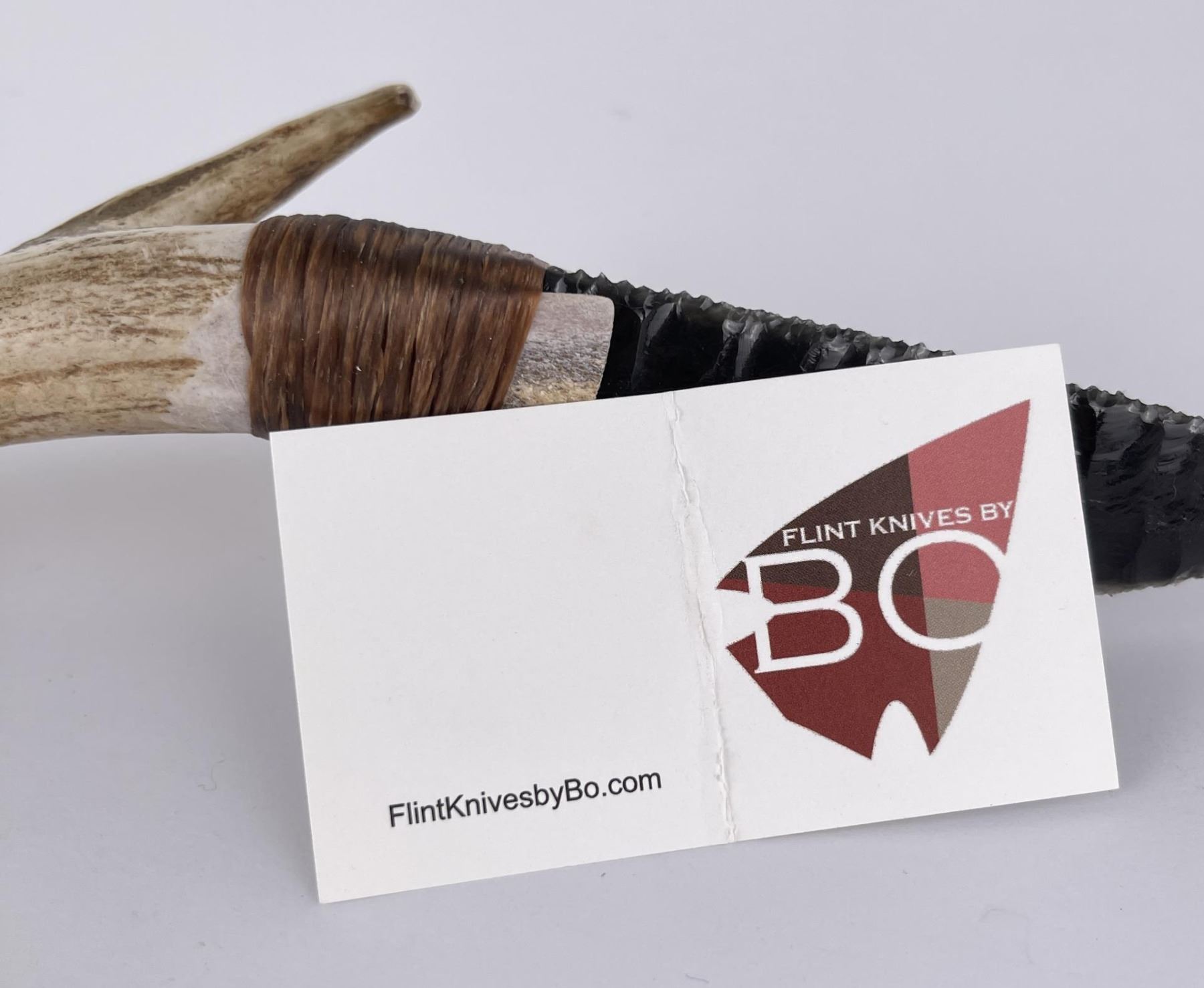 Handmade by Bo Earls. Bo is one of the finest modern flint and obsidian knappers. His knives are some of the nicest money can buy. The handle is whitetail deer horn. 9" long including handle.