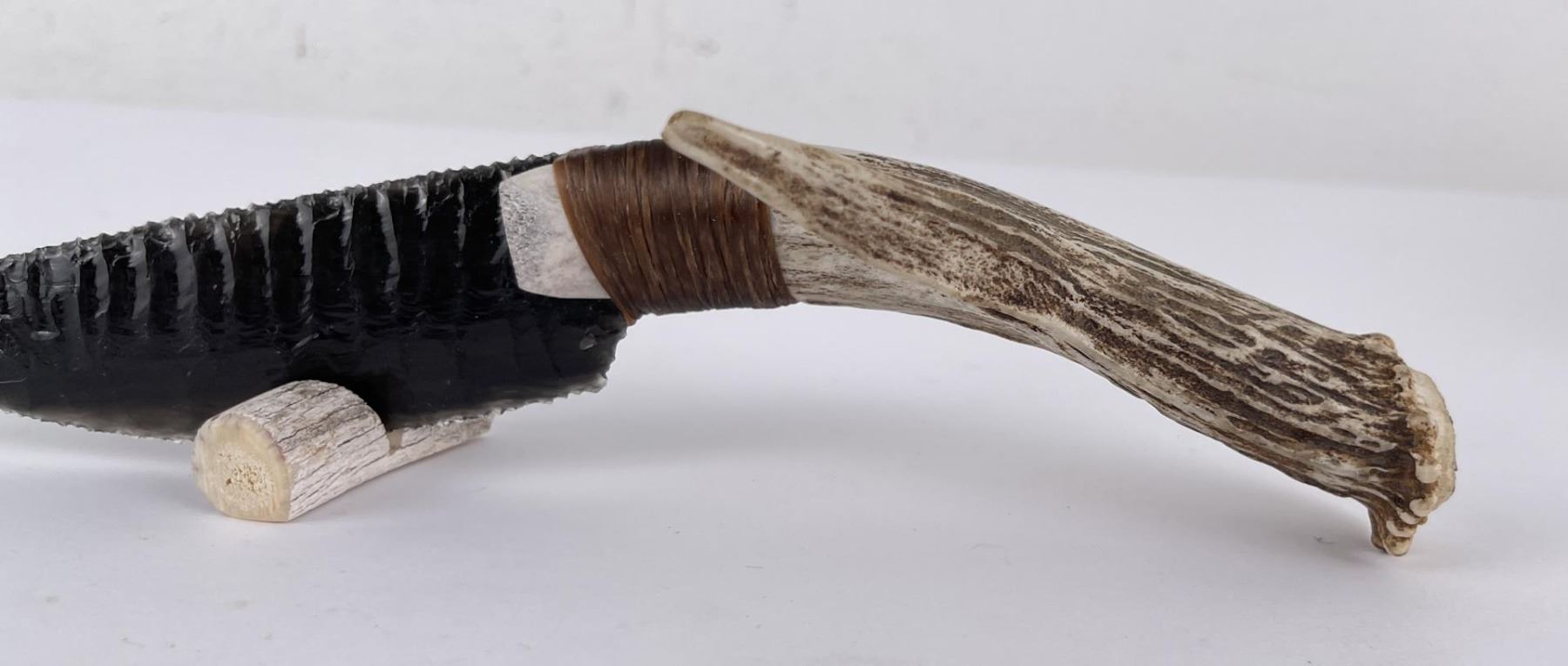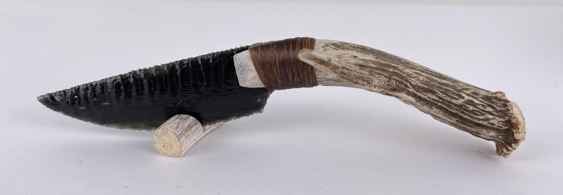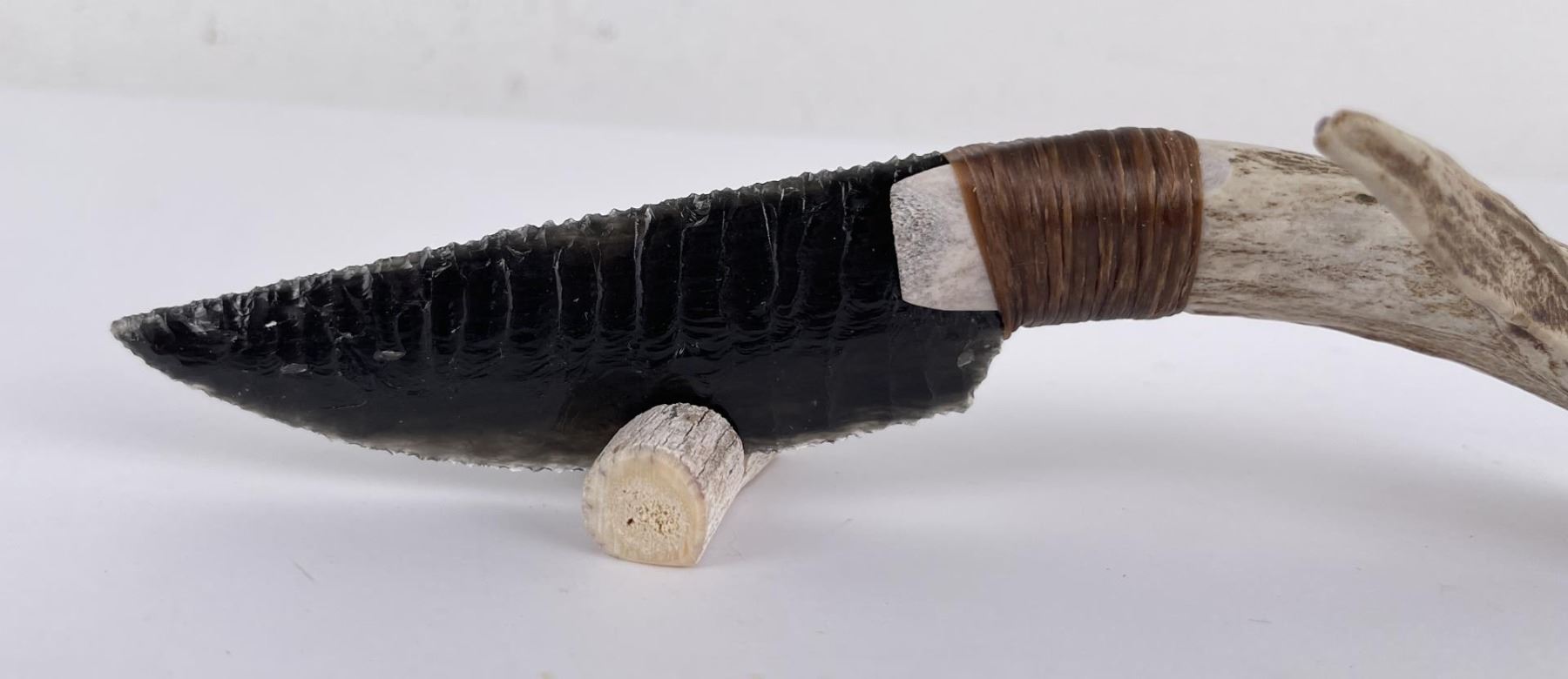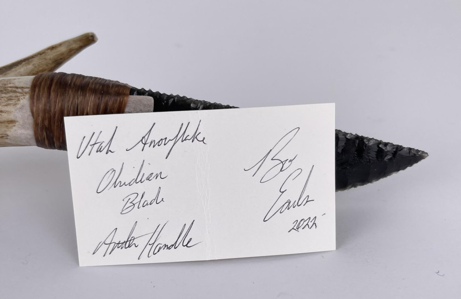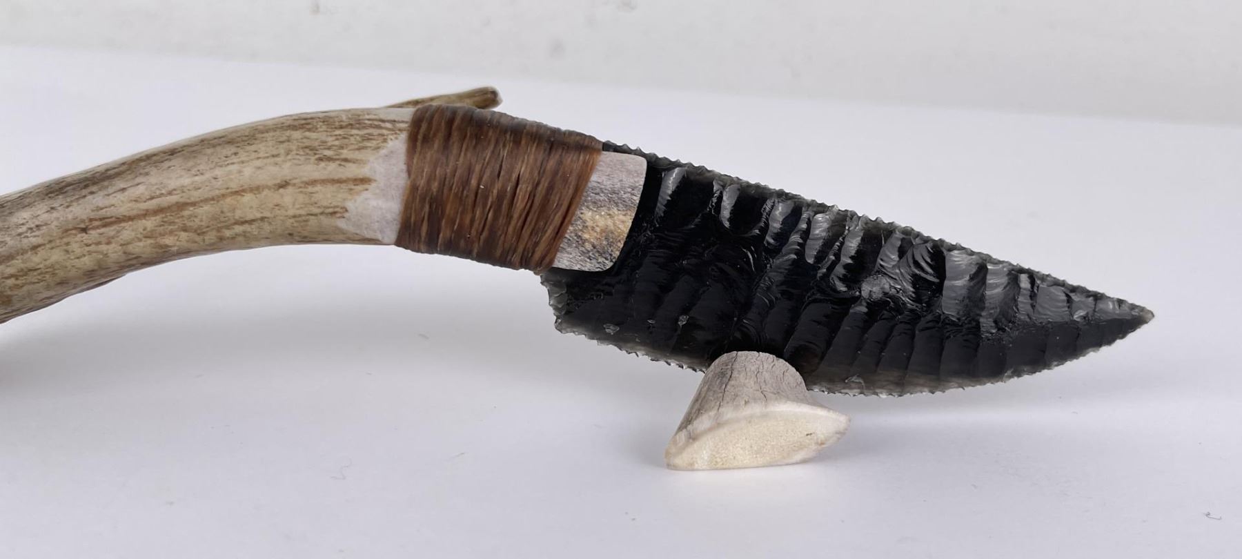 Handmade by Bo Earls. Bo is one of the finest modern flint and obsidian knappers. His knives are some of the nicest money can buy. The handle is whitetail deer horn. 9" long including handle.