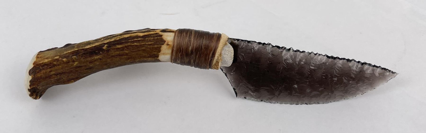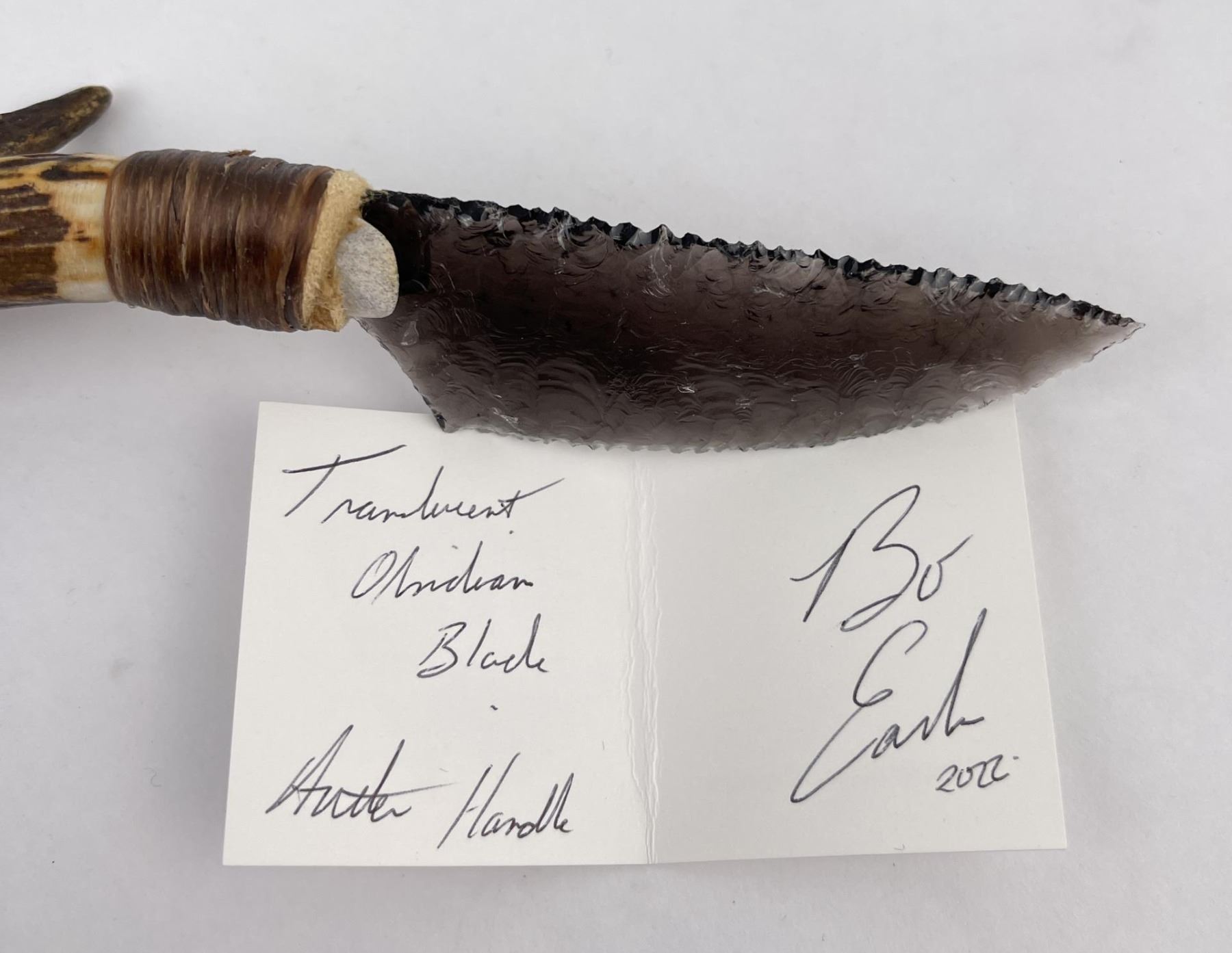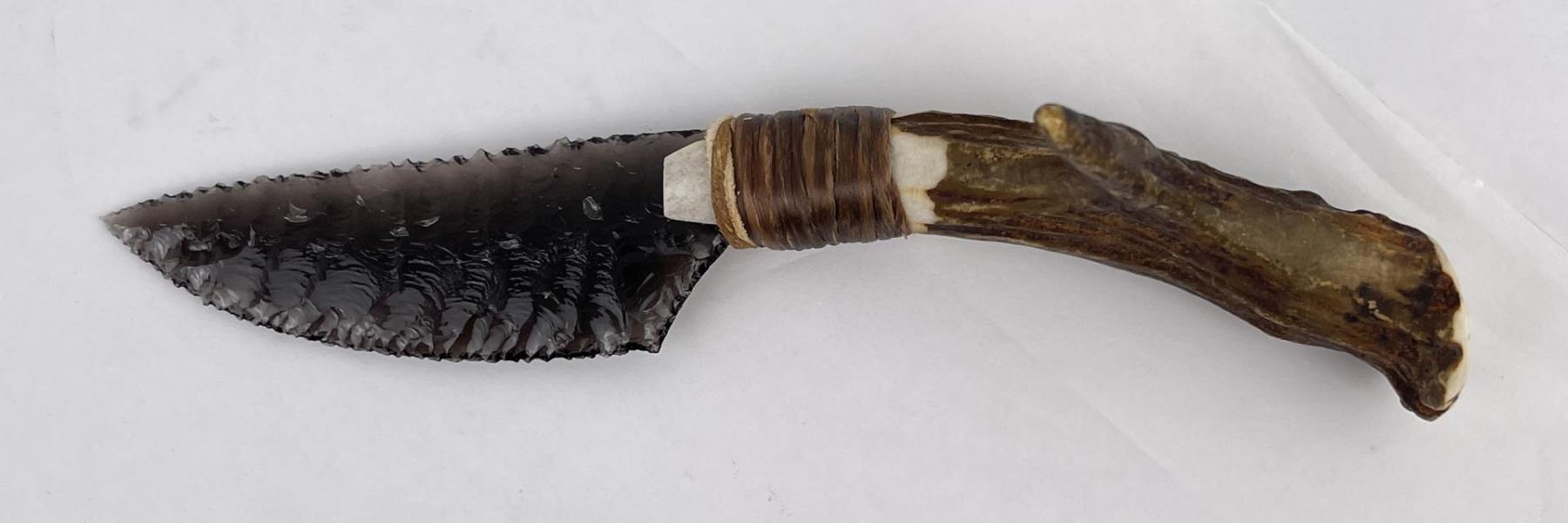 Handmade by Bo Earls. Bo is one of the finest modern flint and obsidian knappers. His knives are some of the nicest money can buy. The handle is whitetail deer horn. 7 1/4" long including handle.