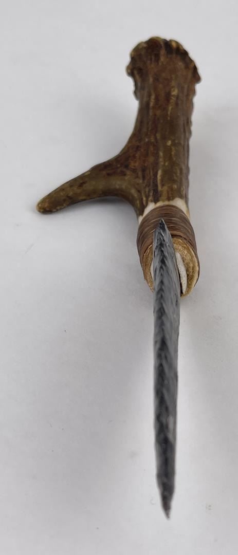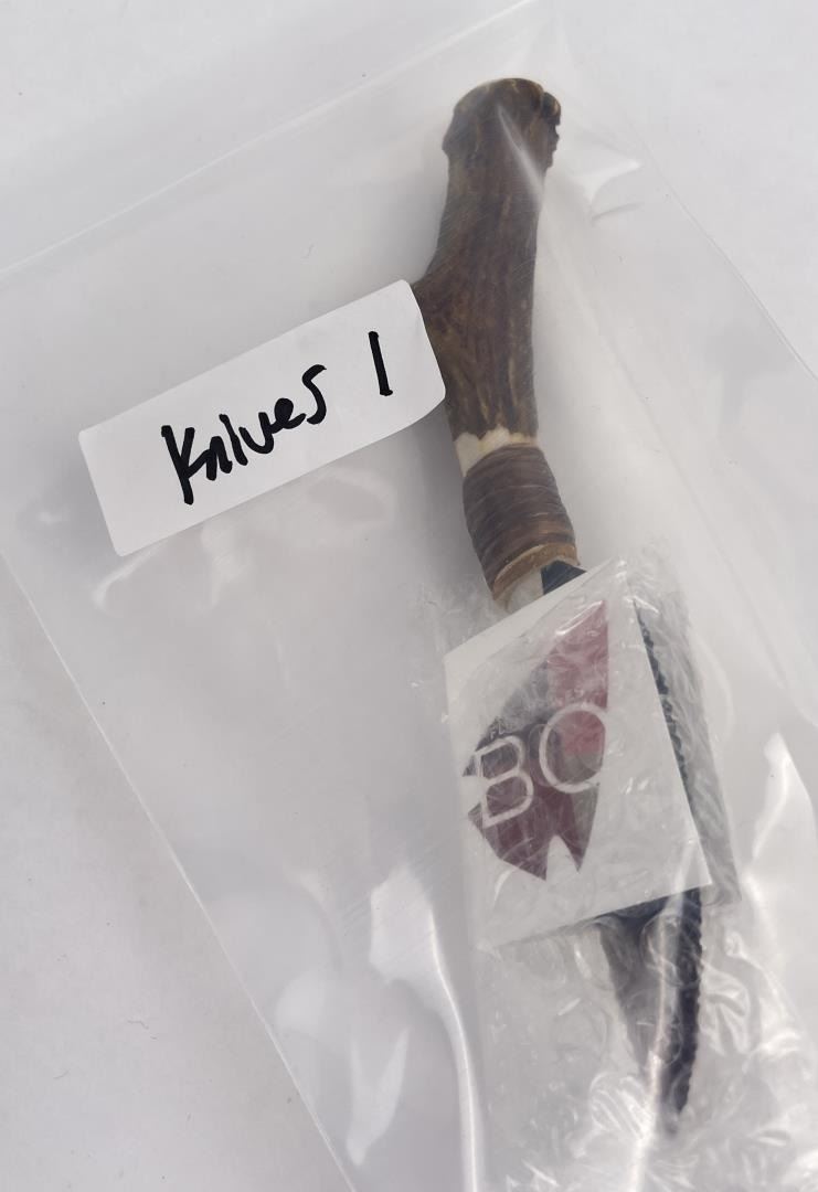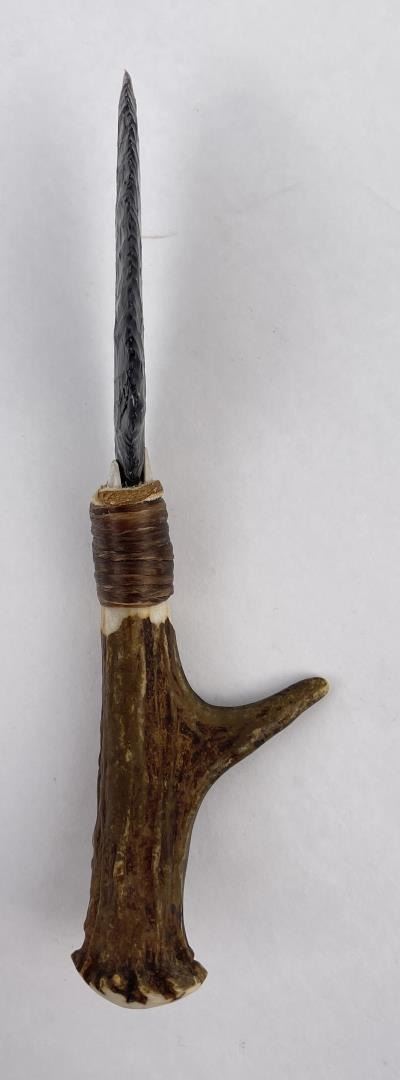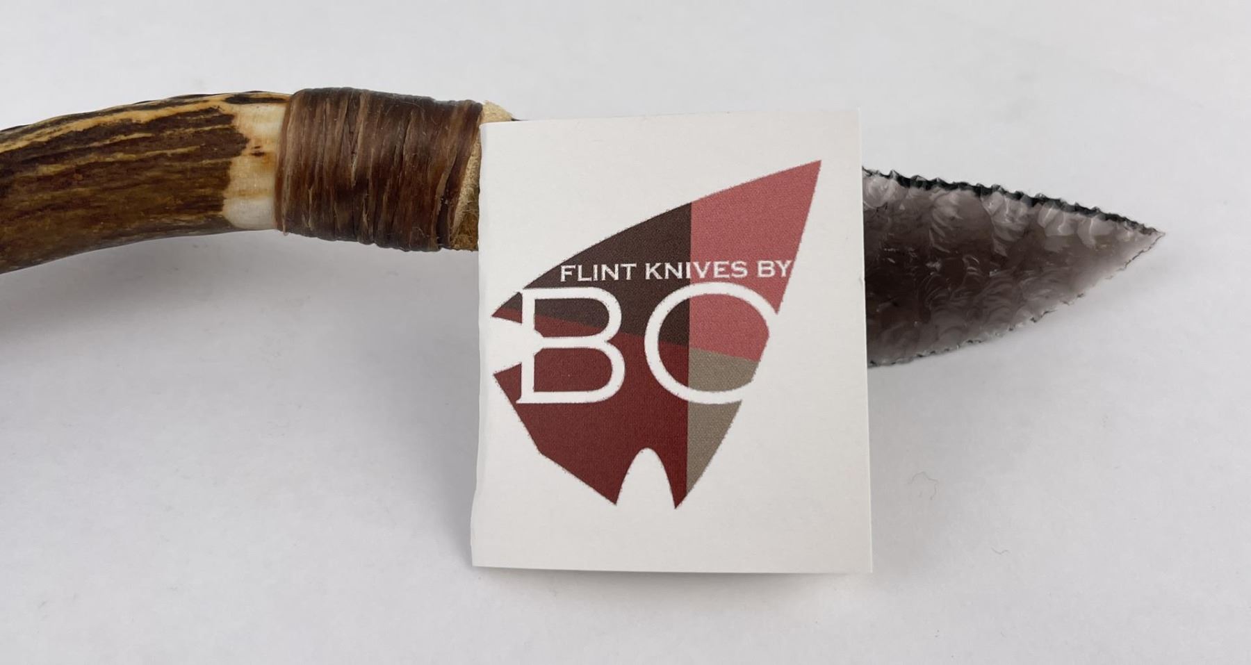 Handmade by Bo Earls. Bo is one of the finest modern flint and obsidian knappers. His knives are some of the nicest money can buy. The handle is whitetail deer horn. 7 1/4" long including handle.