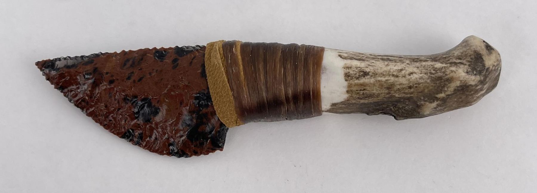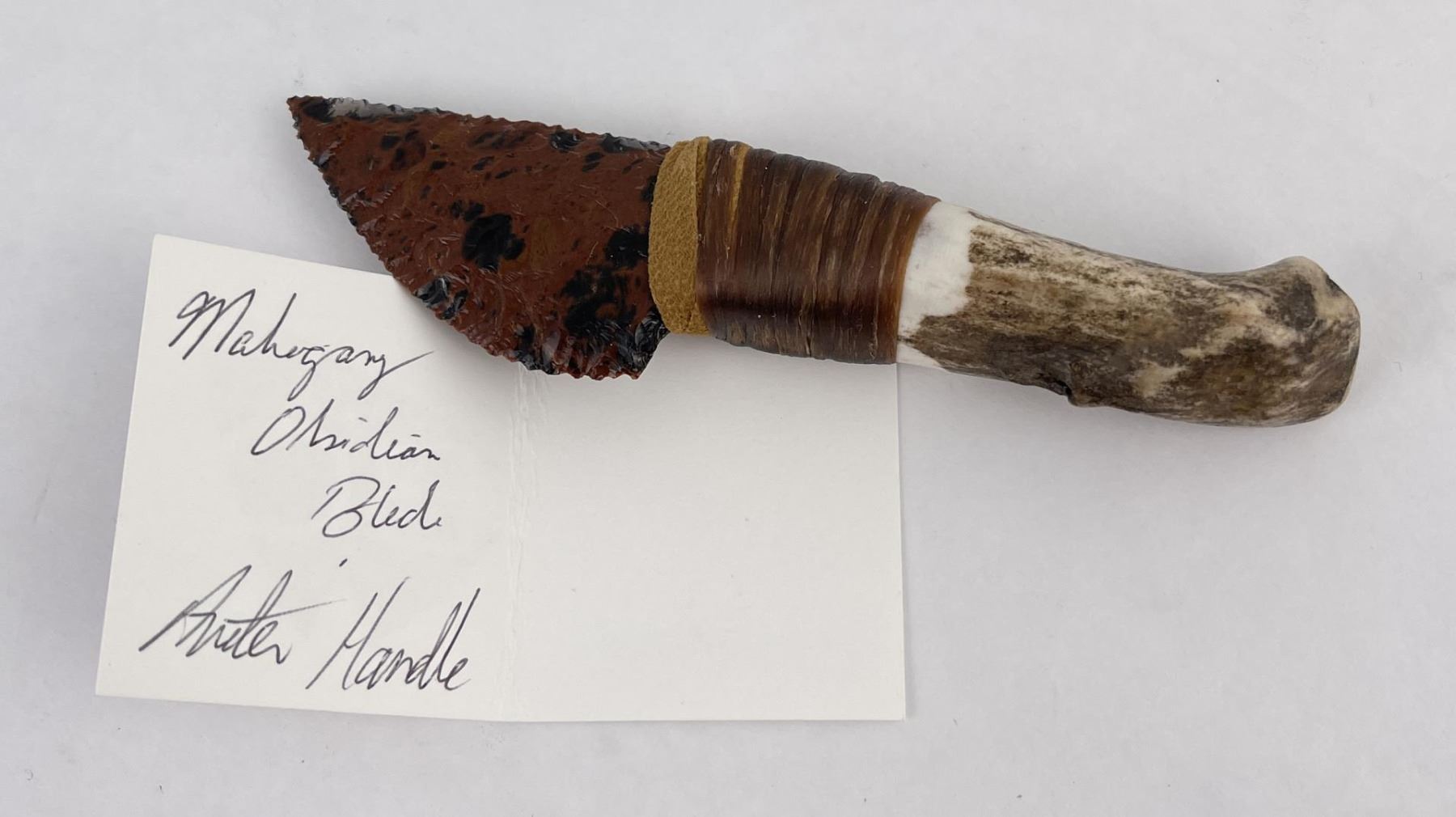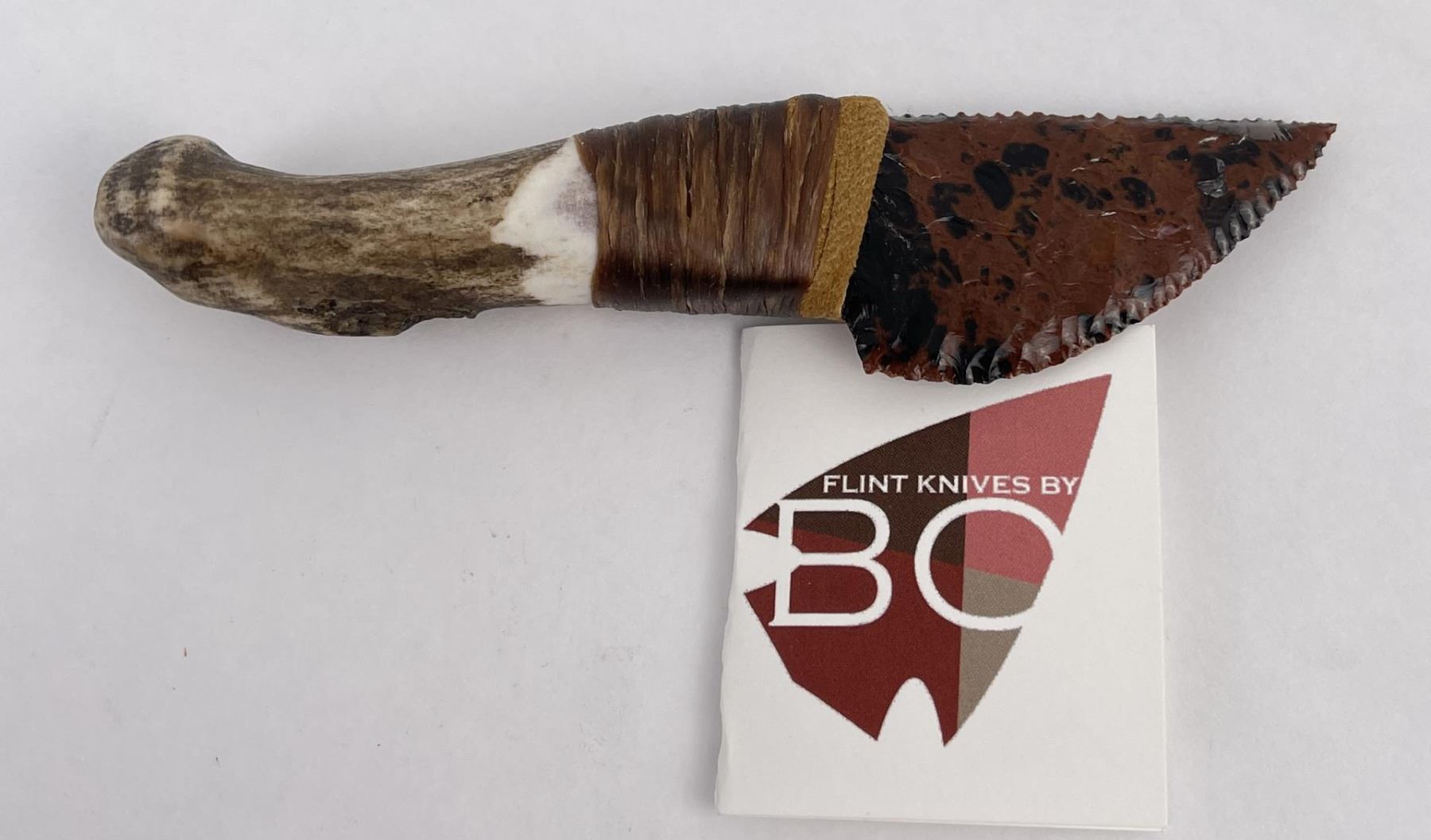 Handmade by Bo Earls. Bo is one of the finest modern flint and obsidian knappers. His knives are some of the nicest money can buy. The handle is whitetail deer horn. 5 1/8" long including handle.