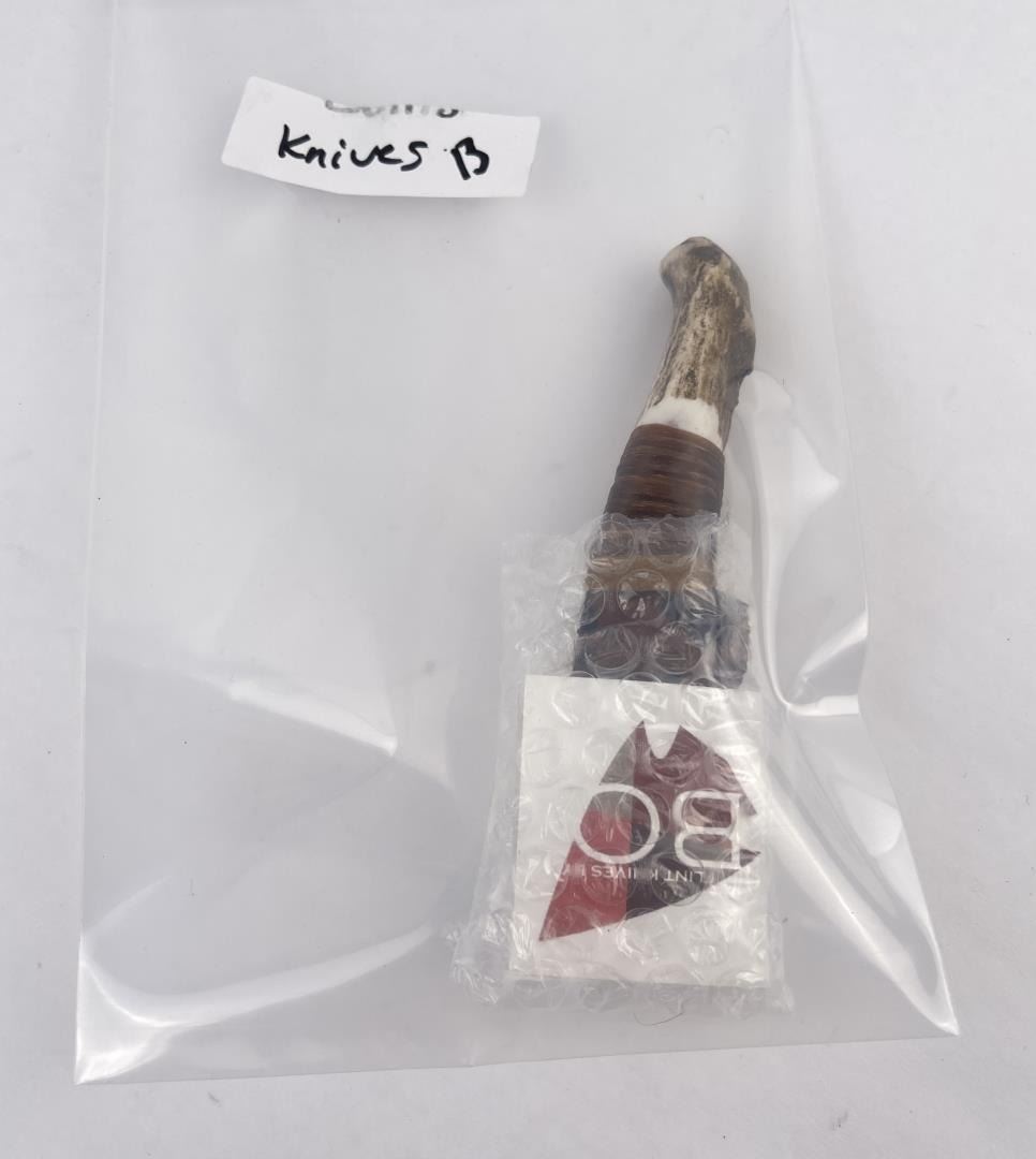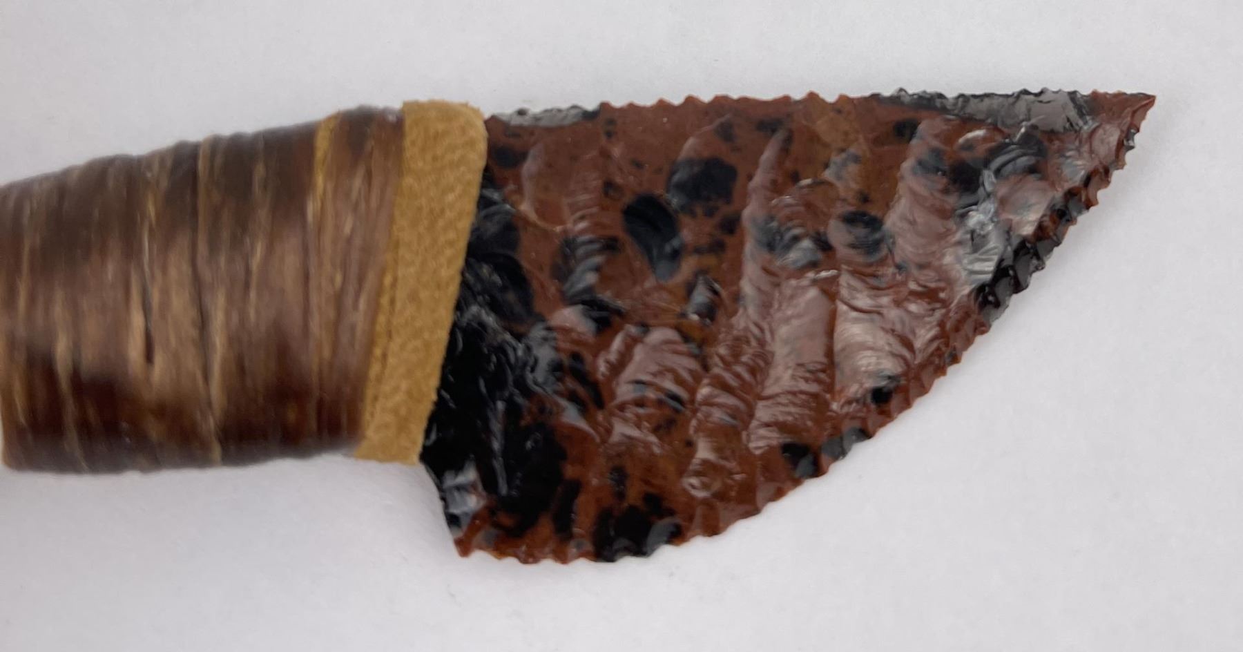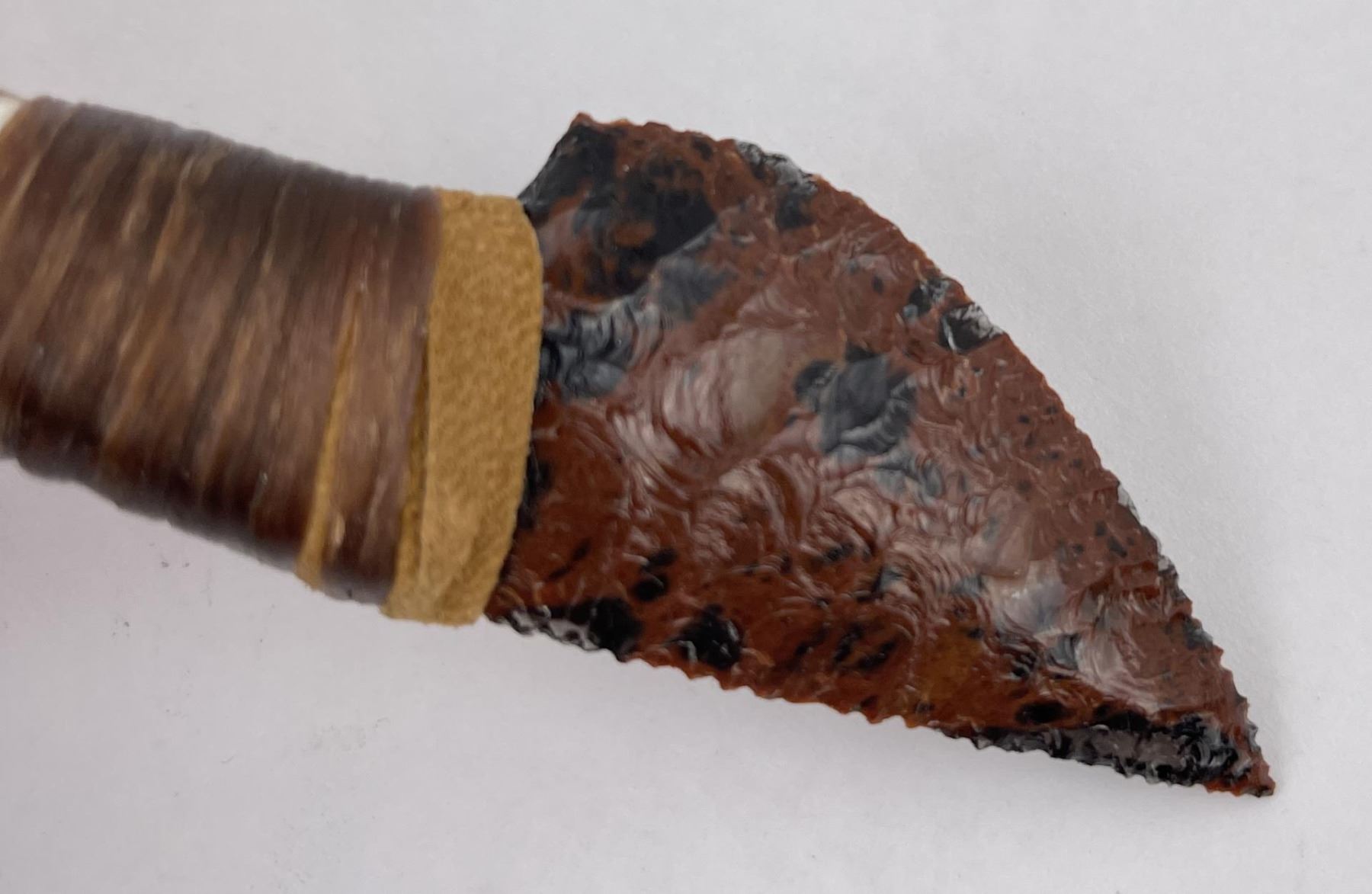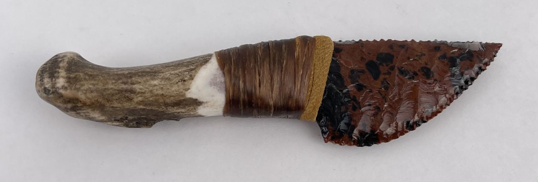 Handmade by Bo Earls. Bo is one of the finest modern flint and obsidian knappers. His knives are some of the nicest money can buy. The handle is whitetail deer horn. 5 1/8" long including handle.