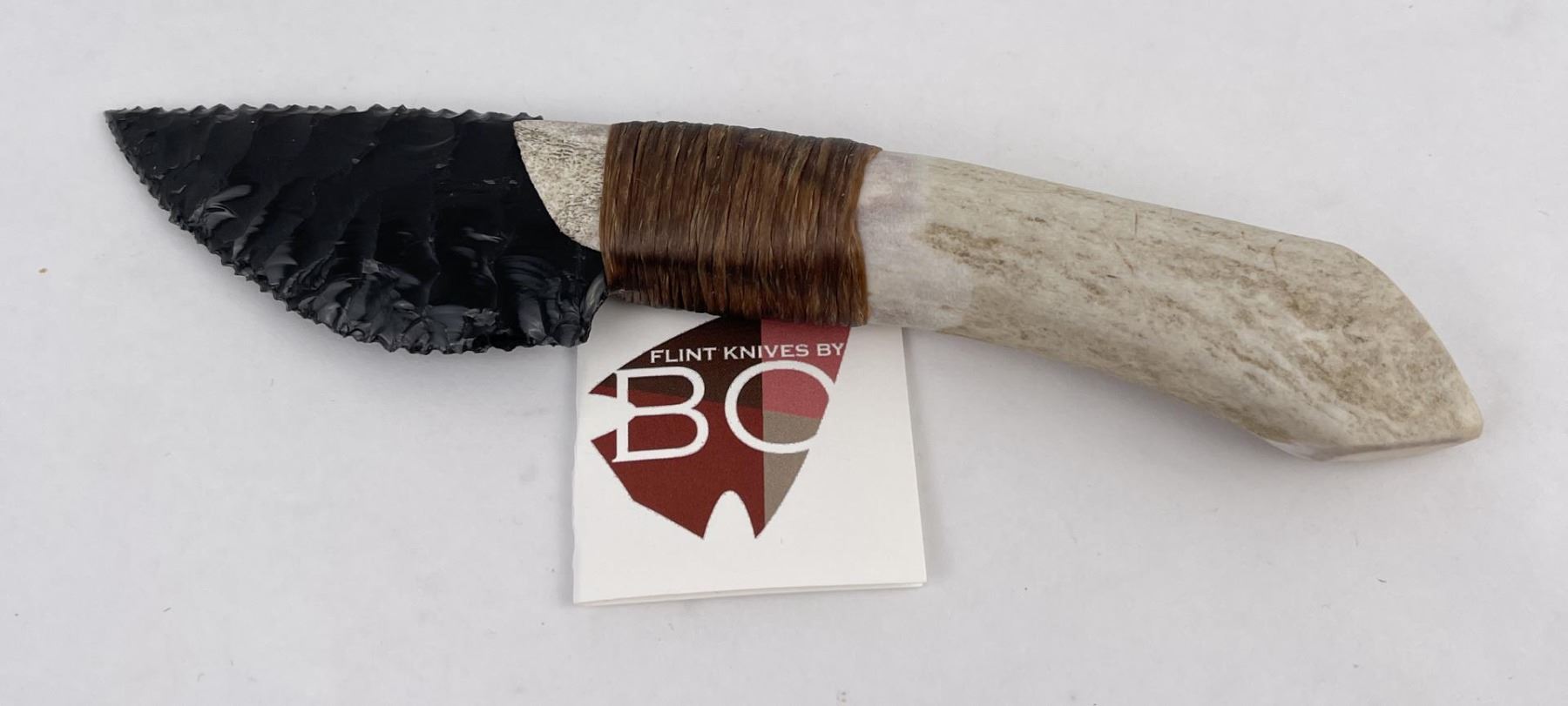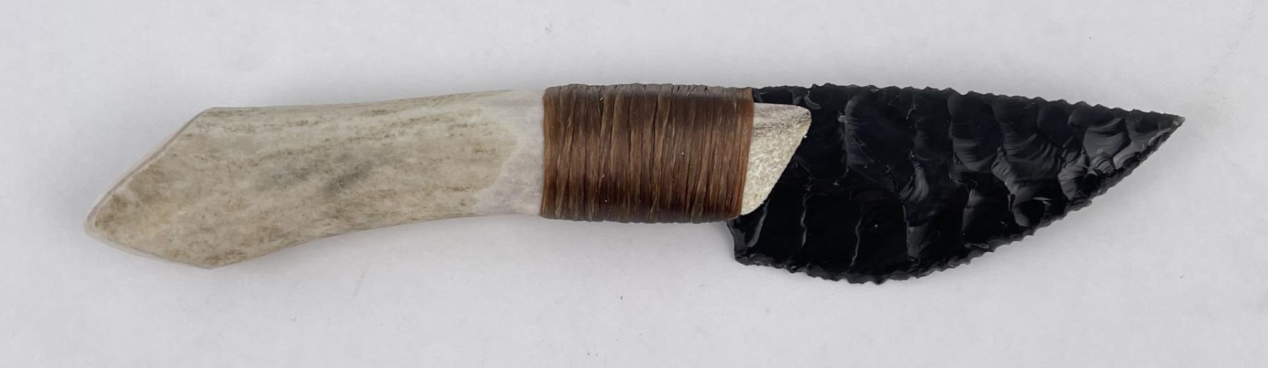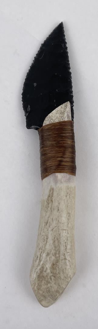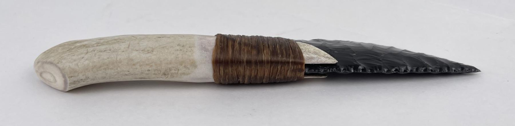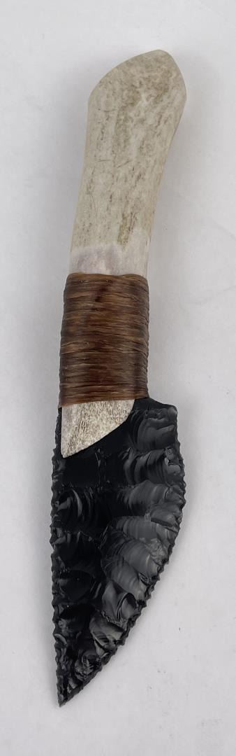 Handmade by Bo Earls. Bo is one of the finest modern flint and obsidian knappers. His knives are some of the nicest money can buy. The handle is whitetail deer horn. 7 5/8" long including handle.