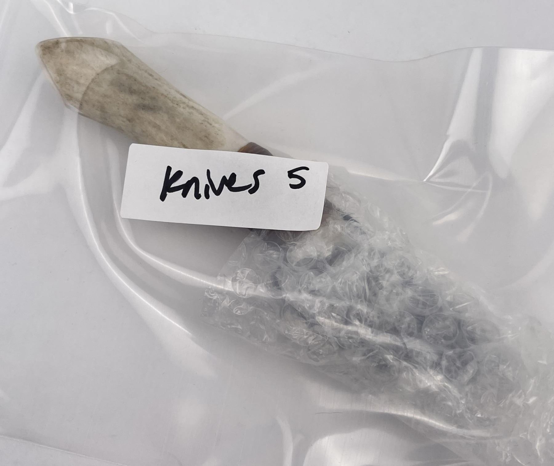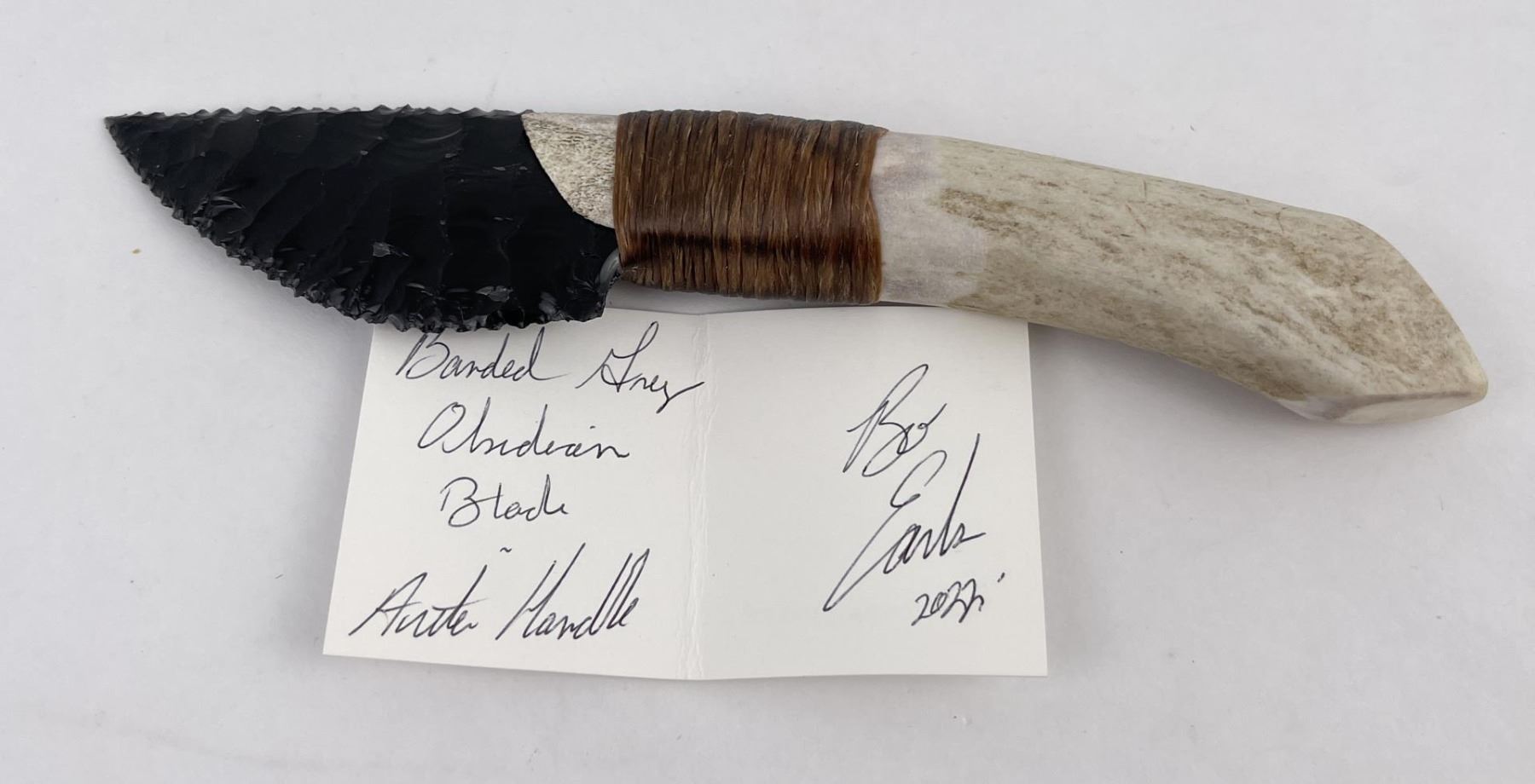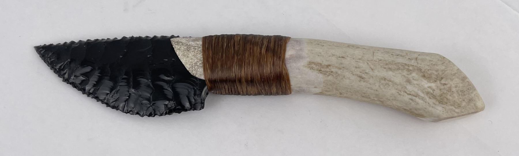Handmade by Bo Earls. Bo is one of the finest modern flint and obsidian knappers. His knives are some of the nicest money can buy. The handle is whitetail deer horn. 7 5/8" long including handle.