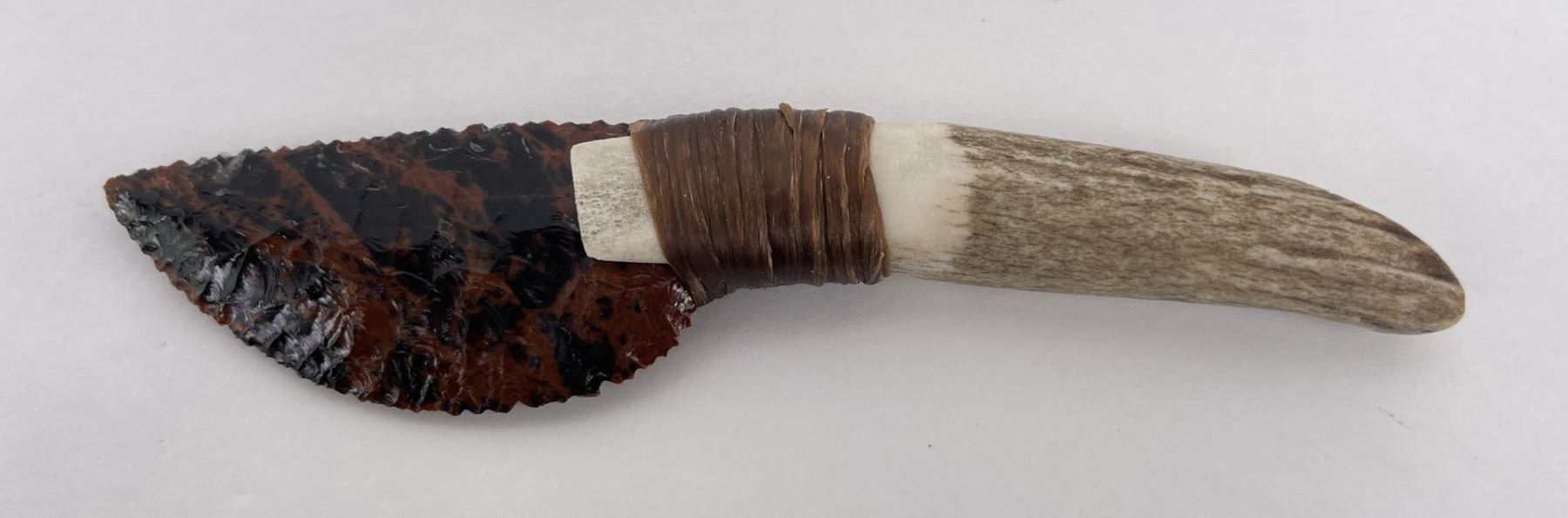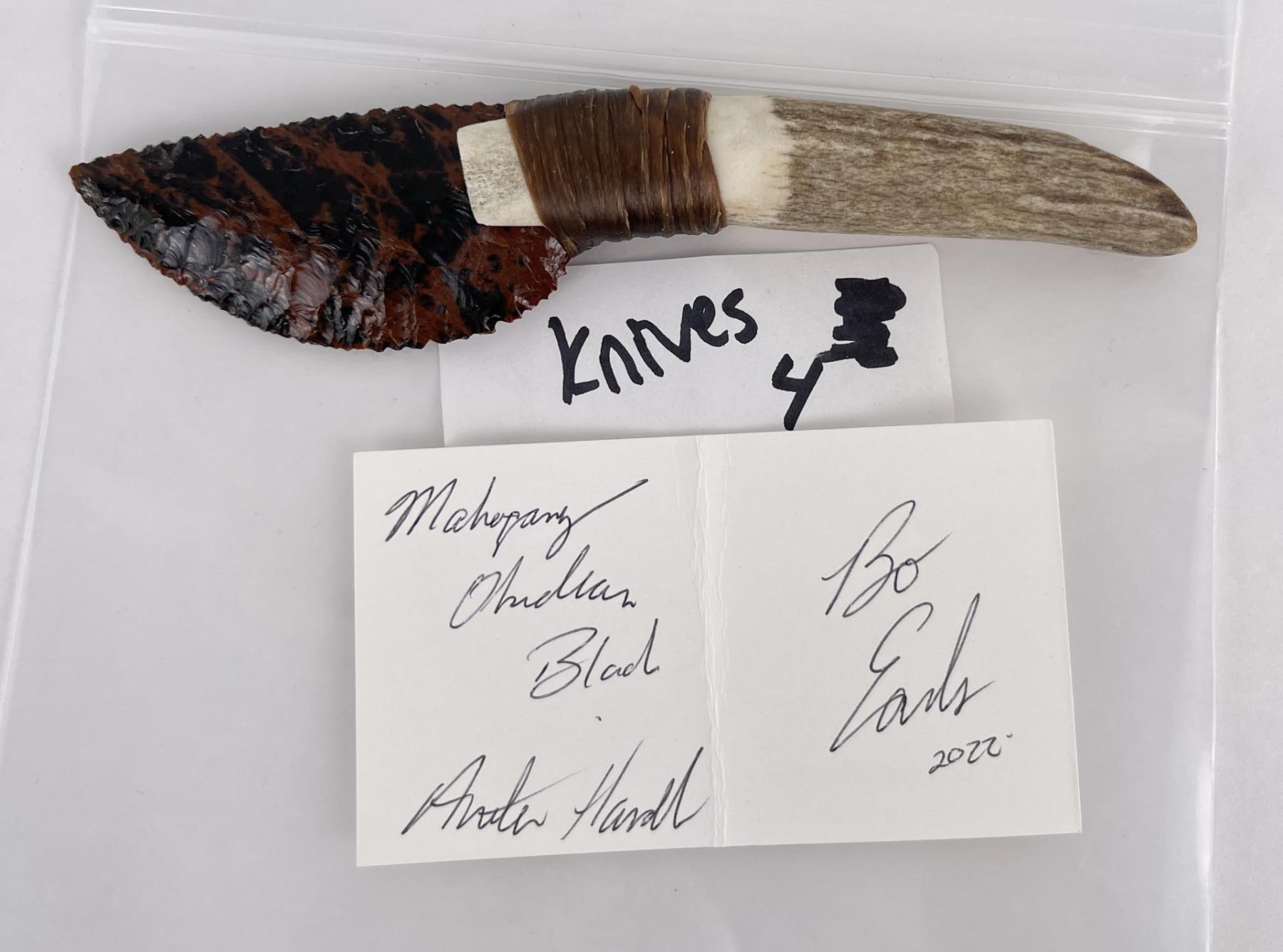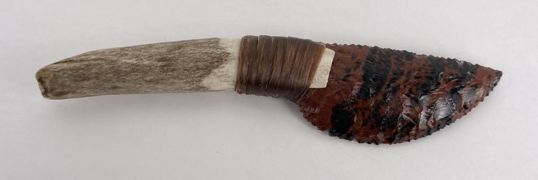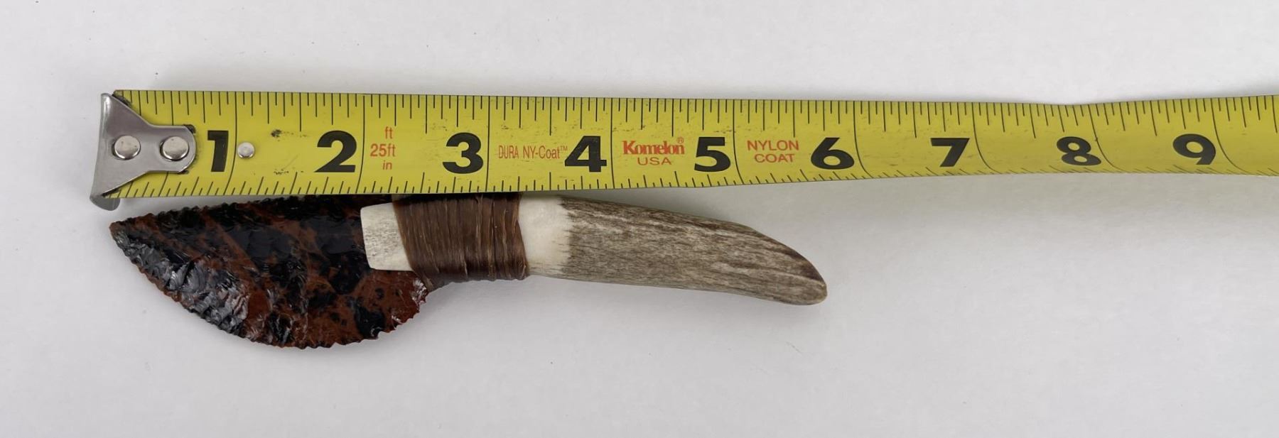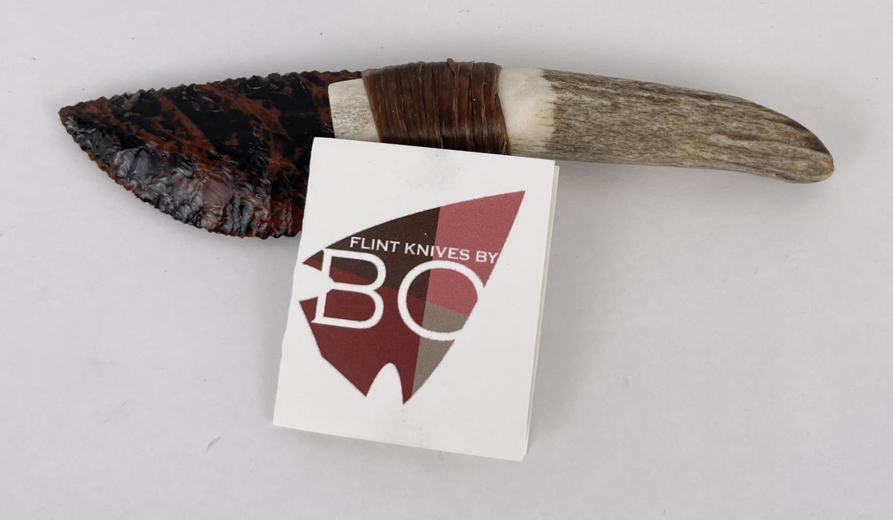 Handmade by Bo Earls. Bo is one of the finest modern flint and obsidian knappers. His knives are some of the nicest money can buy. The handle is whitetail deer horn. 5 1/2" long.