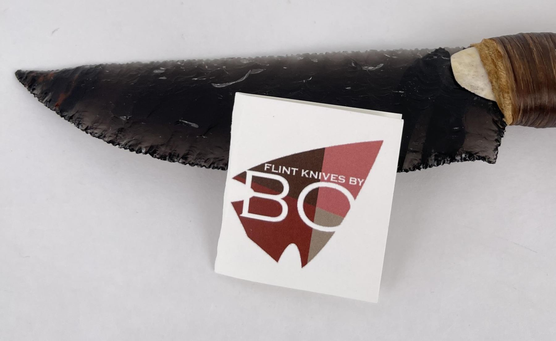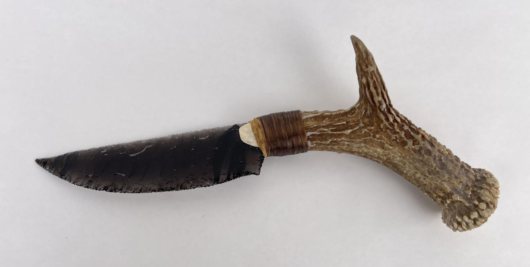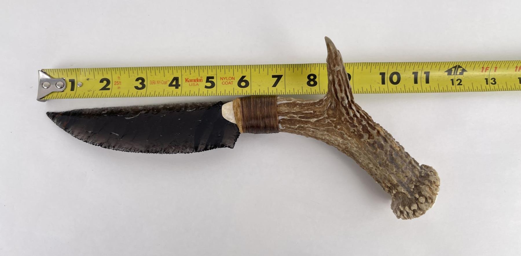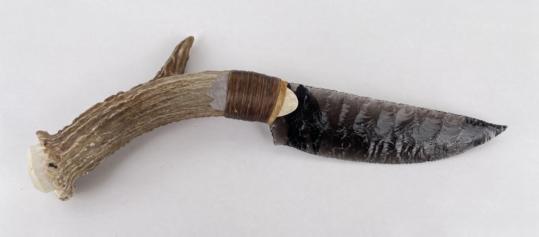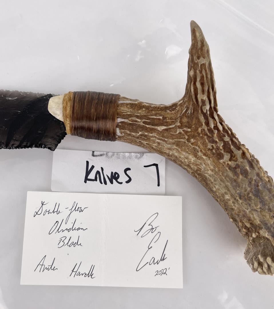 Handmade by Bo Earls. Bo is one of the finest modern flint and obsidian knappers. His knives are some of the nicest money can buy. The handle is whitetail deer horn. 11" long including handle.