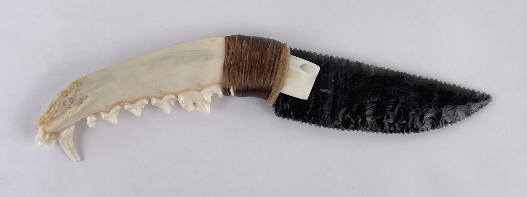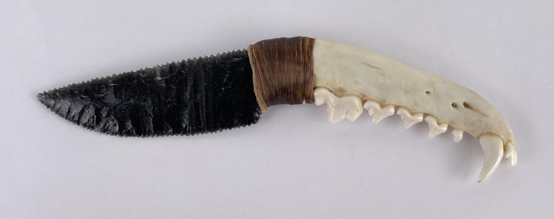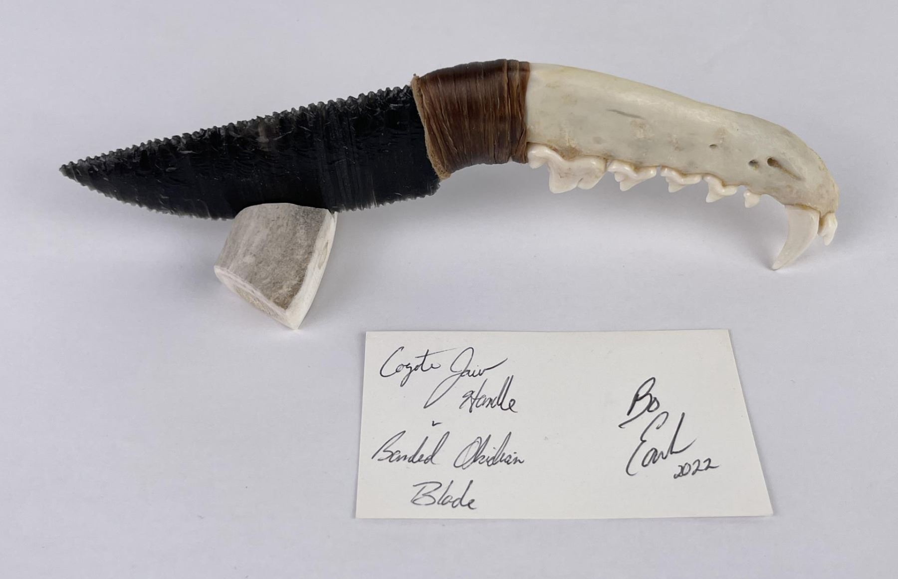 Handmade by Bo Earls. Bo is one of the finest modern flint and obsidian knappers. His knives are some of the nicest money can buy. The handle is Coyote Jaw. 7.75" long including handle.