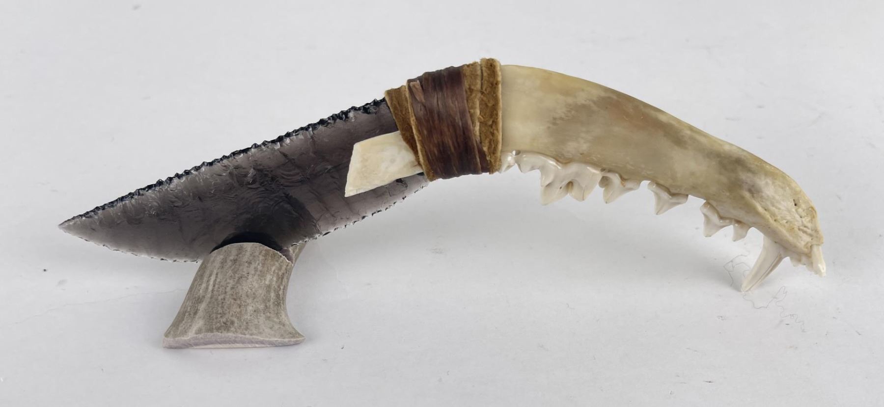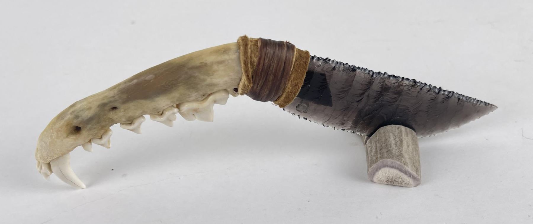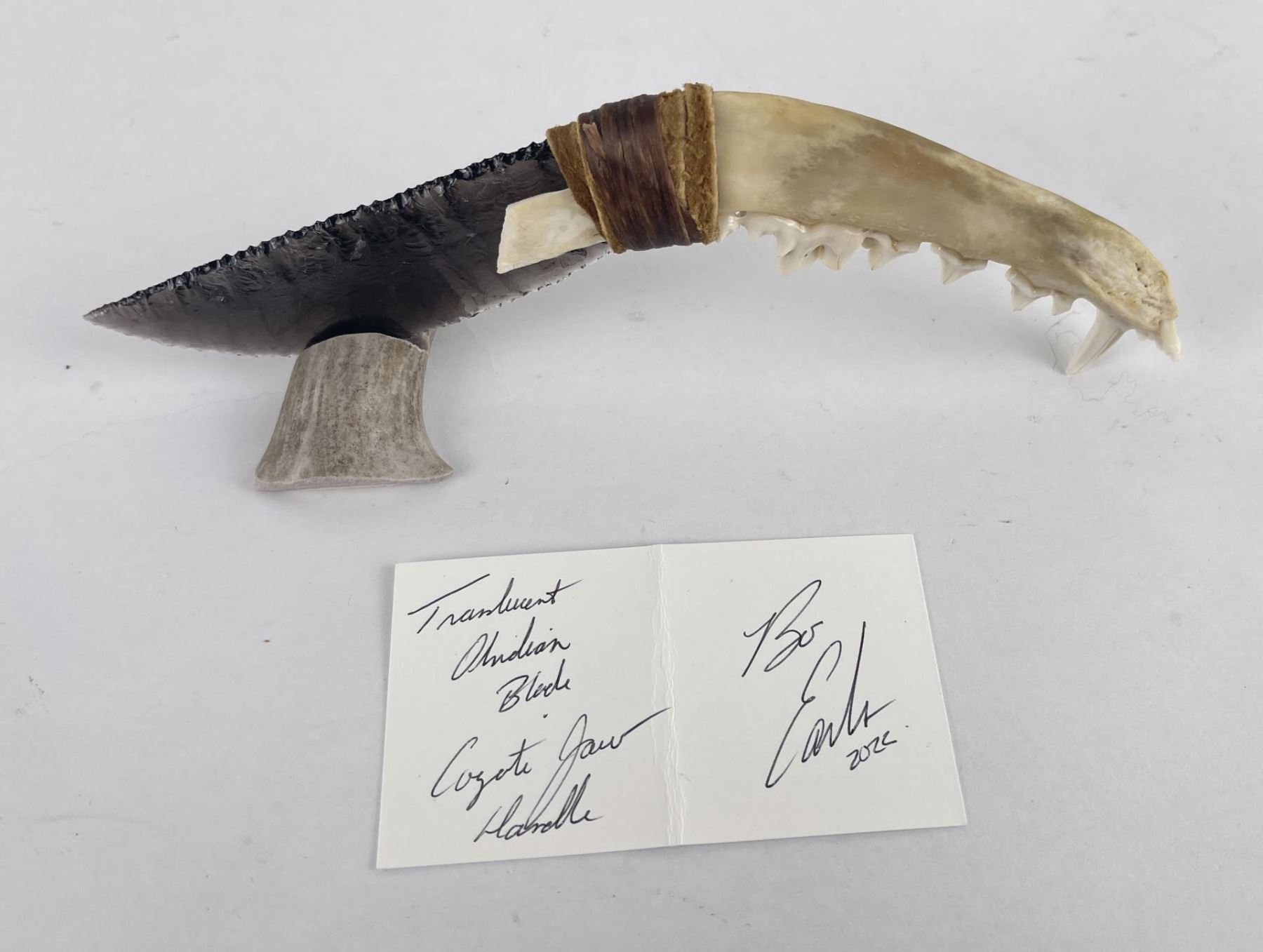 Handmade by Bo Earls. Bo is one of the finest modern flint and obsidian knappers. His knives are some of the nicest money can buy. The handle is Coyote Jaw. 7 1/2" long including handle.