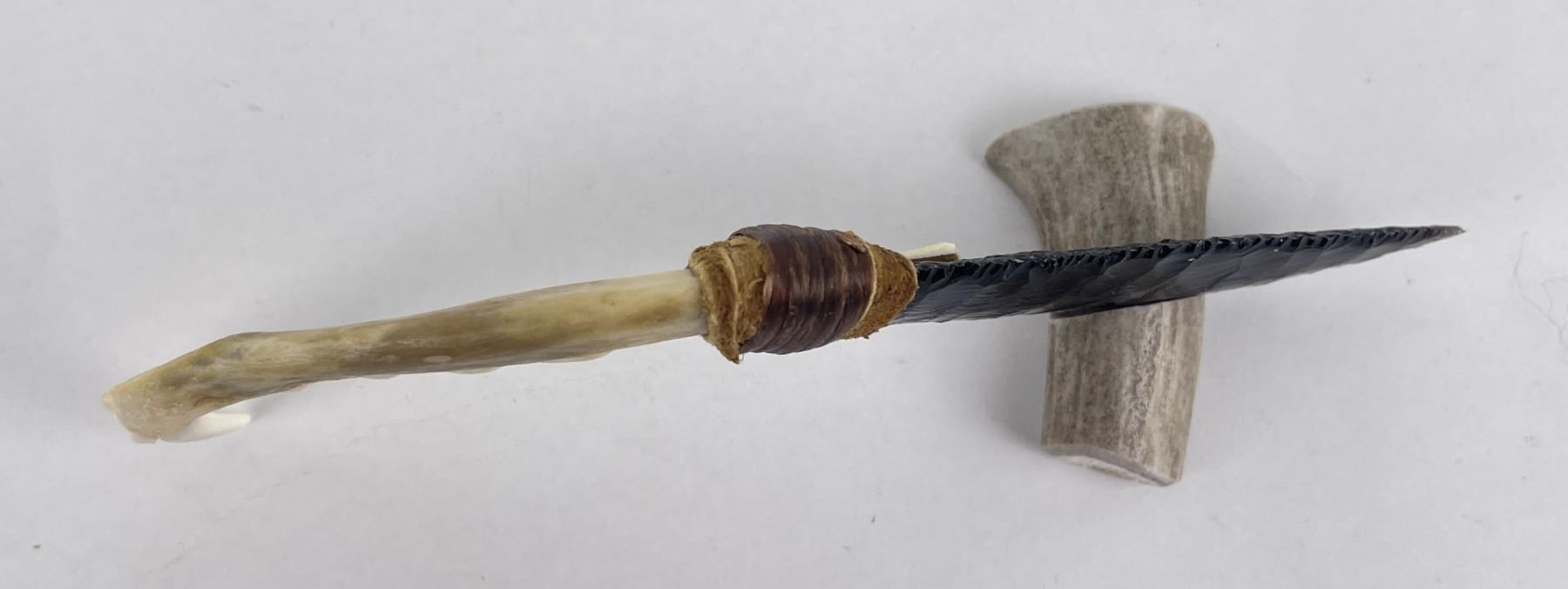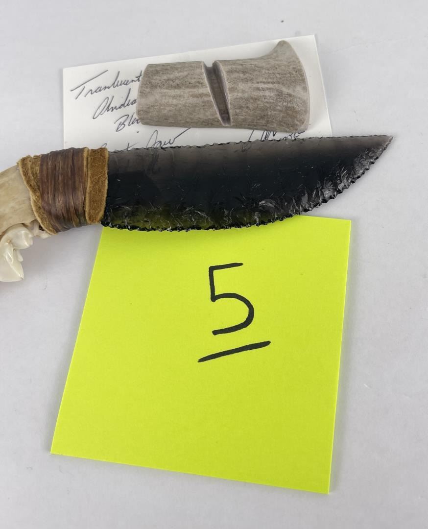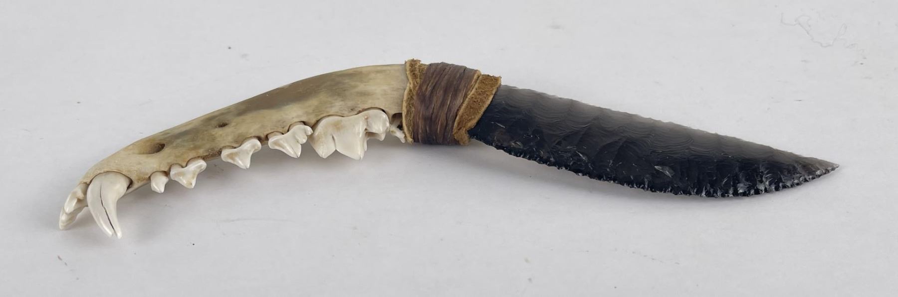 Handmade by Bo Earls. Bo is one of the finest modern flint and obsidian knappers. His knives are some of the nicest money can buy. The handle is Coyote Jaw. 7 1/2" long including handle.