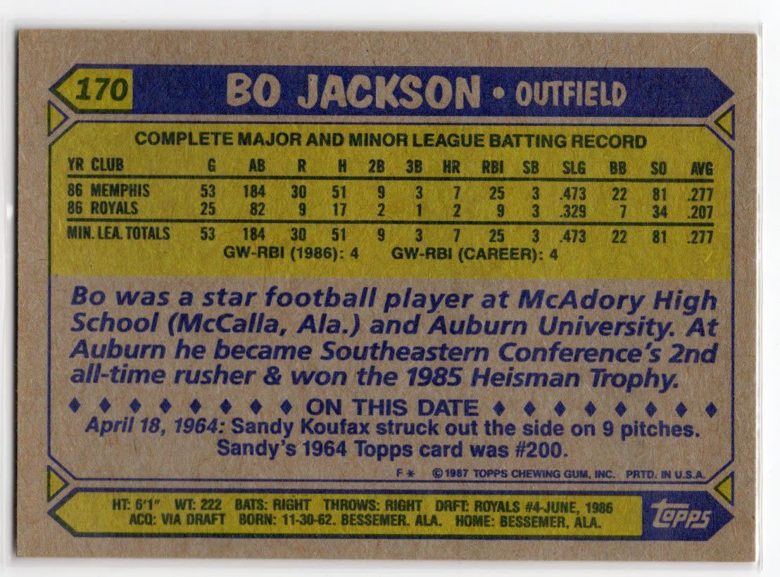 Bo Jackson ROOKIE CARD 1987 Topps Card number 170