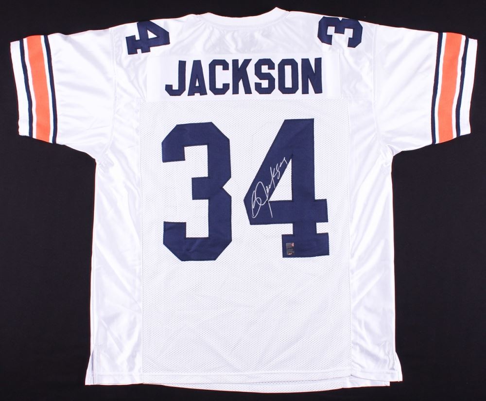 Custom on-field style jersey. Everything is sewn on, size XL. Hand-signed in silver paint pen by Bo Jackson (Raiders).Â