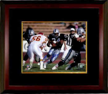 Bo Jackson was the first athlete to be named an All-Star in two major American sports and he won the Heisman Trophy in 1985. In 1989 and 1990, Jackson's name became known beyond just sports fans through the "Bo Knows" advertising campaign, a series of advertisements by Nike, that starred Jackson alongside Rock and Roll Hall of Fame musician, Bo Diddley, promoting a cross-training athletic shoe named for Jackson. Bo Jackson has hand signed this Oakland Raiders 8x10 Photo. Steiner Sports Hologram and Certificate of Authenticity. Custom Black Mat and Premium Mahogany Color Framed as shown.