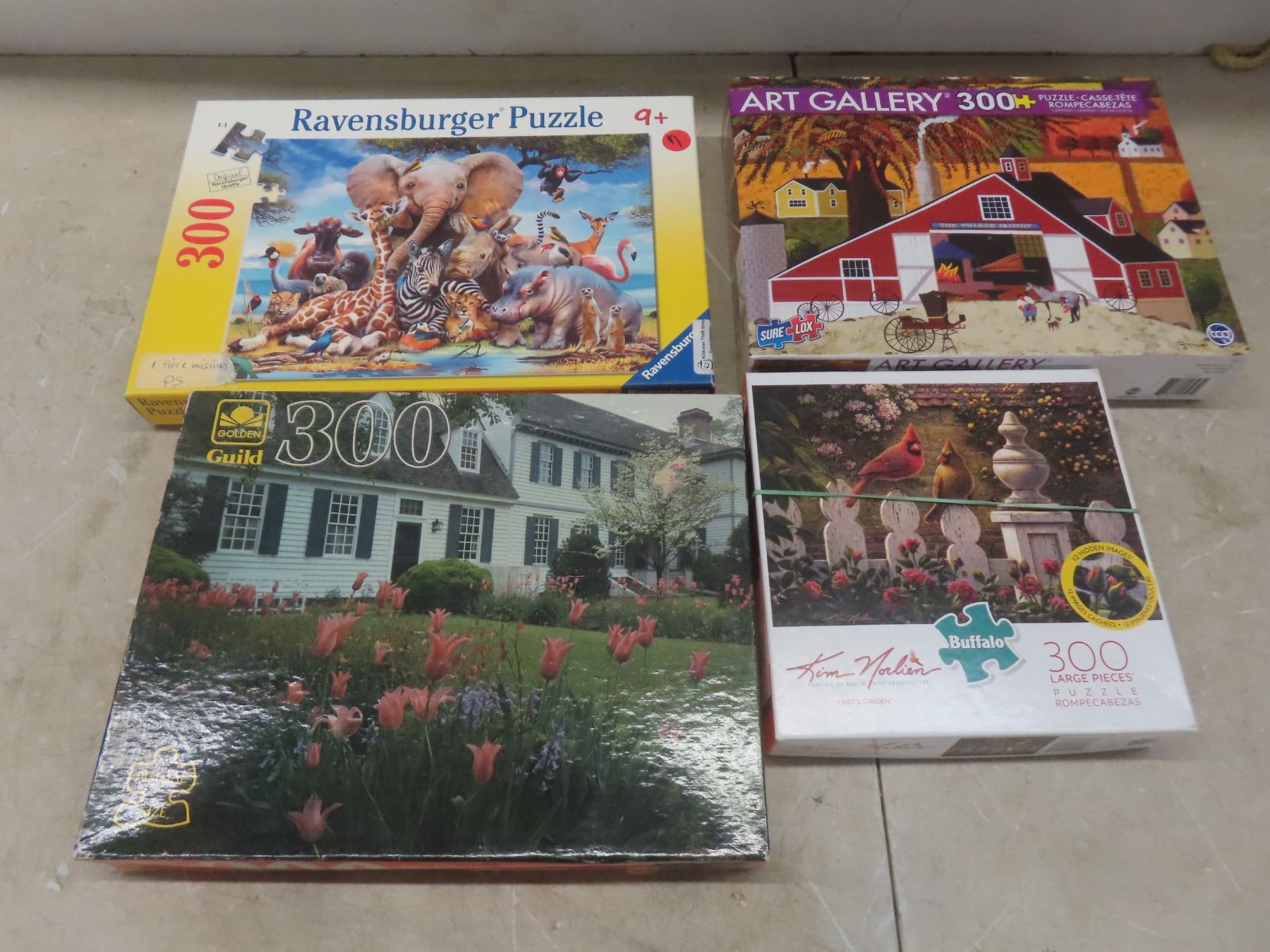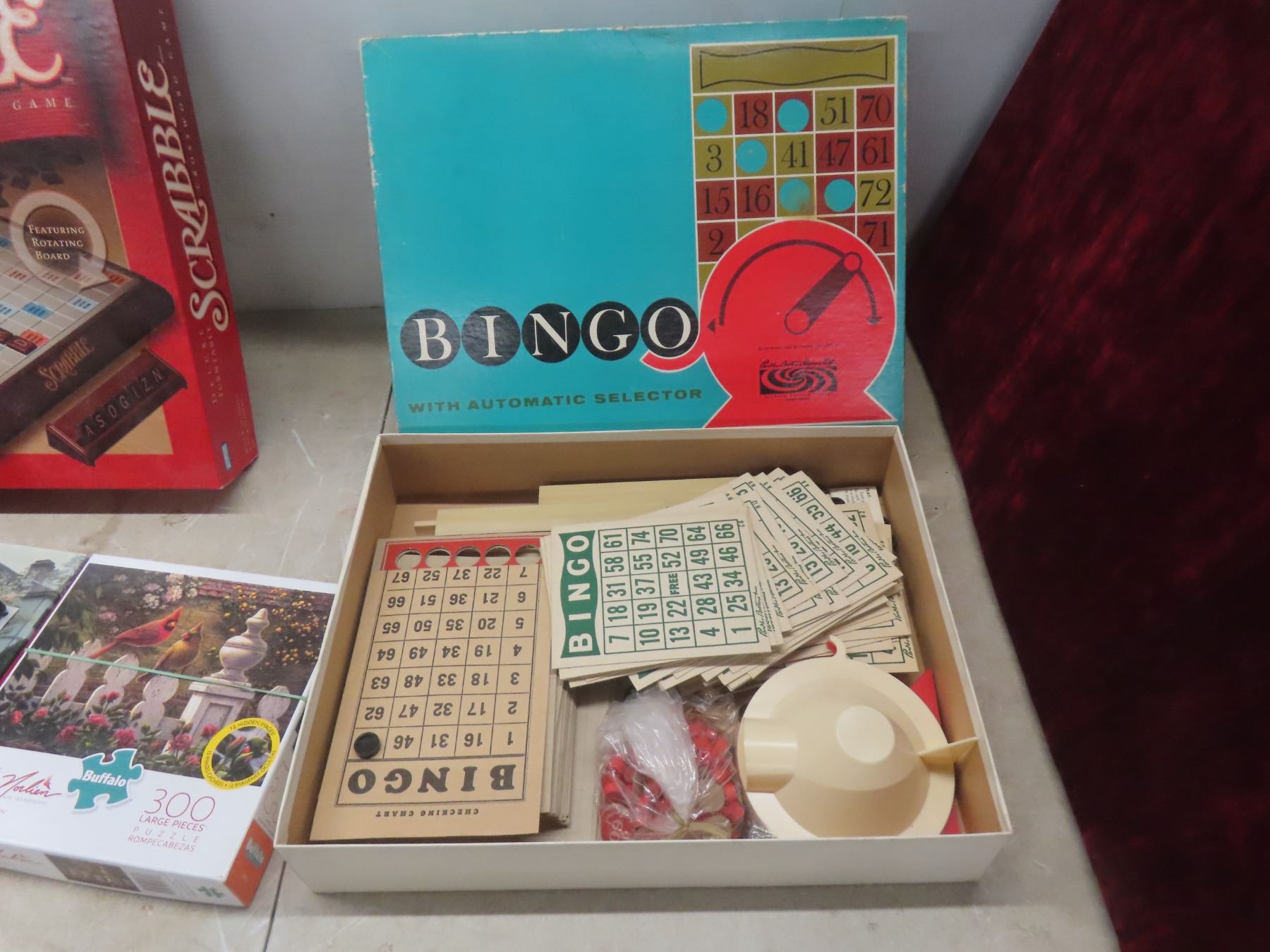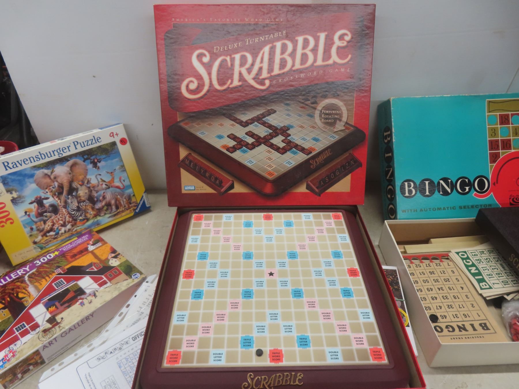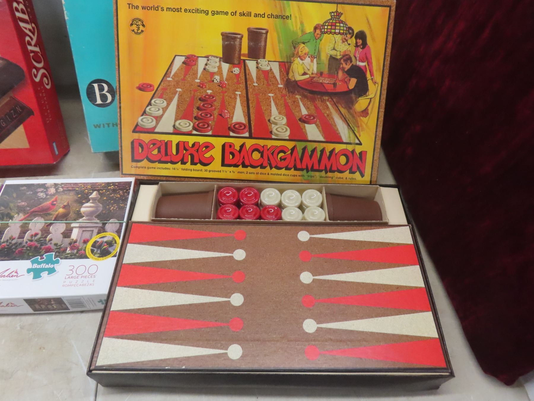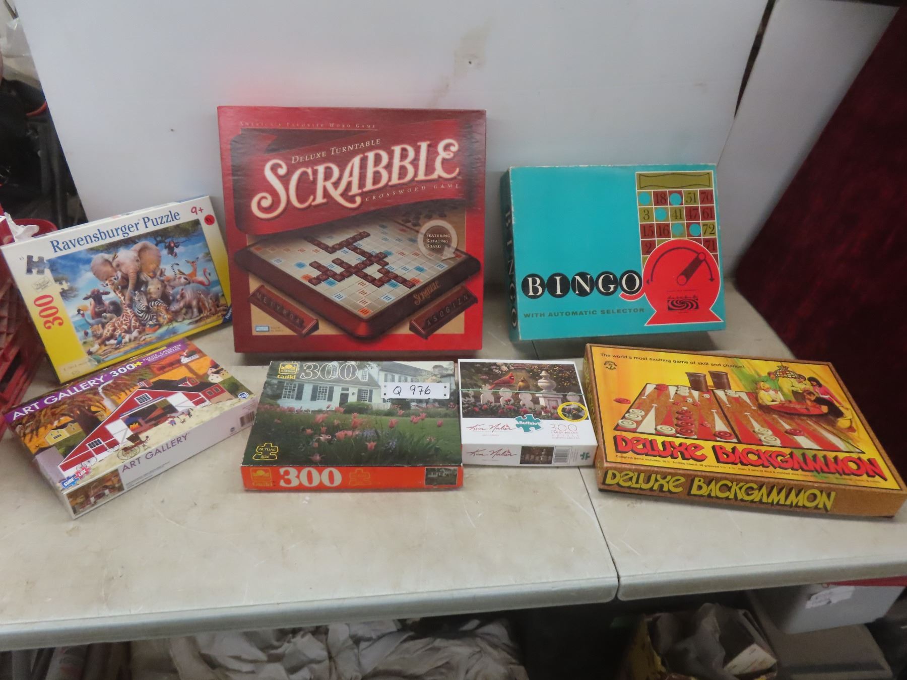 Board Games Lot—Scrabble, Bingo, Backgammon—and Four Jigsaw Puzzles.