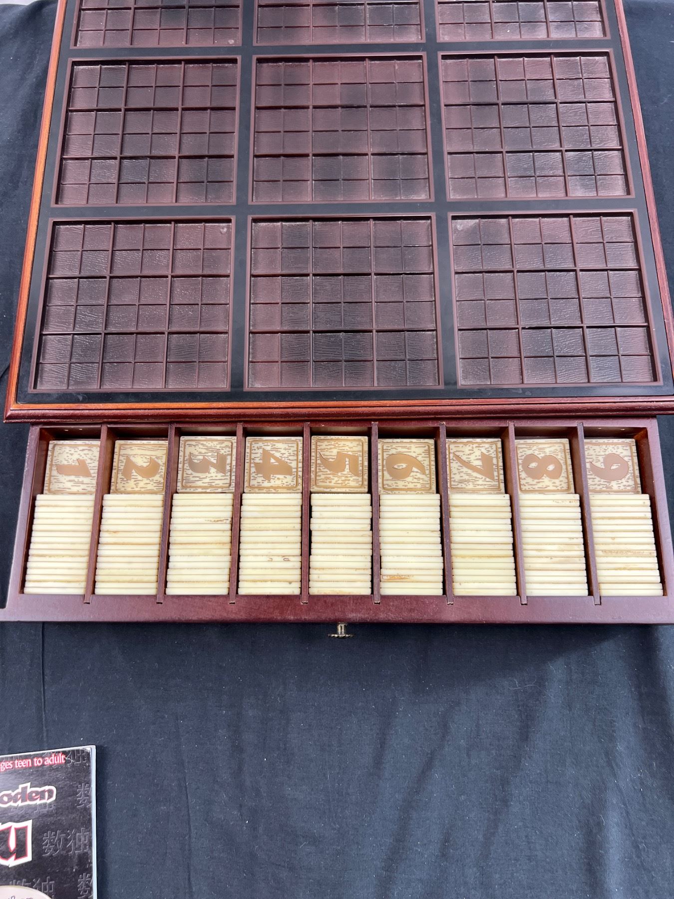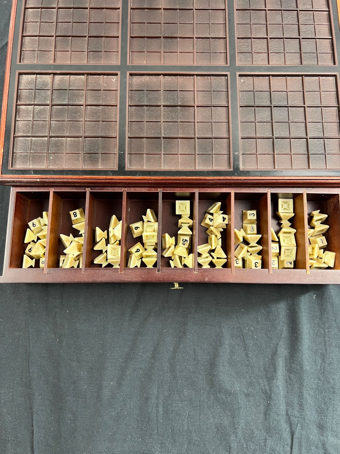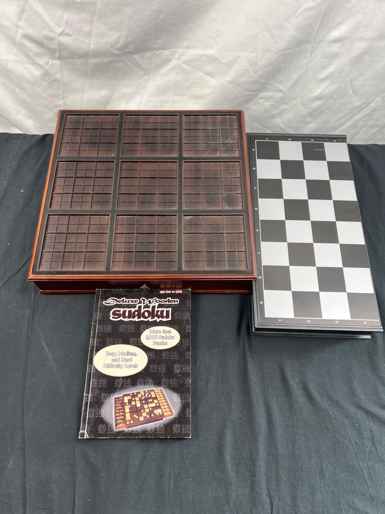 Includes Deluxe Wooden Sudoku set which is less than a year away from being vintage as well as a portable chess set. Unknown if all numbers are present in Sudoku board.