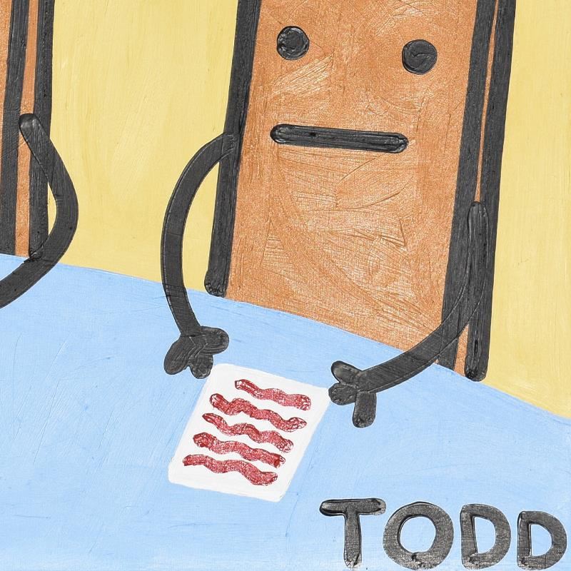 "Board Meeting" is an original acrylic painting on gallery wrapped canvas by Todd Goldman, hand signed by the artist. Includes Letter of Authenticity. Measures approx. 48" x 36" (image). Due to the way this piece was stored there may be minor wear or signs of age (such as wear on the corners) but the piece is in overall good condition.