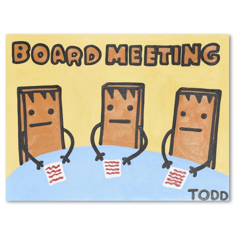 "Board Meeting" is an original acrylic painting on gallery wrapped canvas by Todd Goldman, hand signed by the artist. Includes Letter of Authenticity. Measures approx. 48" x 36" (image). Due to the way this piece was stored there may be minor wear or signs of age (such as wear on the corners) but the piece is in overall good condition.