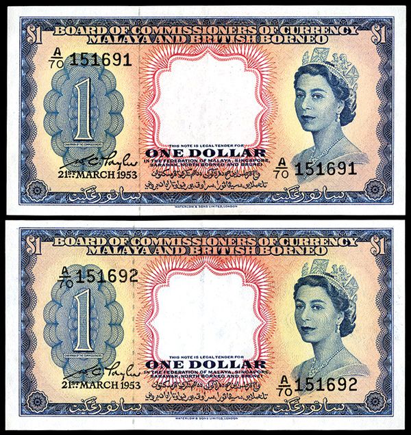 Board of Commissioners of Currency, 1953 Issued Sequential Banknote Pair.
