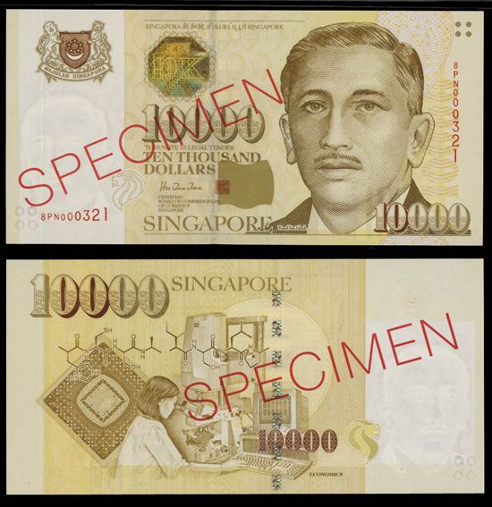 Singapore, ND (1999), $10,000, P-44s KNB42c, Specimen banknote, Light brown and m/c with gold foil hologram on top left middle, portrait of Yusof bin Ishak on right, back with technology vignette of computer chip research, red SPECIMEN overprint, S/N 8PN000321, PMG graded Superb Gem Uncirculated 67 EPQ, amazing grade in any issue. Attractive banknote.