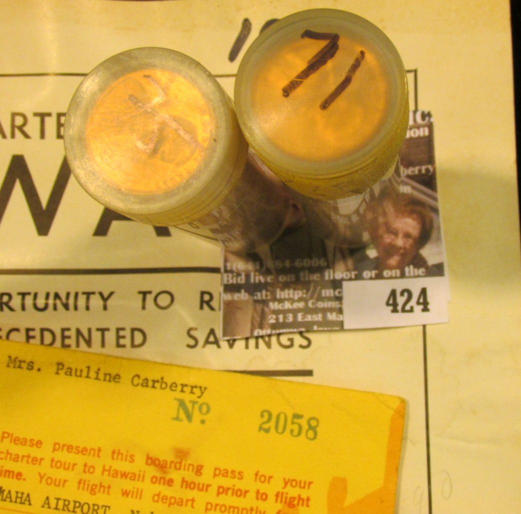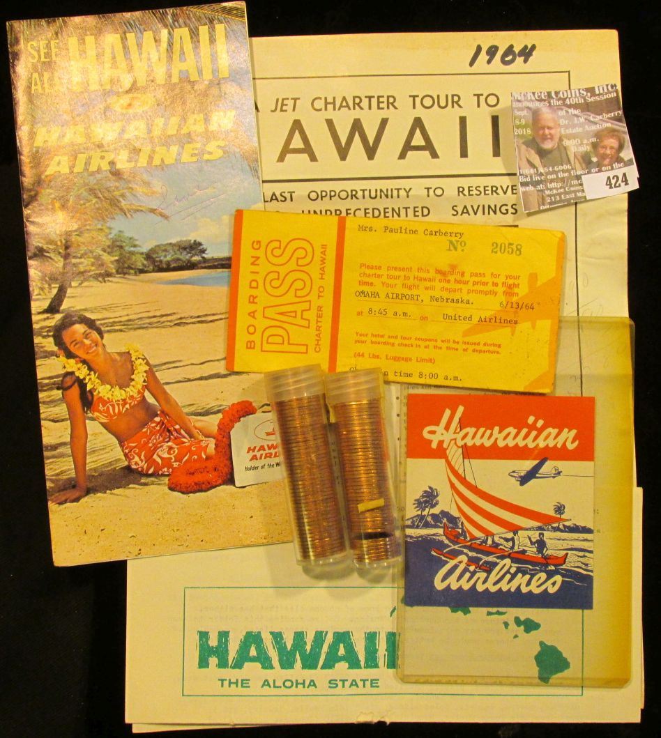 Boarding Pass Charter to Hawaii dated 1964 for Pauline Carberry, Map, and label for "Hawaiian Airlines"; 1971 P & 75 P Brilliant Uncirculated Rolls of Lincoln Cents.