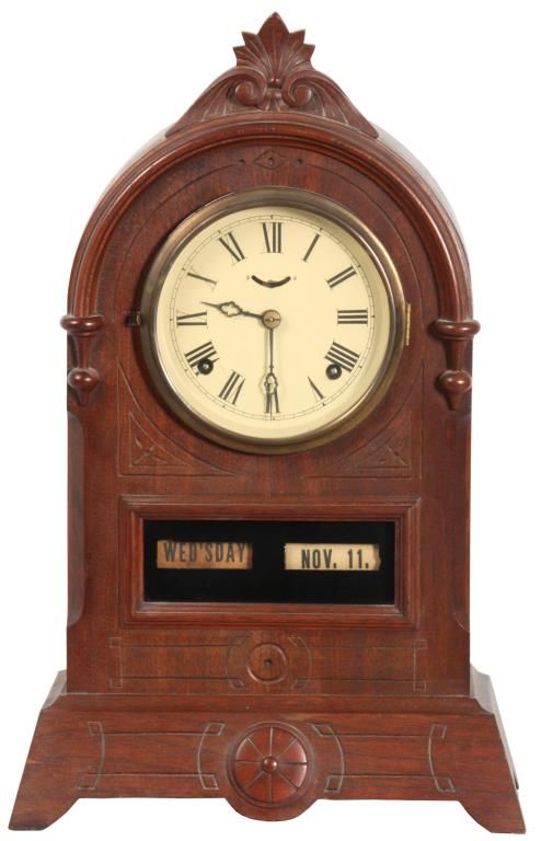 Boardman & Hubbell Calendar Shelf Clock. 5 in. painted metal dial has black Roman hour numerals and original blued & pierced hands, 30 day, double spring, time only pierced brass movement has fancy shaped plates, lever escapement with good balance wheel, brass covered pendulum bob; lower 1 year, calendar mechanism has a long 366 Date & month roll beside a 14 Day cylinder which rotates once every 2 weeks. In a walnut case with arched top with teardrop finials on the front, carved crest and splayed base with incised design and center rosette; hinged brass dial bezel with door glass and lower reverse painted glass panel with open apertures exposing the lower calendar labels. In very good condition and original finish, dial repainted. 19.75 in. high x 12.5 in. wide x 5.5 in. deep.