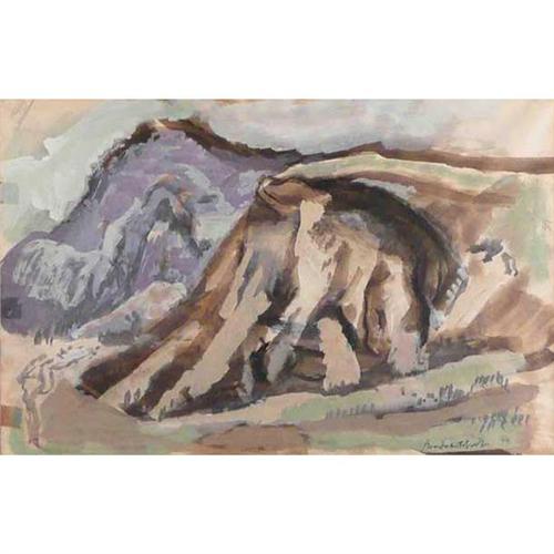 Boardman Robinson(1876-1952) Broadmoor Art Academy, Watercolor, "Erosion", 1937, 12 3/4" x 20"Signed and Dated lower left, Kraushaar Gallery label on verso, NY,Tape marks on left side margin.