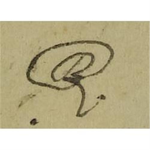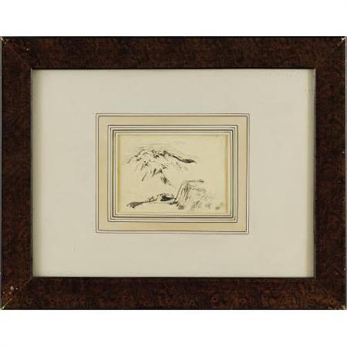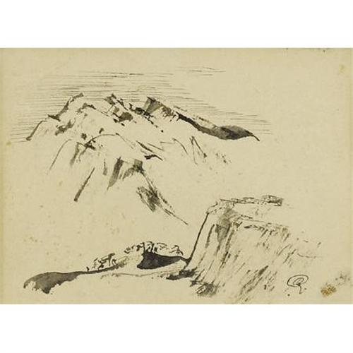 <B>Boardman Robinson (American, 1876-1952)</B></I><BR><I>Miniature Sketch of the Garden of the Gods</B></I><BR>Brush and ink <BR>3-1/2 x 5 inches (8.9 x 12.7 cm)<BR>Monogrammed at lower right<I>: BR</B></I><BR> Inscribed verso: <I>For Miss Leanning and Mrs. Lee/ Happy Christmas/ and/ a Happier New Year / Sally and Michael Robinson</B></I><BR><B>Condition Report:</B> Masking tape to top and bottom, old cellephane tape to corners, and loss at one corner<BR><BR><b>Shipping:</b> Requires 3rd Party Shipping (<a target="_blank" href="http://www.heritageauctions.com/common/shipping.php">view shipping information</a>)