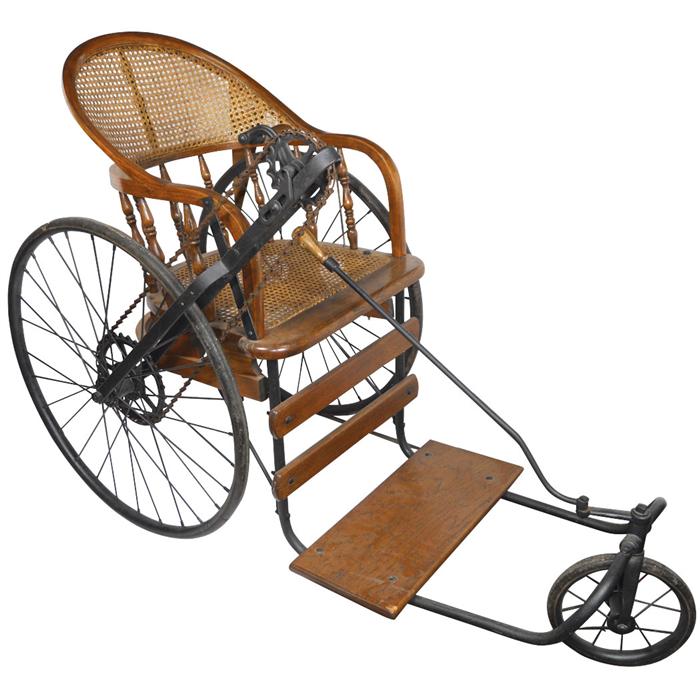 Boardwalk cane seated riding chair, 3-wheeler w/front wheel steer & drive crank on side, older restoration, c.1910, Exc cond, 39"H x 26"W x 57"L.