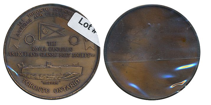 Presentation medal. Obv: 1st. TORONTO INTERNATIONAL ANTIQUE & CLASSIC BOAT SHOW. THE ROYAL CANADIAN ANTIQUE AND CLASSIC BOAT SOCIETY, TORONTO, ON. Uniface. Brass. 76mm. AU.