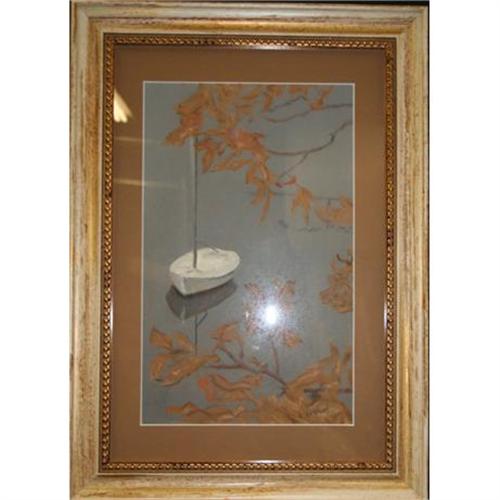 </font></strong>Rose Brown?s original pastel drawing entitled ?Boat Through the Trees? captures a lone sailboat without sails floating peacefully on the water as seen through aging tree branches in the foreground. Brown has rendered the boat to be reflective in the water as the viewer can see its reflection and shadow on the water. The intense contrast of the white boat and blue water compared with the orange autumn shades of color on the tree branches pushes them to the foreground of the composition. The subtle contouring of the boat and tree leaves is rendered with delicate shifts of light and shadow, even incorporating soft grays and white to show the slight reflections of the blue-grey background. This beautiful drawing is single matted in an oak brown color which compliments the tree branches within the composition. The piece is mounted in an almond distressed with beaded frame which echoes the soft highlights of the background and brings the overall measurements to 15.25? x 21.25.? The unique matting and framing presentation of this piece was individually selected and created by Le Chateau?s renowned master framer, Jeanette Shoenrock, and bears her signature on the back. This is truly a gorgeous, and affordable, original drawing that would be the perfect gift for the nature-lover within your family. </font>