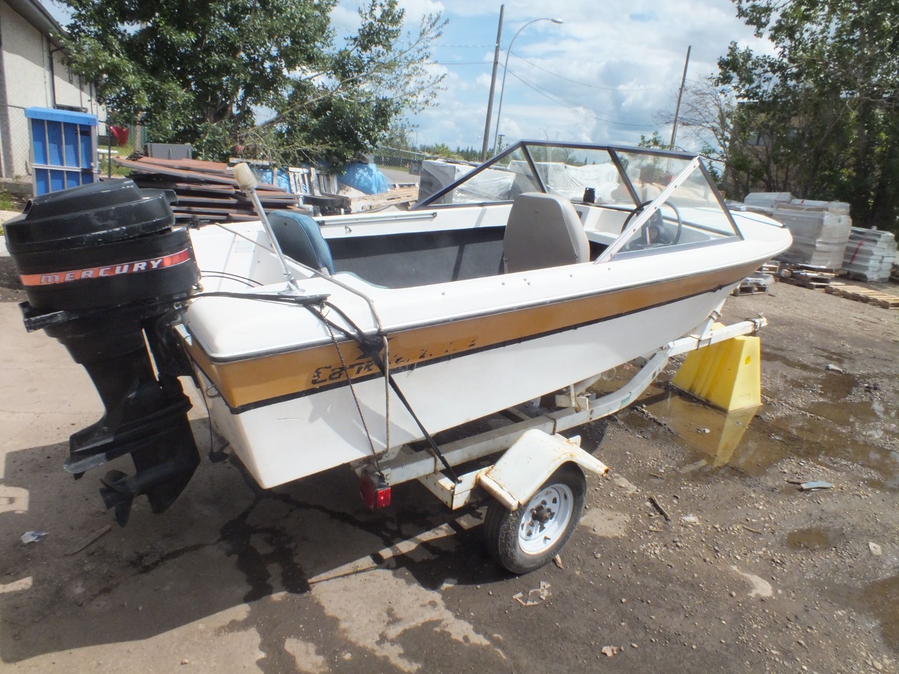 not sure on the model of this 14ft boat, has a new battery, comes with gas can, and has a mercury motor not in running condition, the trailer is stamped....used