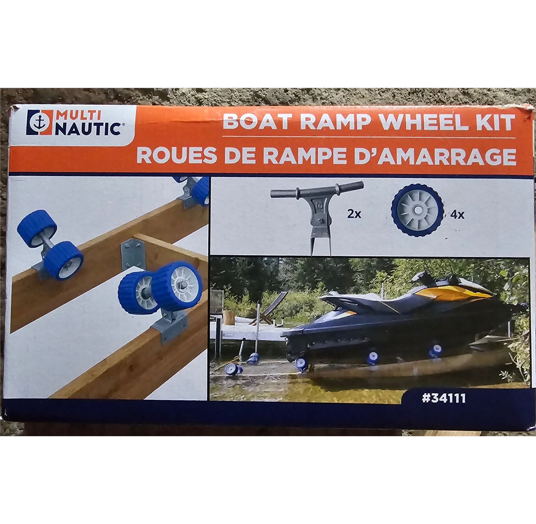 Durable wheel kit for boat ramps, includes 4 wheels and mounting hardware, item #34111, new. Perfect for aiding in the launch and retrieval of small boats.