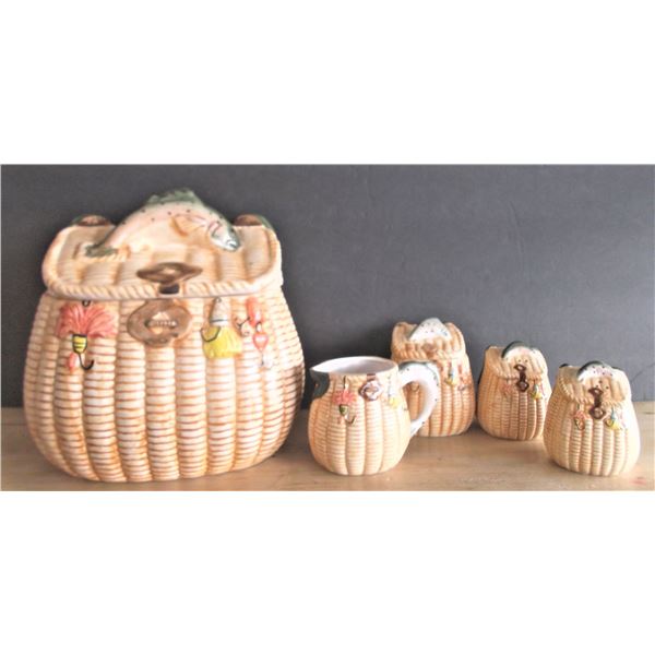 Fishing Creel Inspired Kitchen Set - Cookie Jar, Creamer, Sugar Bowl, Salt, and Pepper1011 - Fishing Creel Inspired Kitchen Set - Cookie Jar, Creamer, Sugar Bowl, Salt, and Pepper