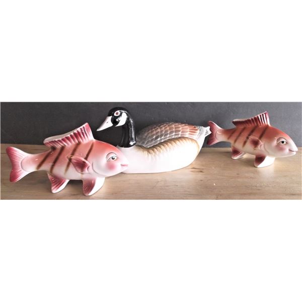 Porcelain Loon and Two Fish Planters/Vases - Loon has Damaged Tail1012 - Porcelain Loon and Two Fish Planters/Vases - Loon has Damaged Tail