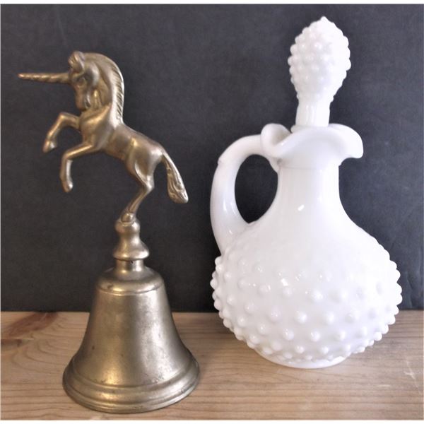 Brass Unicorn Bell and Avon Milk Glass1281 - Brass Unicorn Bell and Avon Milk Glass